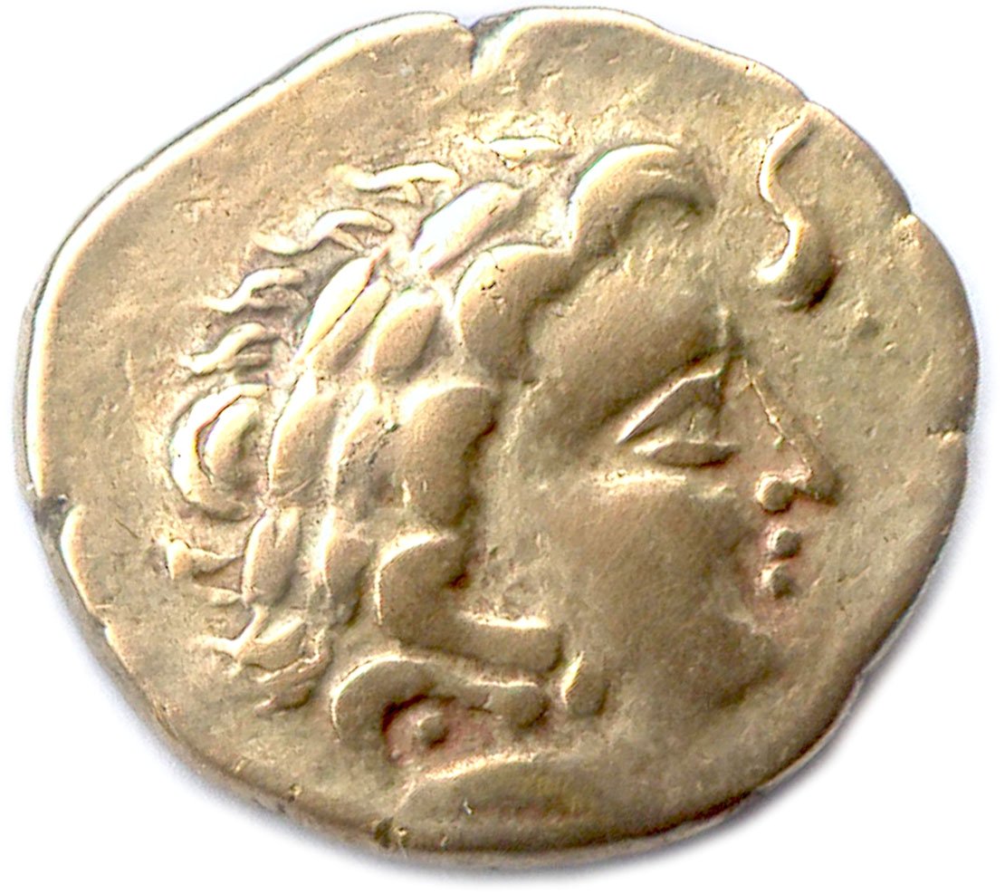 Tête laurée à droite, une mèche retombant sur le front et trois mèches revenant sur la joue et terminées par trois globules.
