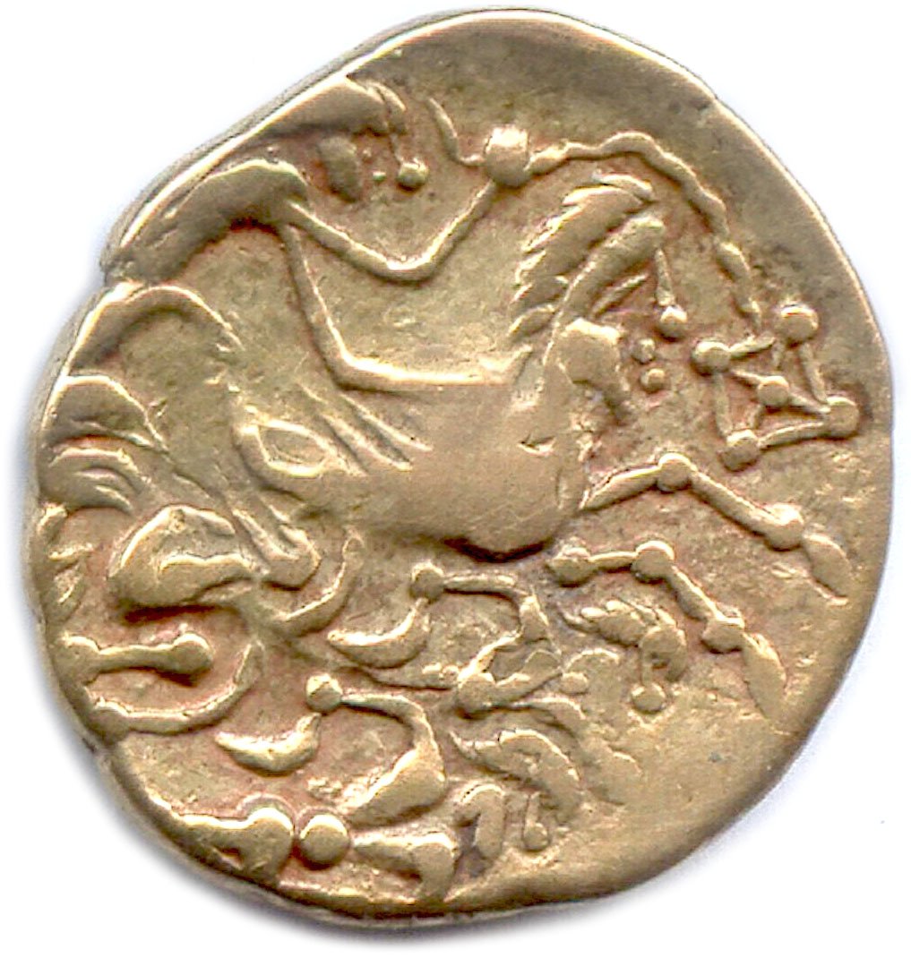 R/. Cheval androcéphale conduit à droite par un aurige tenant le vexillum. Dessous, deux guerriers armés couchés côte à côte.