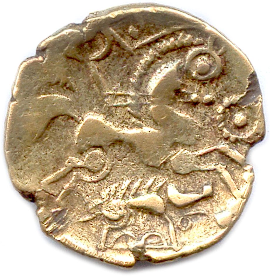 R/. Cheval conduit à droite par un aurige. Dessous, sanglier-enseigne. Devant, rouelle.