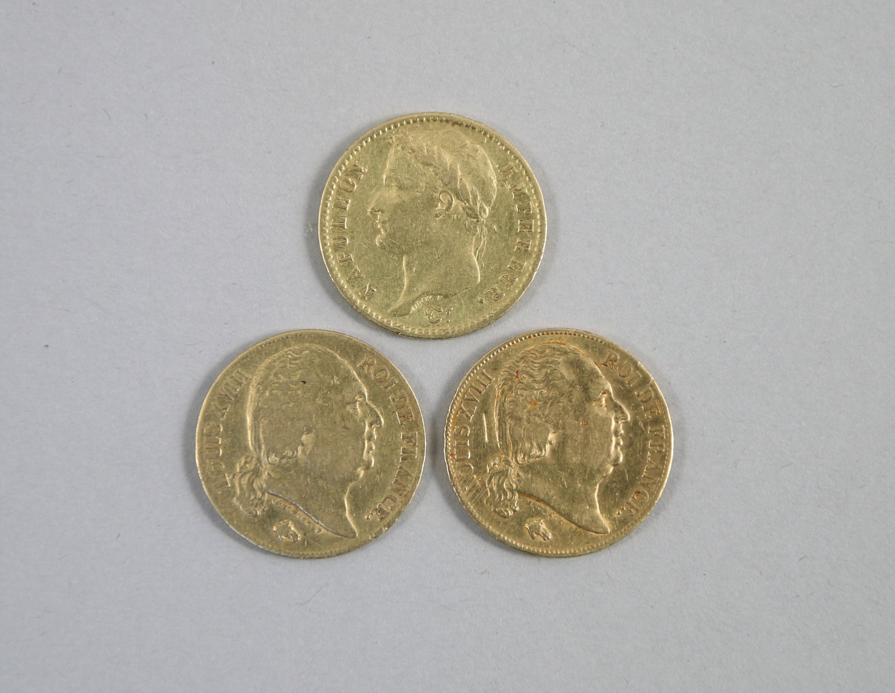 FRANCE. 3 x 20 F or Napoléon Ier lauré 1813, Louis XVIII (2) 1818, 1820.