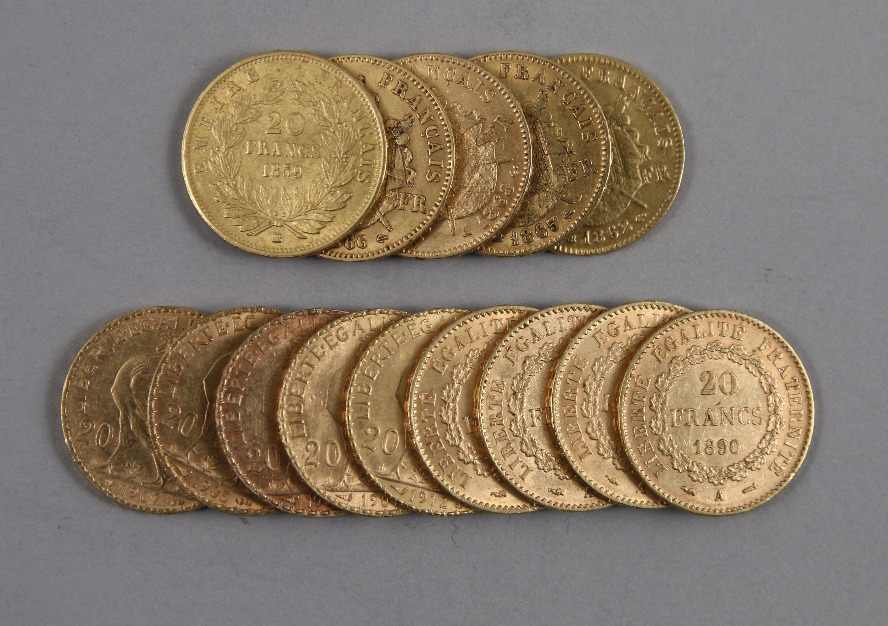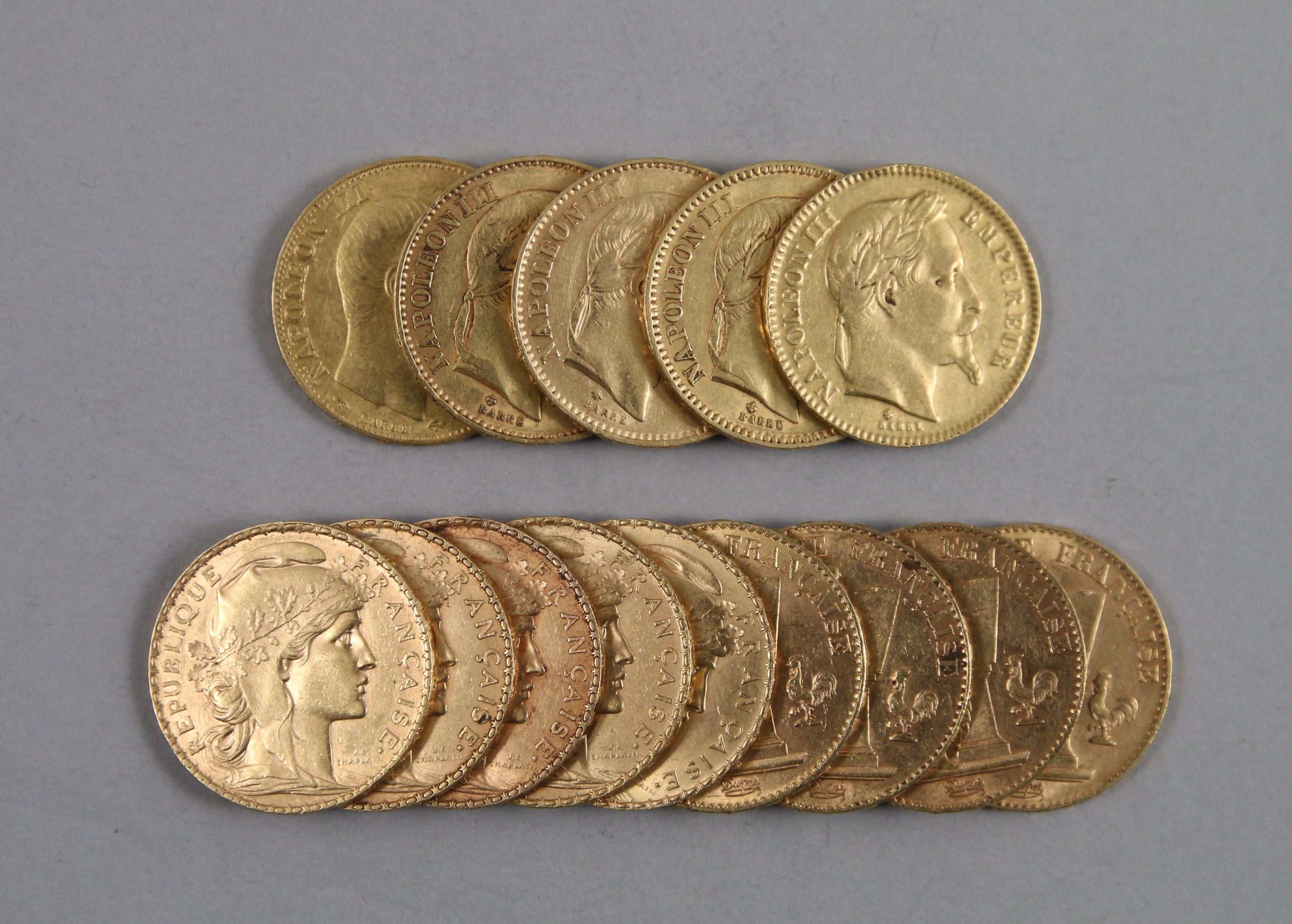 5 Napoléon III tête nue 1859 (1), tête laurée(4) 1862, 1865, 1866, 1868.