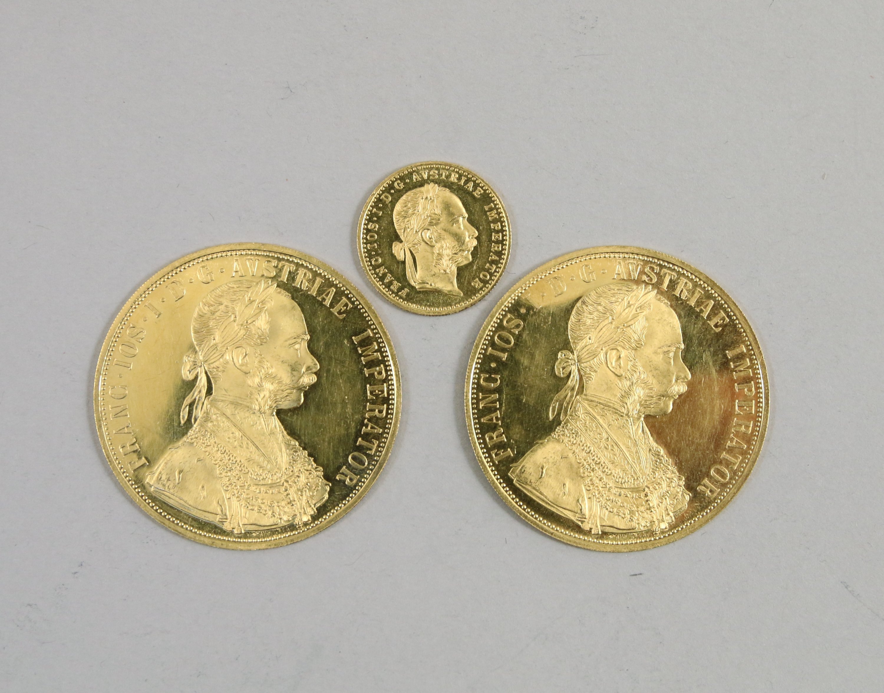AUTRICHE-HONGRIE. 3 Ducats or, frappes modernes François-JosephI, grand module (2), petit module (1), 1915.