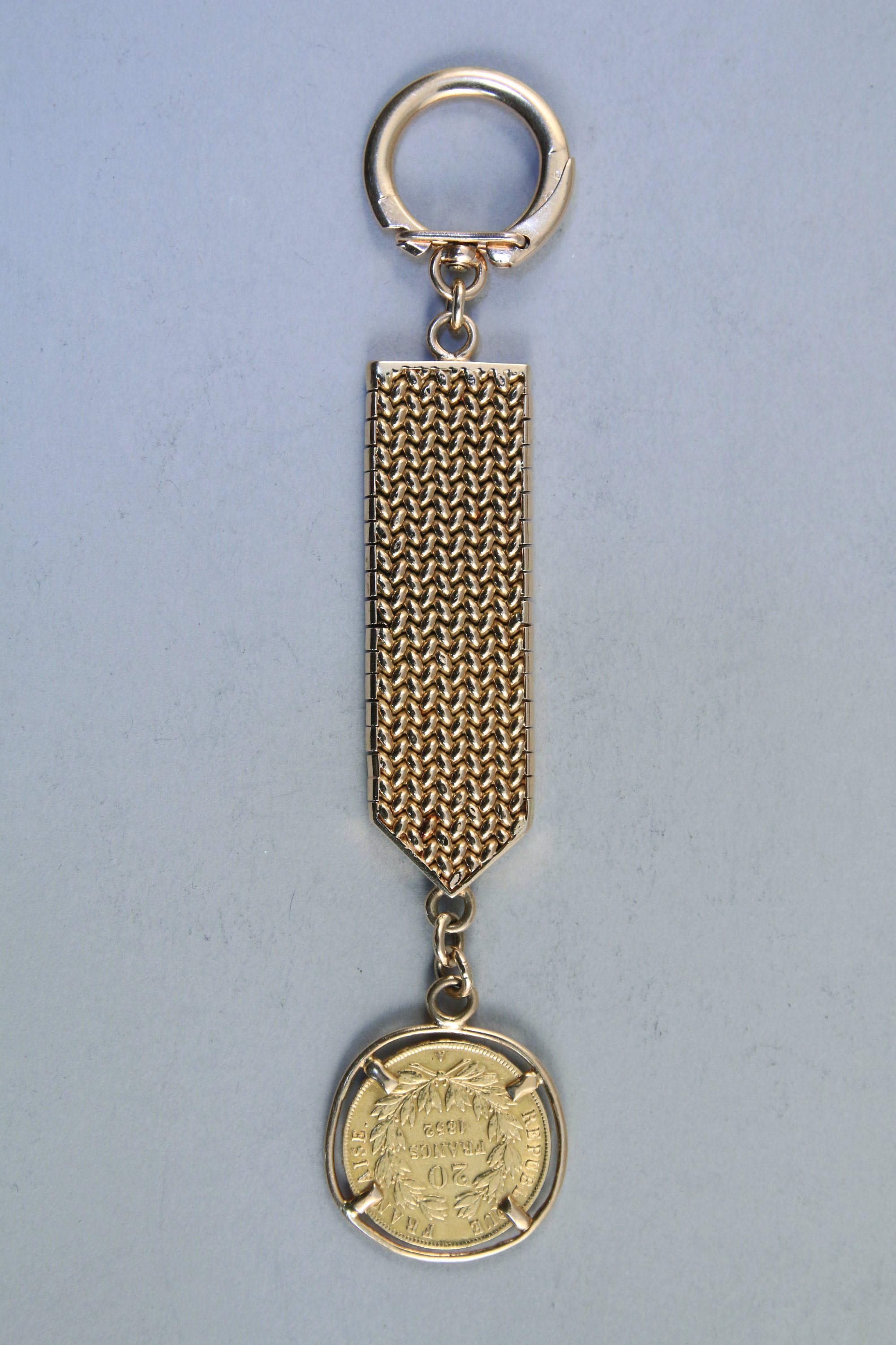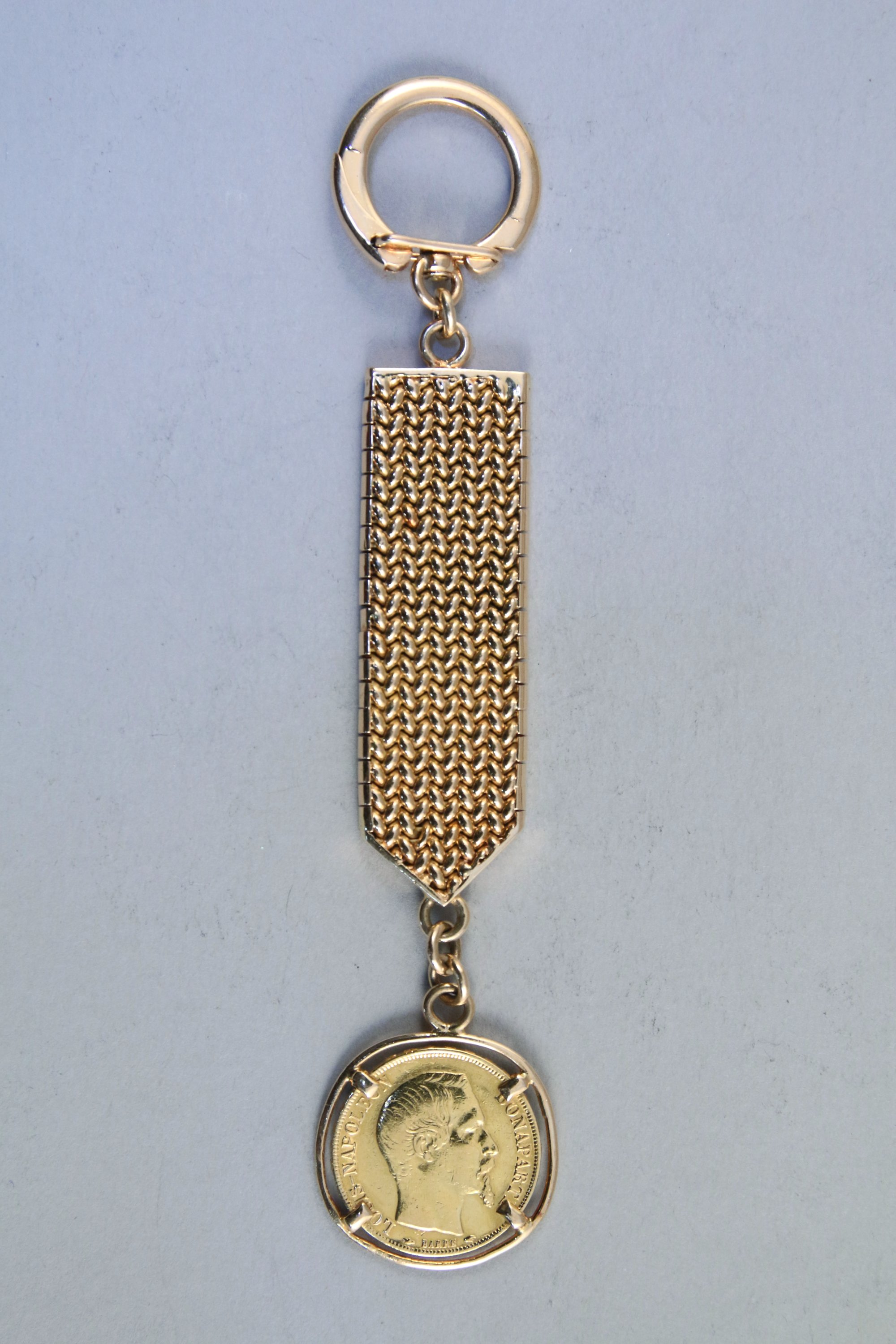 PORTE-CLÉ en or jaune 18K, orné en son centre d'une pièce de 20 FRANCS OR (Paris, 1852) figurant Napoléon III tête nue, retenu par une chainette à maille grains de riz.