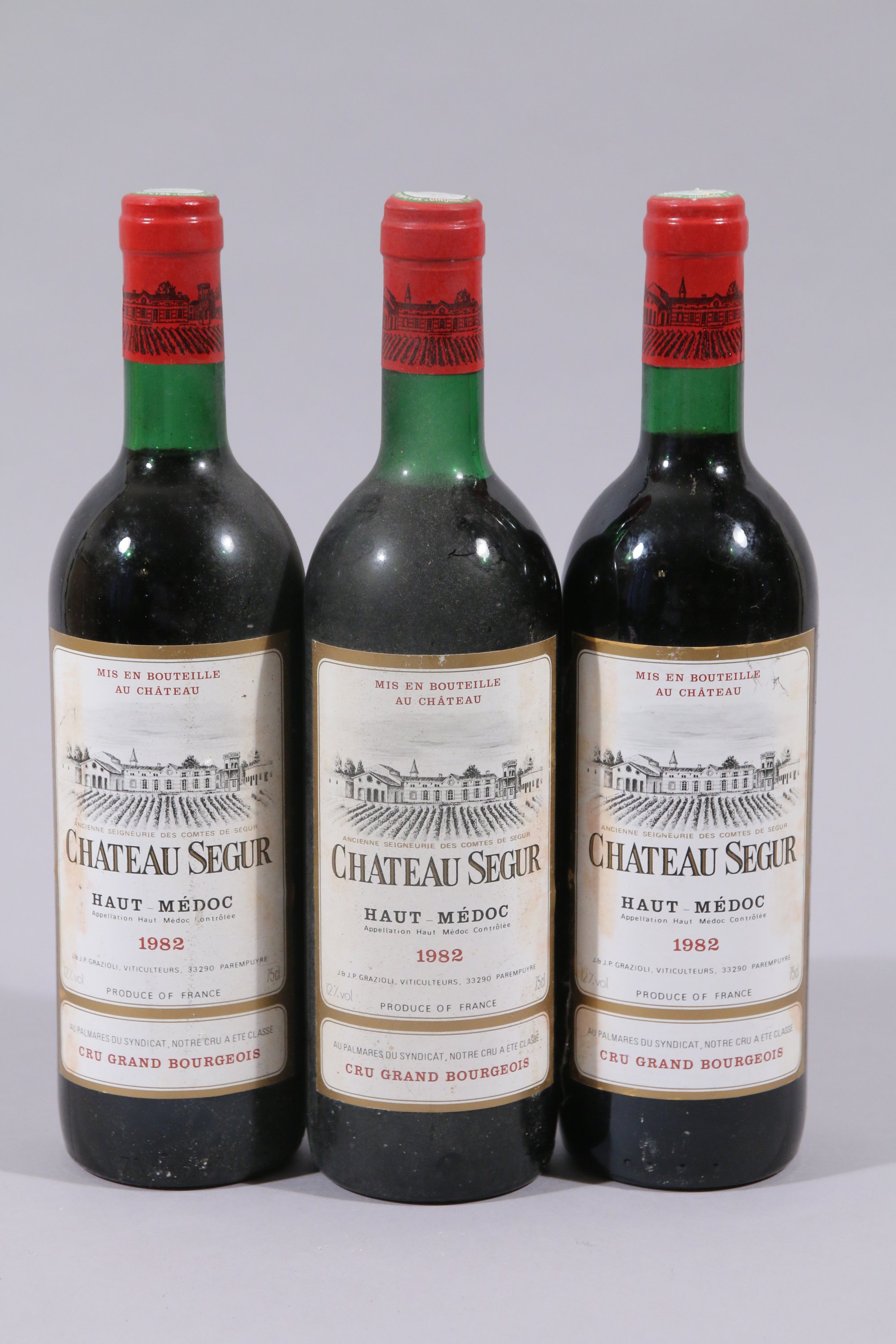HAUT-MÉDOC, Château Segur/Cru grand bourgeois, 1982, 3 bouteilles, BG / TLB / LB, étiquettes sales.