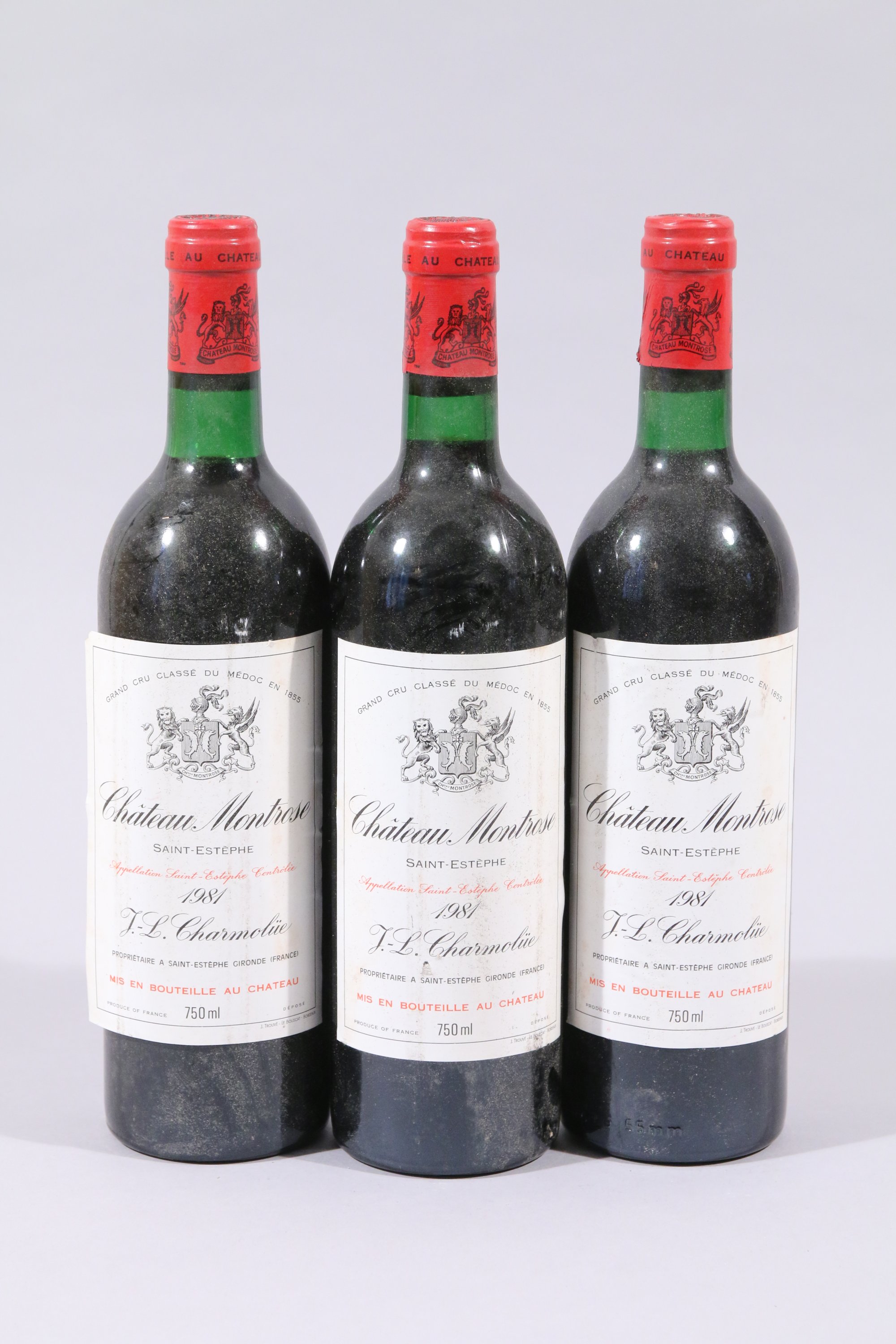SAINT-ESTÈPHE, Château Montrose/Grand Cru Classé, 1981, 3 bouteilles, BG / TLB, étiquettes abimées, une décollée.