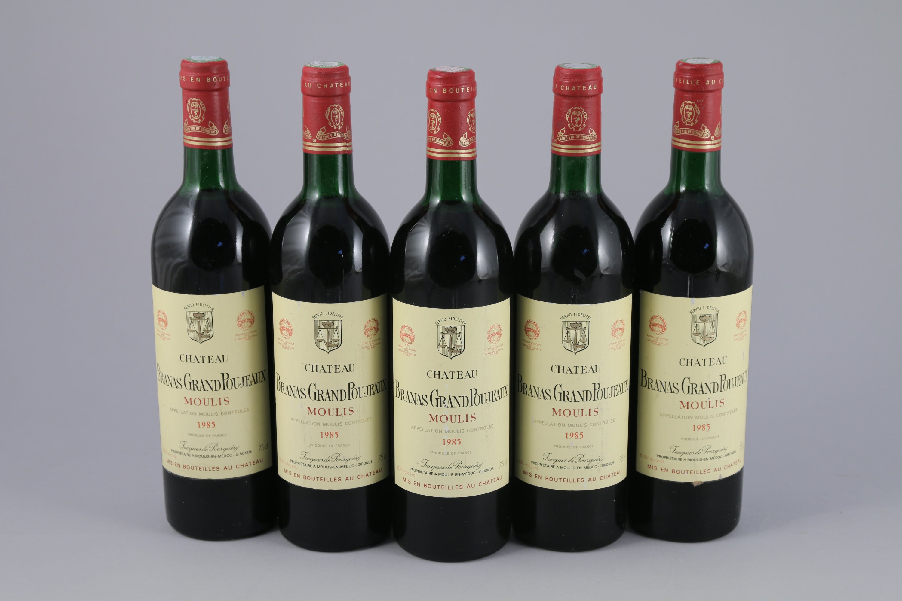 MOULIS, Château Branas Grand Poujeaux, 1985, 5 bouteilles, TLB et LB.