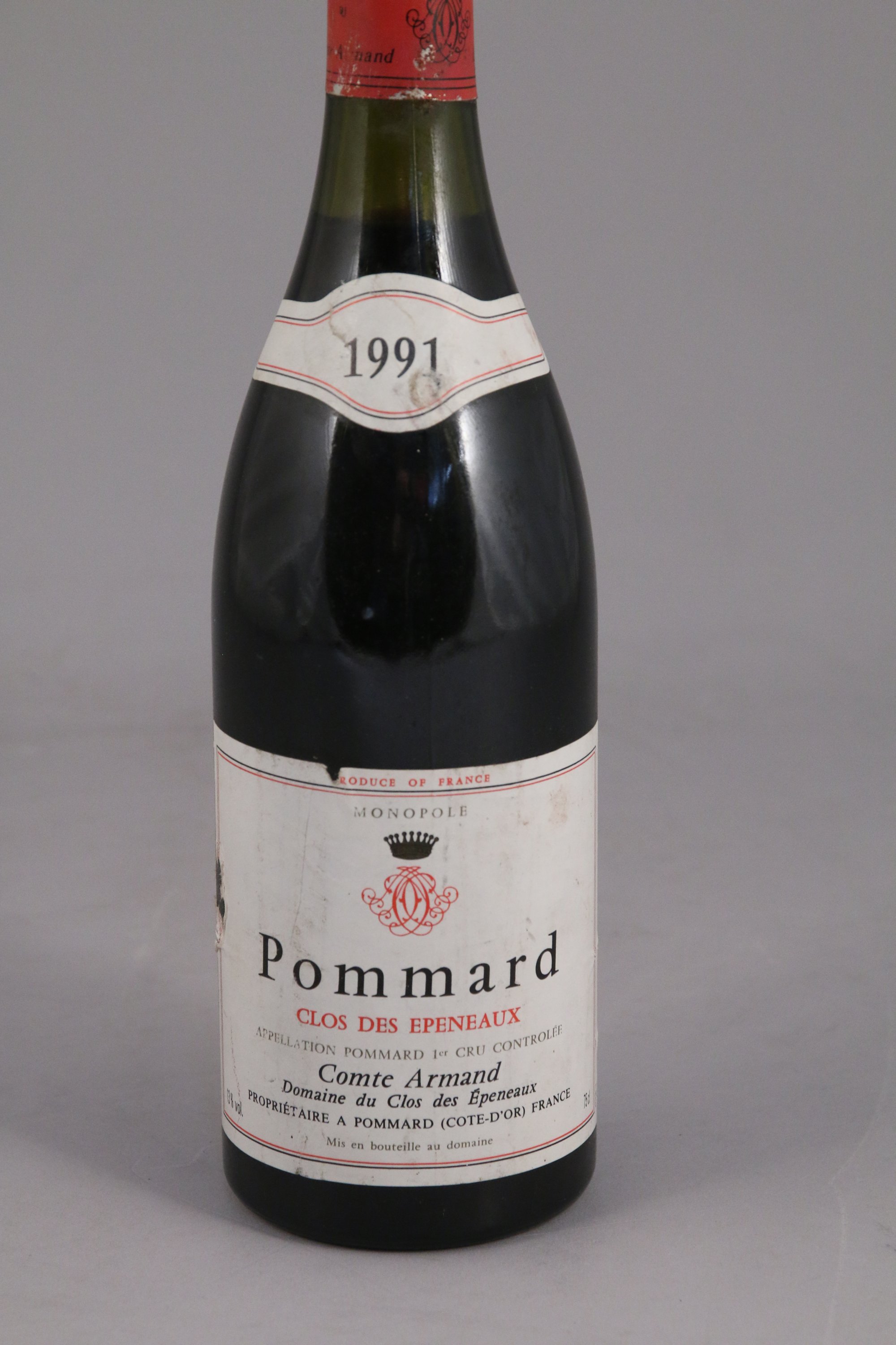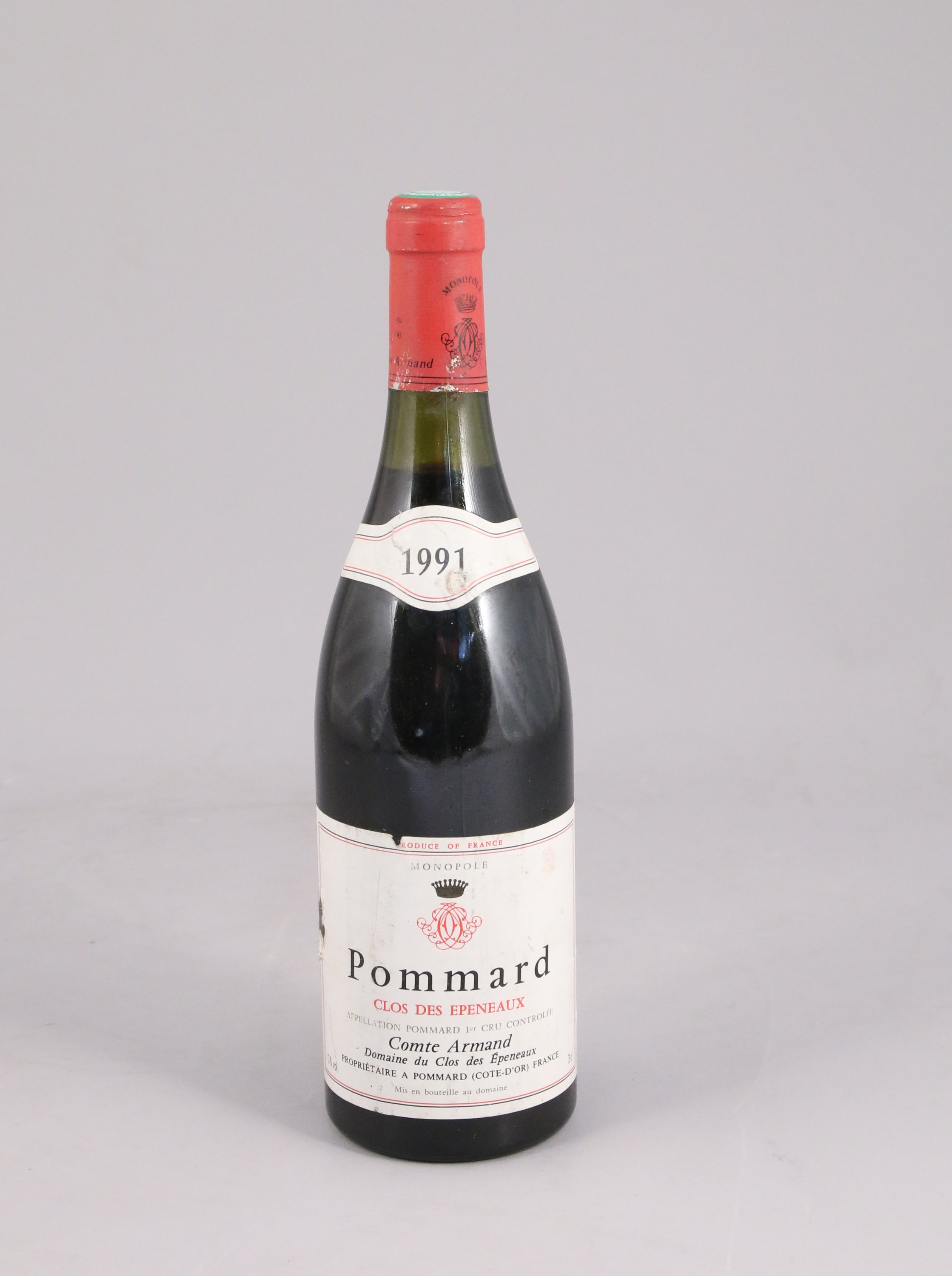 POMMARD, Clos des Epeneaux, Comte Armand, 1991, 1 bouteille, 2,5 cm, étiquette abimée.
