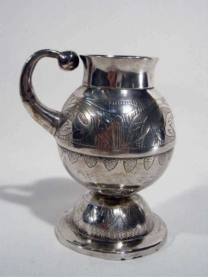 MATÉ en argent, à anse. Décor de feuillages, frise et feuilles d'eau. Piédouche à doucine. 10,5 cm. Poids: 140 g.