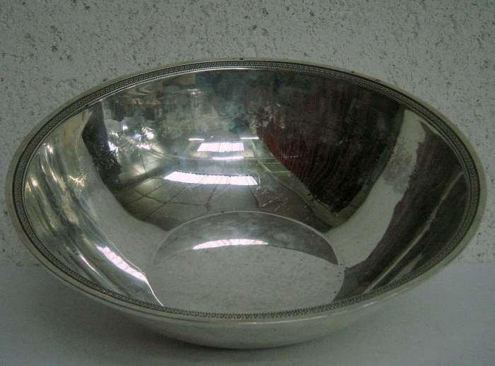 JATTE en argent. Décor de moulures de feuillages et perles. Époque Directoire, 1798-1809. Diamètre 25,5 cm. Hauteur 8,5 cm. Poids: 925 g.