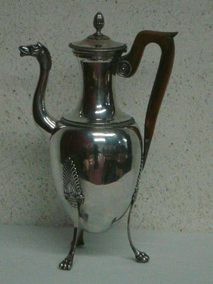 CAFETIÈRE TRIPODE à griffes en argent. Décor d'une bordure de godrons et de petites perles guillochées, ceinturée à mi-hauteur par une moulure de feuilles d'eau. Bec verseur à tête de cheval. Anse en bois. Prise de couvercle en bouton de fleur ovale sur macaron de pétales. Maître-orfèvre: Jacques-Victor Masson. Époque Empire, 1809-1819. Hauteur 37 cm. Poids: 1.185 g.