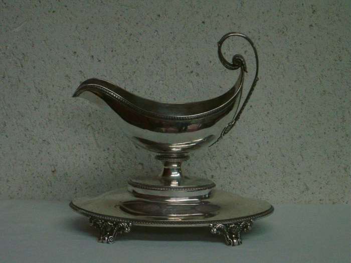 SAUCIÈRE CASQUE avec un PLATEAU en argent, sur quatre pieds...