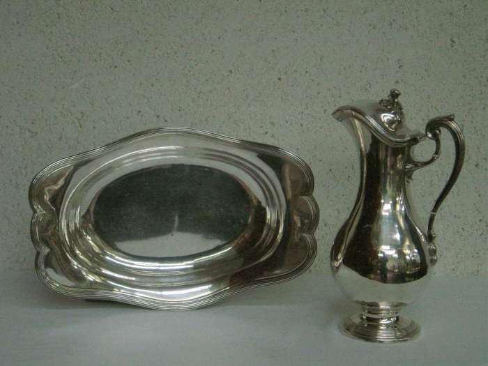 Rare et belle AIGUIÈRE et son BASSIN de forme ovale en argent. Décor d'une large moulure à filets contours. Anse en volute et feuillage. Prise de couvercle en fleur sur feuillage. Maître-orfèvre: Jean-Pierre Charpenat. Paris, 1787. Hauteur 28 ; longueur 34 cm. Poids: 1.720 g. (réparations à l'intérieur de l'aiguière).