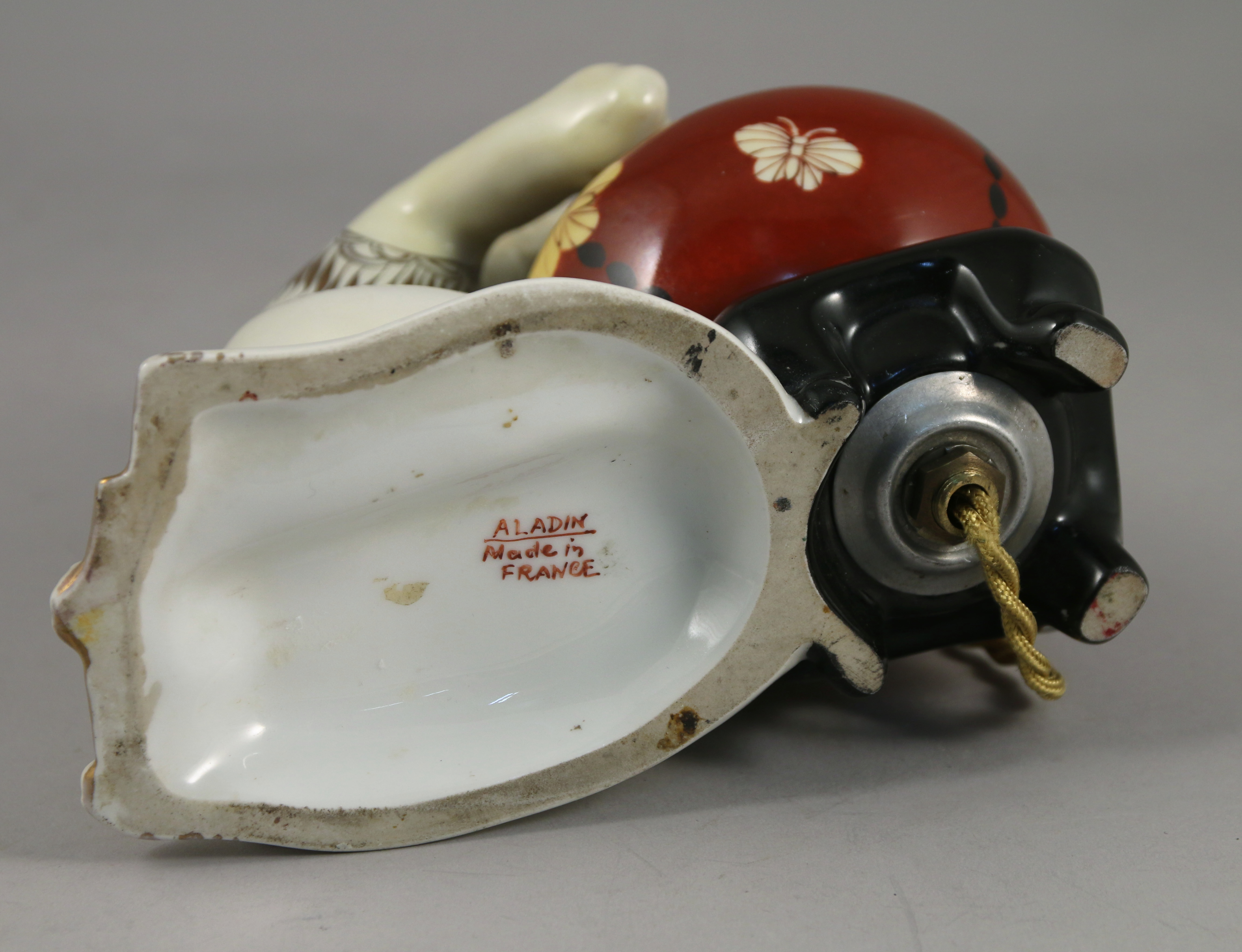 ALADIN. LAMPE VEILLEUSE en porcelaine figurant une femme accroupie les bras posés sur un vase à fond rouge à décor de papillons.
