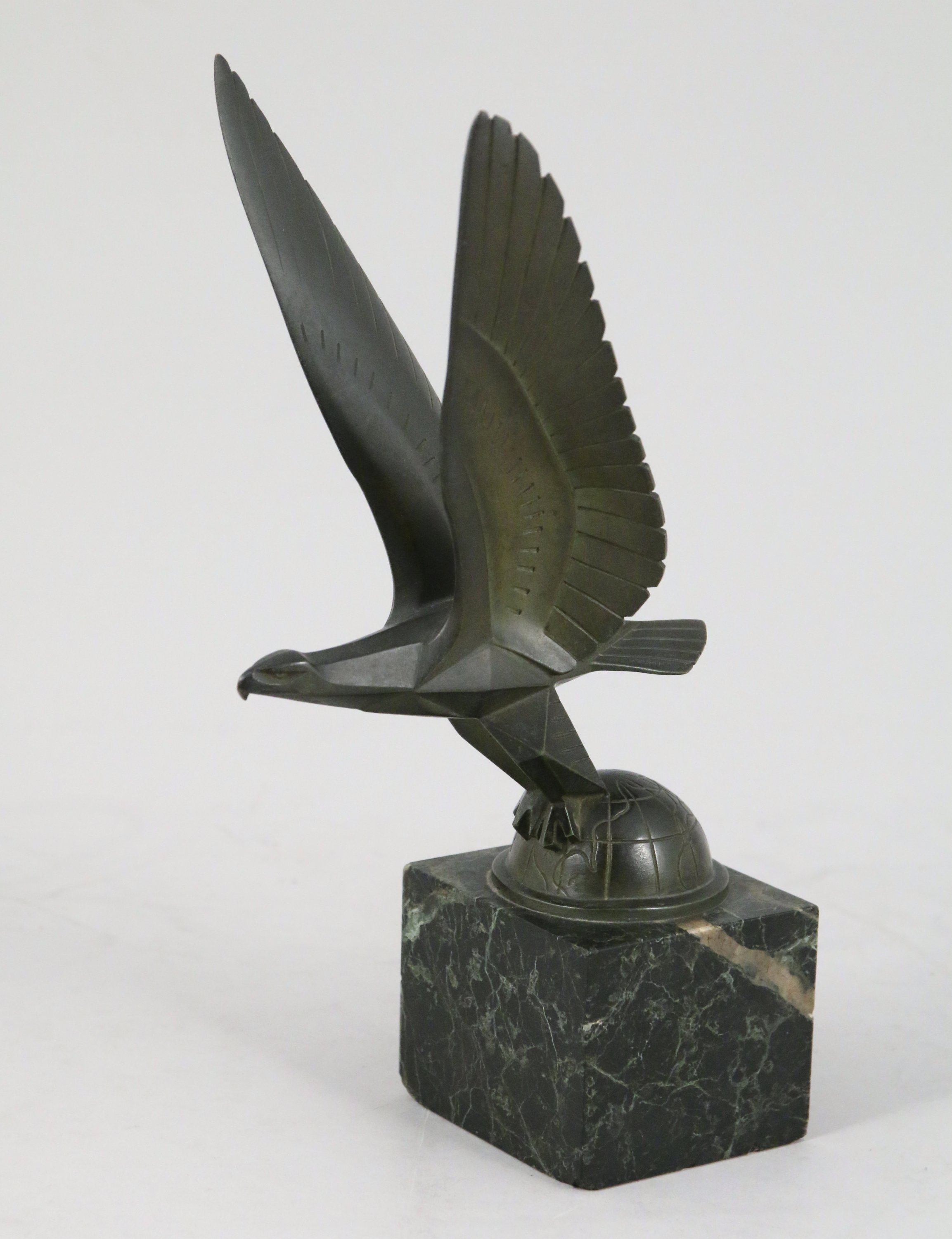 Aigle art déco aux ailes déployées, les serres sur un demi globe terrestre.