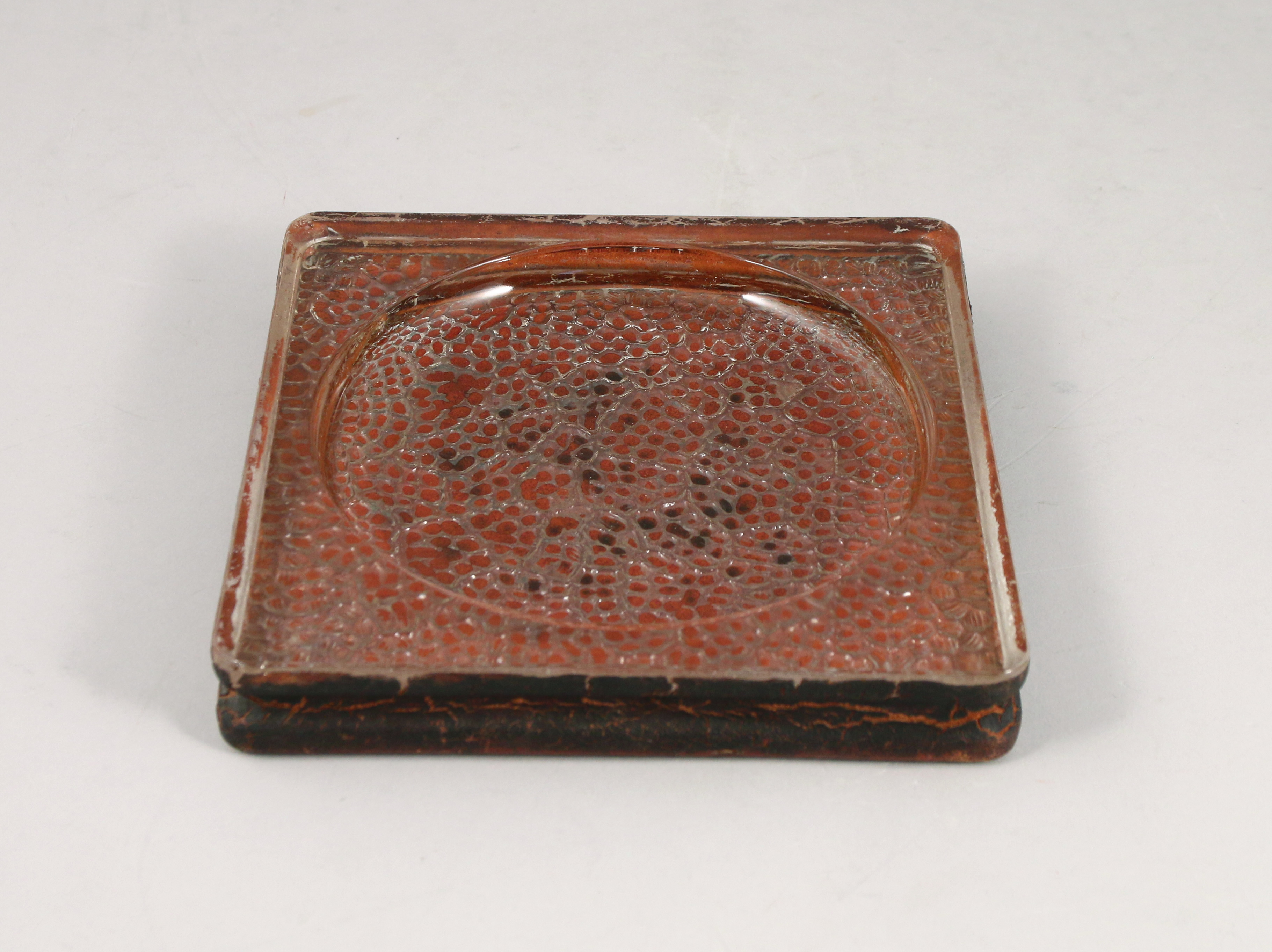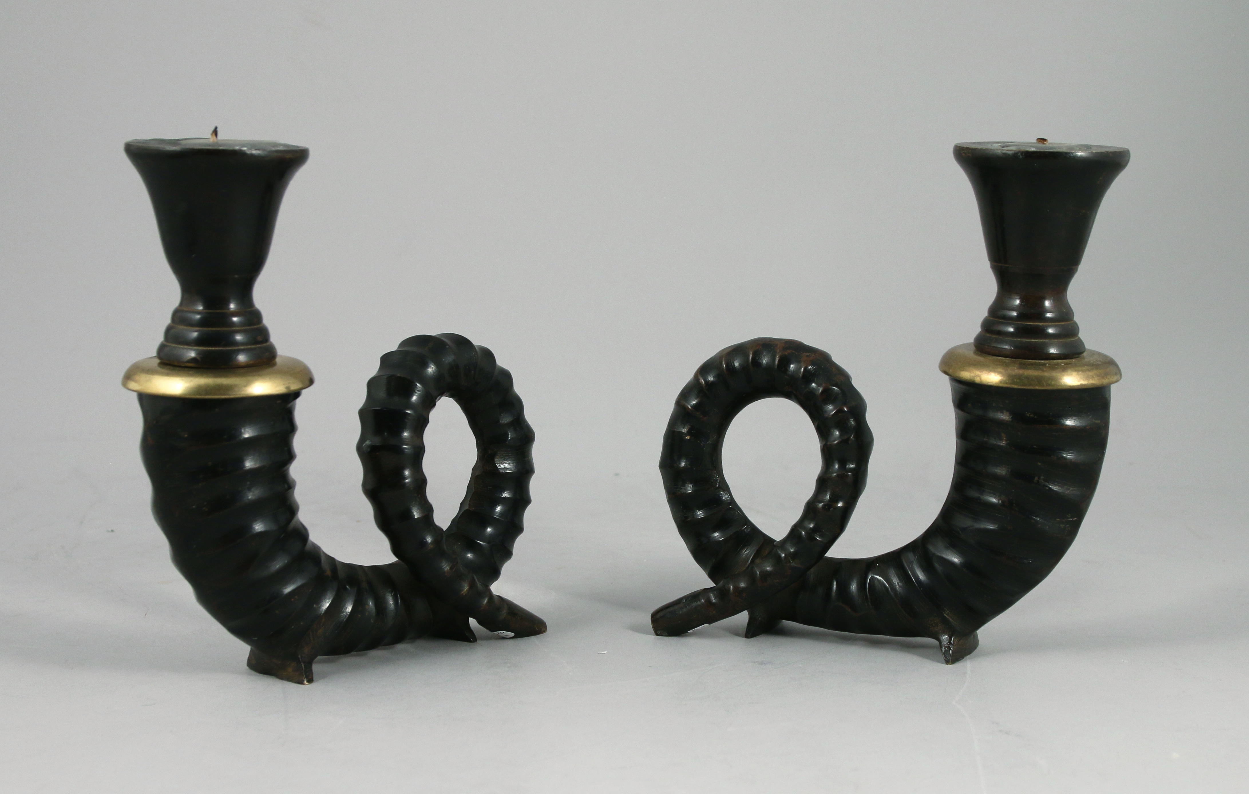 Paire de BOUGEOIRS aux CORNES de BOUQUETIN en bronze patîné (Haut. 19,5 cm) et un VIDE POCHE en verre foncé d'un cuir d'autruche (H. 3,5 L. 20, P. 20 cm).