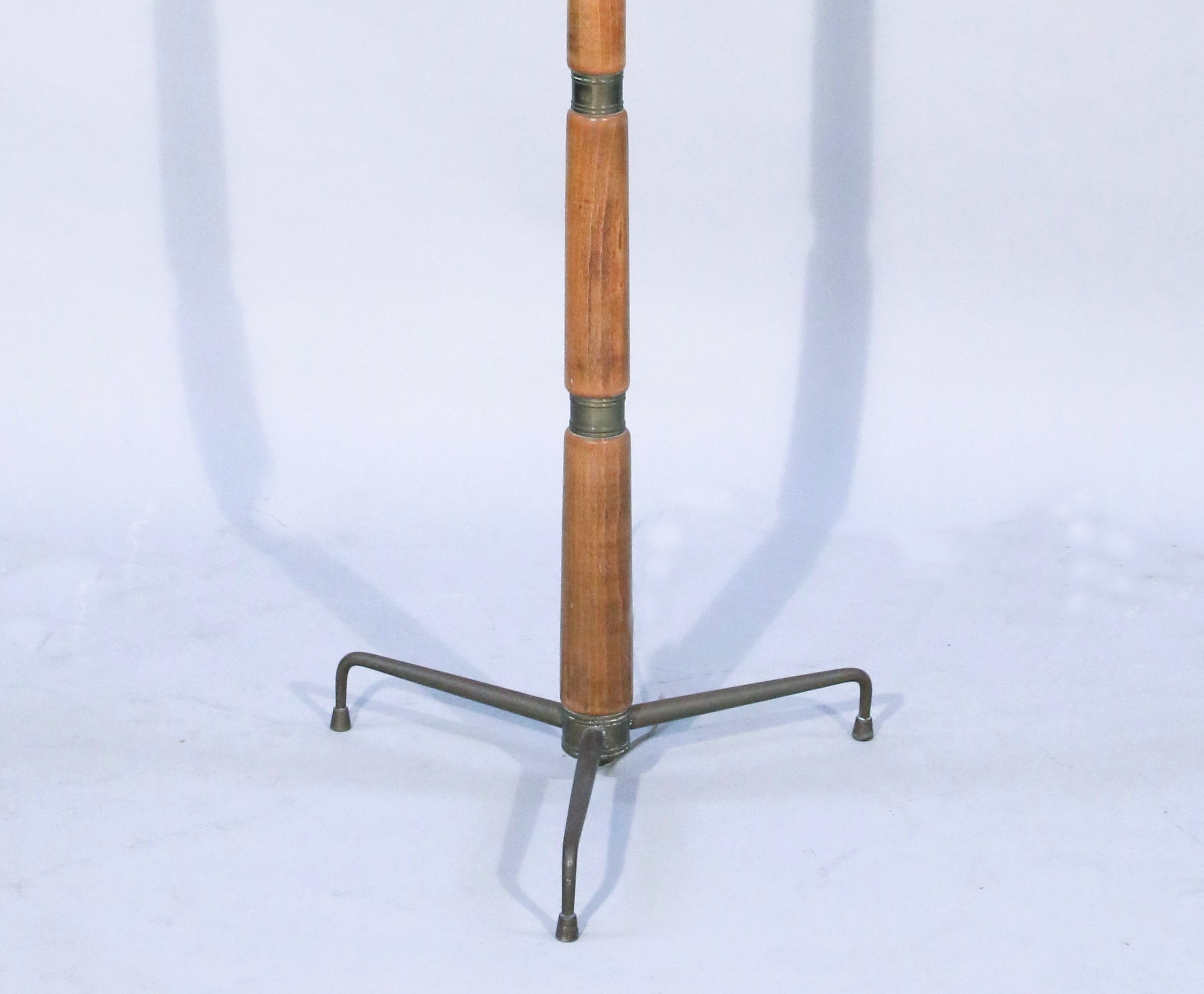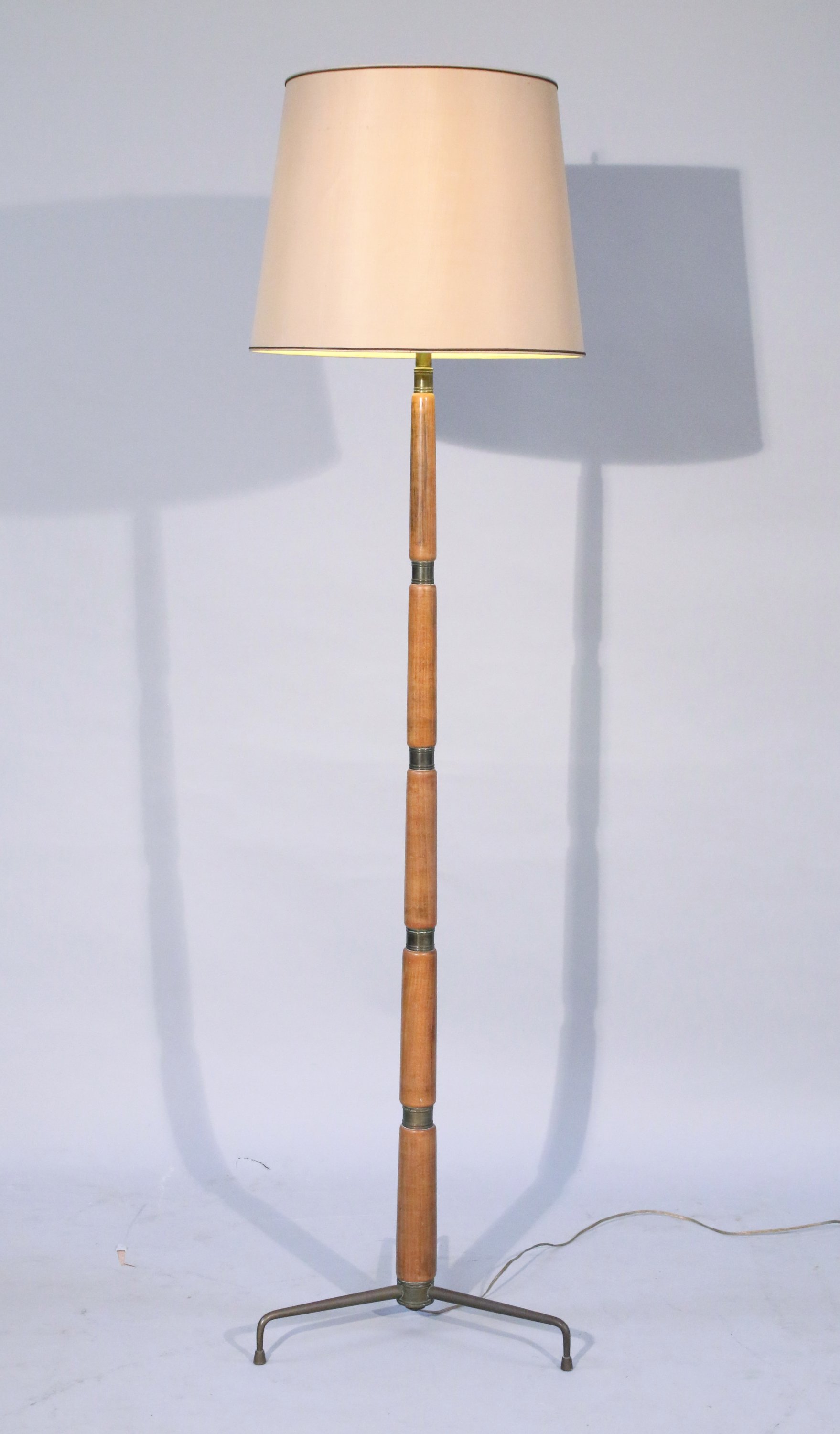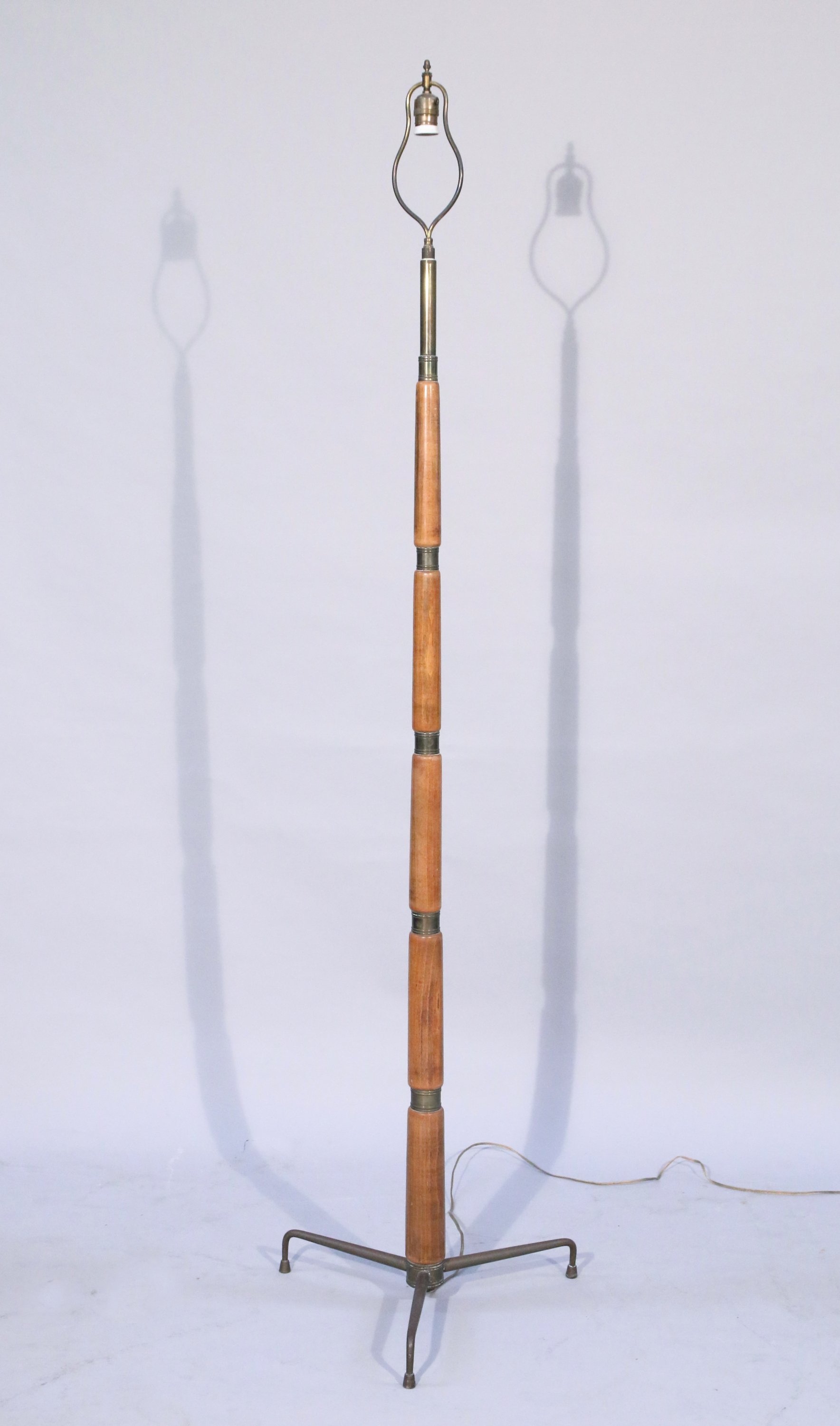 LAMPADAIRE tripode à décor de bagues alternant laiton et bois.