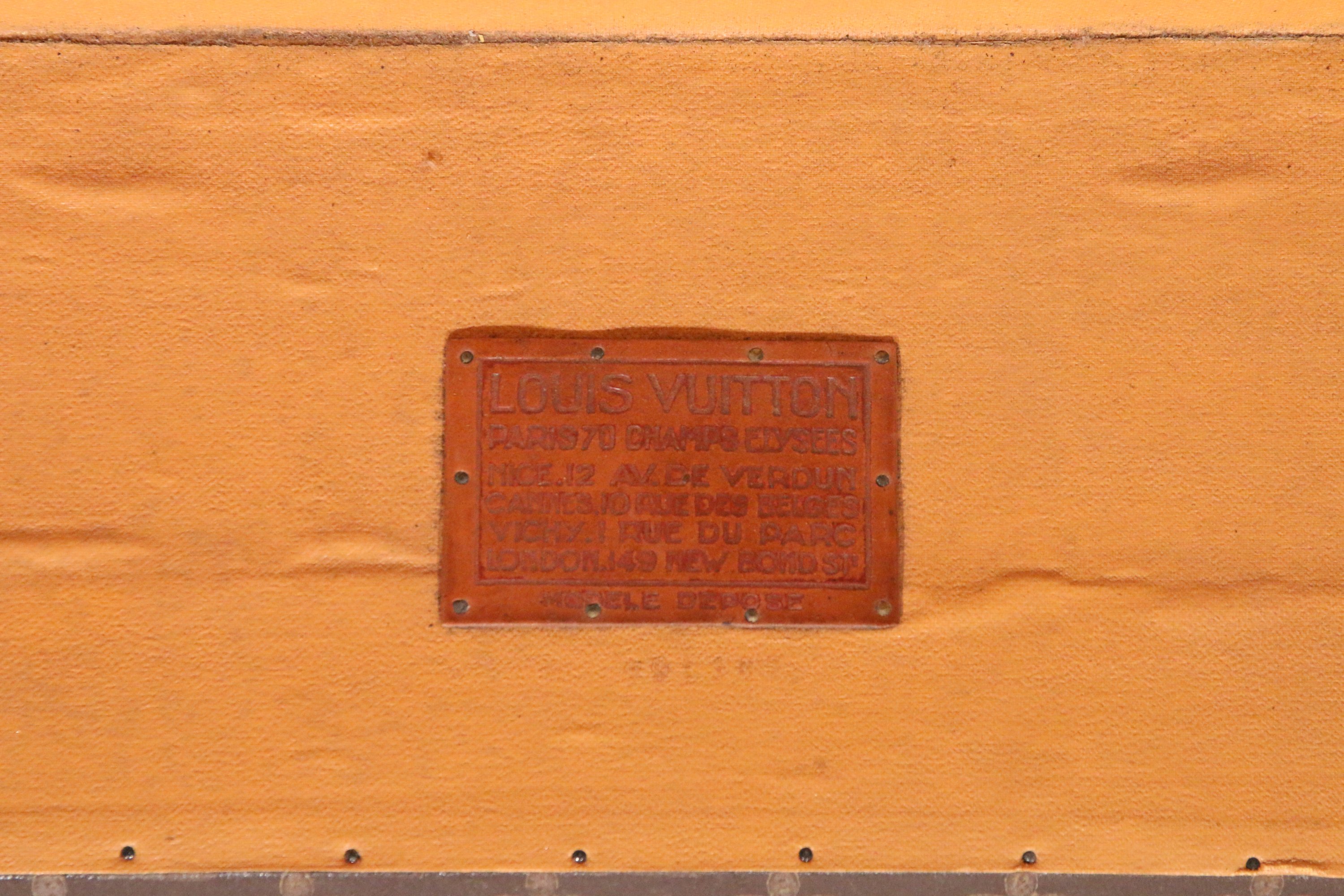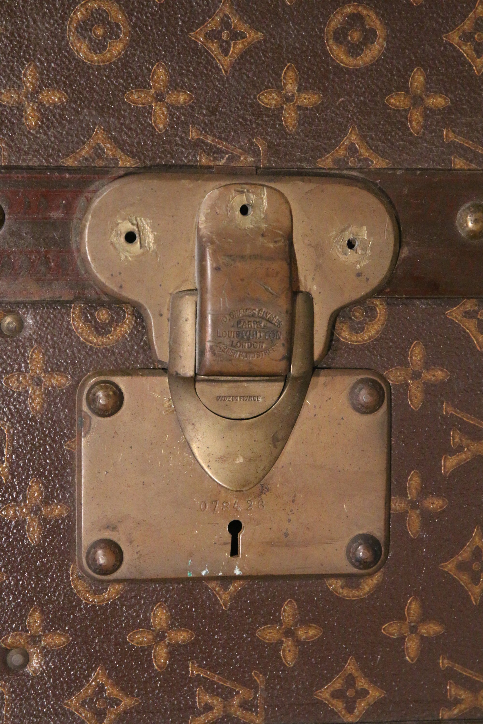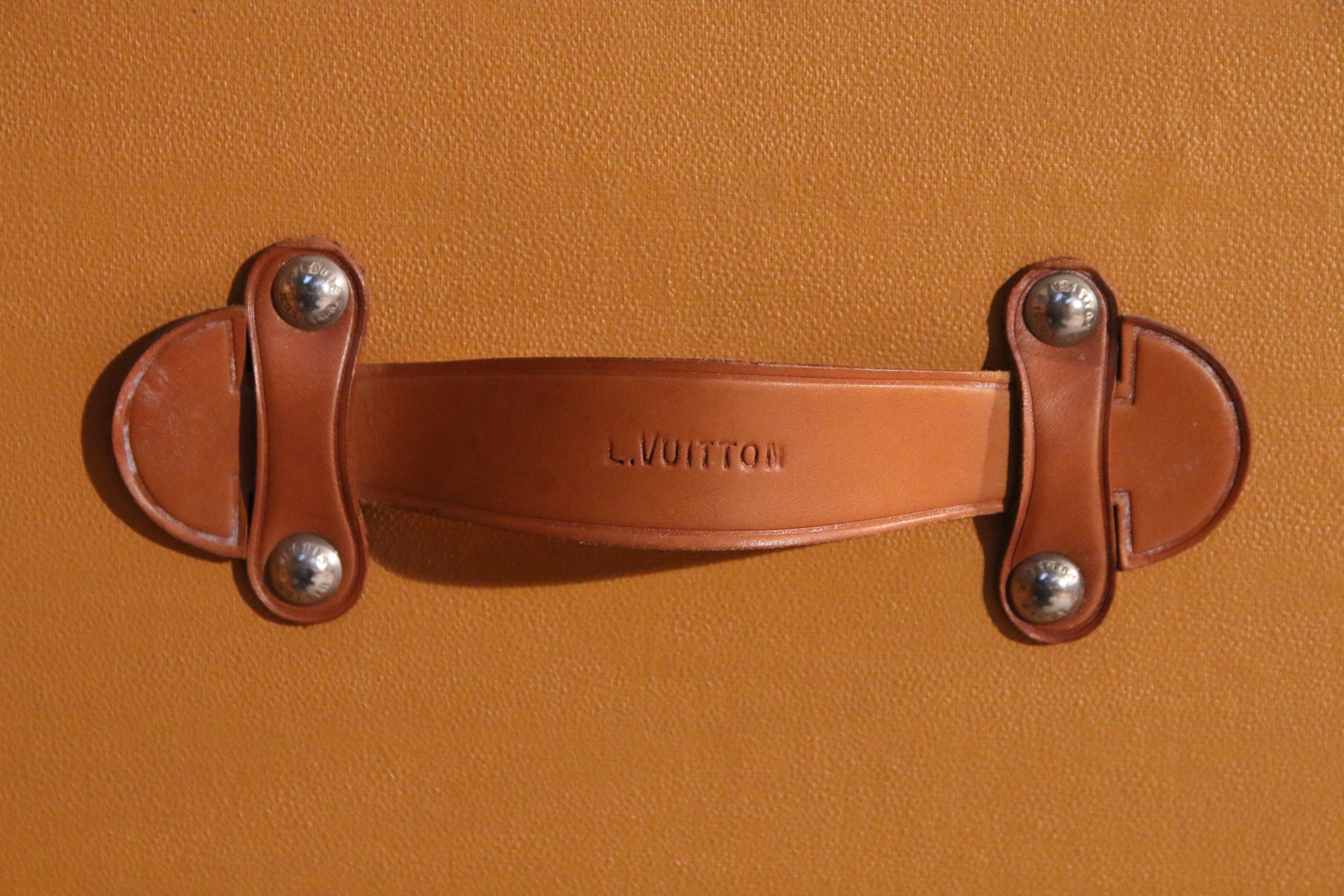 Coins en métal, poignées en cuir naturel, serrure en laiton N°078426, intérieur compartimenté. Six ceintres.