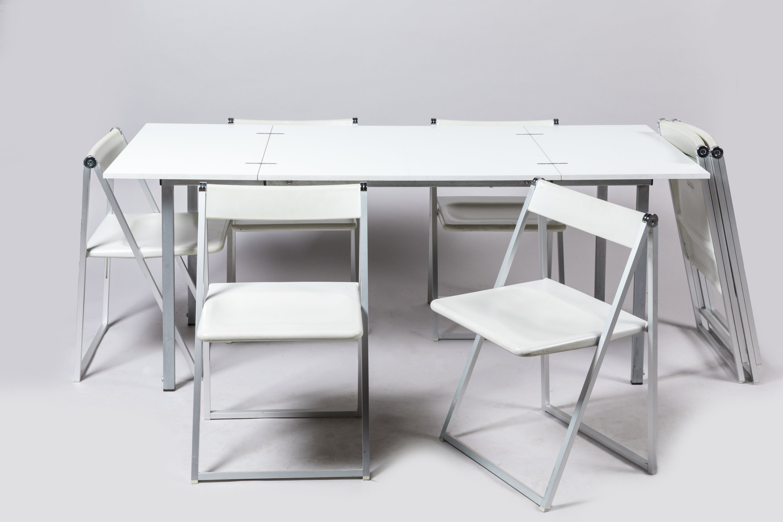- INTERLUBCKE. Sept CHAISES pliables, piétement métallique, assise et dossier en plastique moulé blanc. Signées. Haut. 76, Larg. 48, Long. 44 cm.