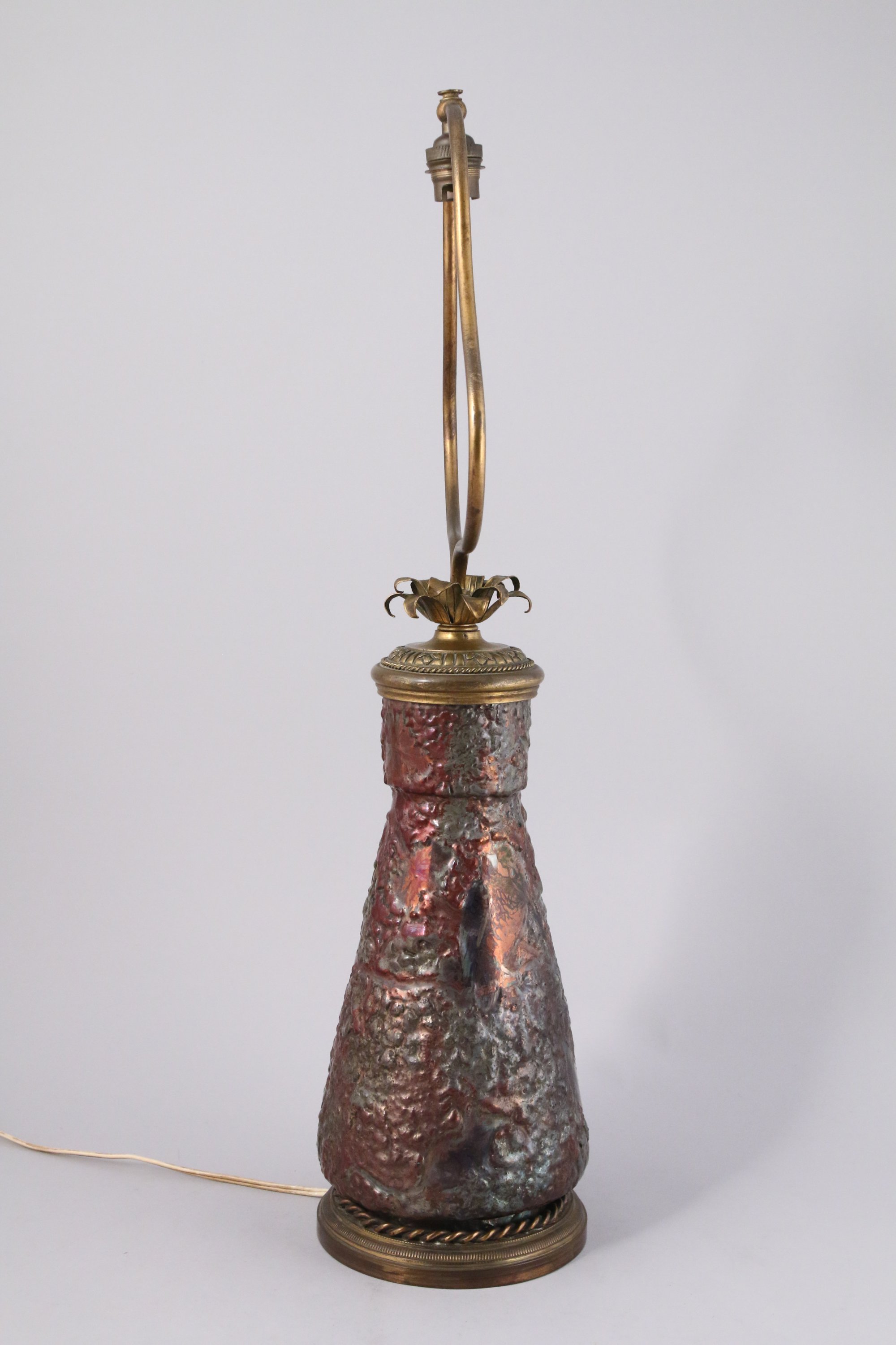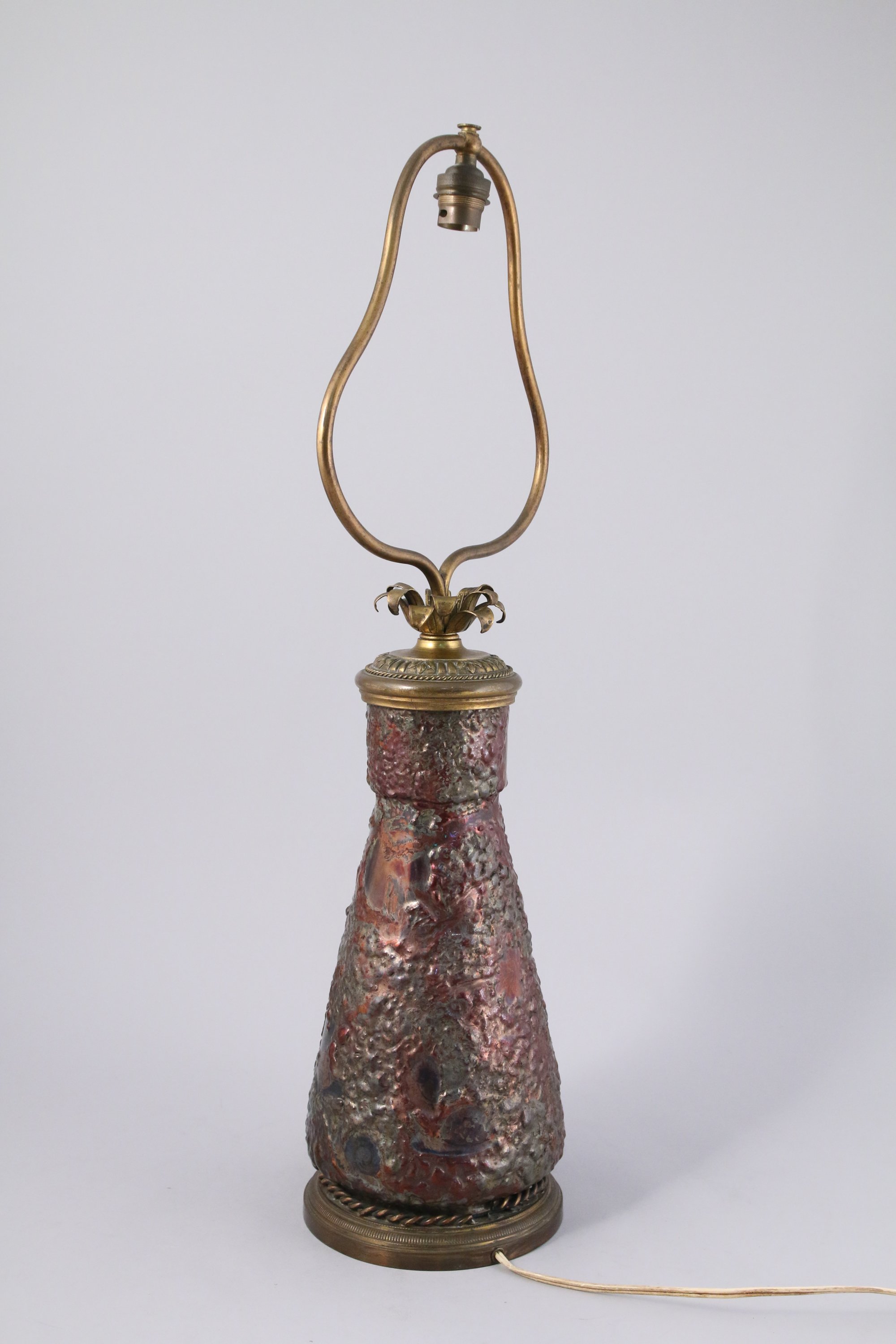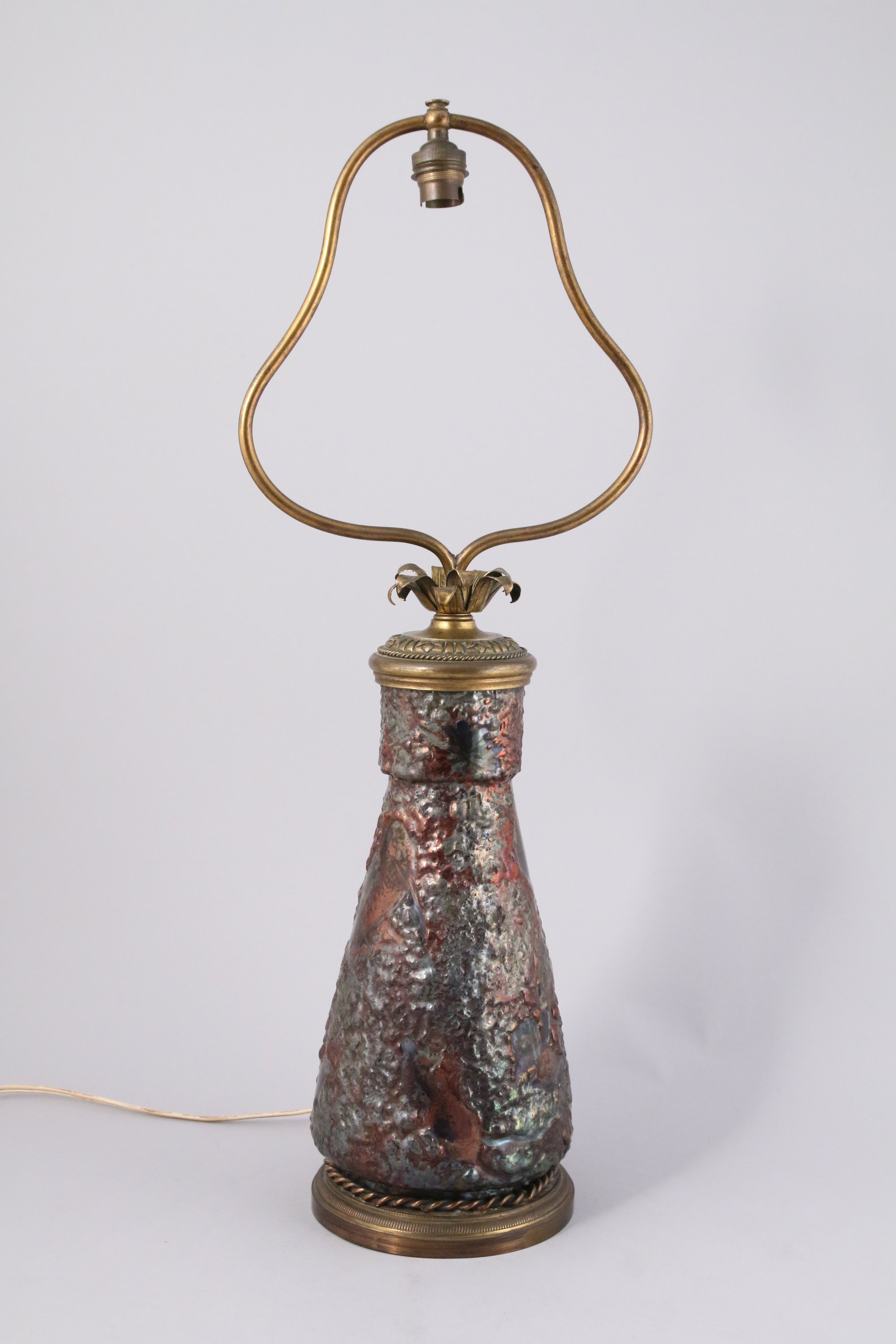 à décor d'animaux tels qu'escargots, carpes, souris et oiseaux. Monture pour l'électrification en laiton et bronze proche de la production de la maison Charles, coiffée de feuilles d'ananas surplombant deux frises, la première alternant feuillages et denticules, la seconde de treillages.