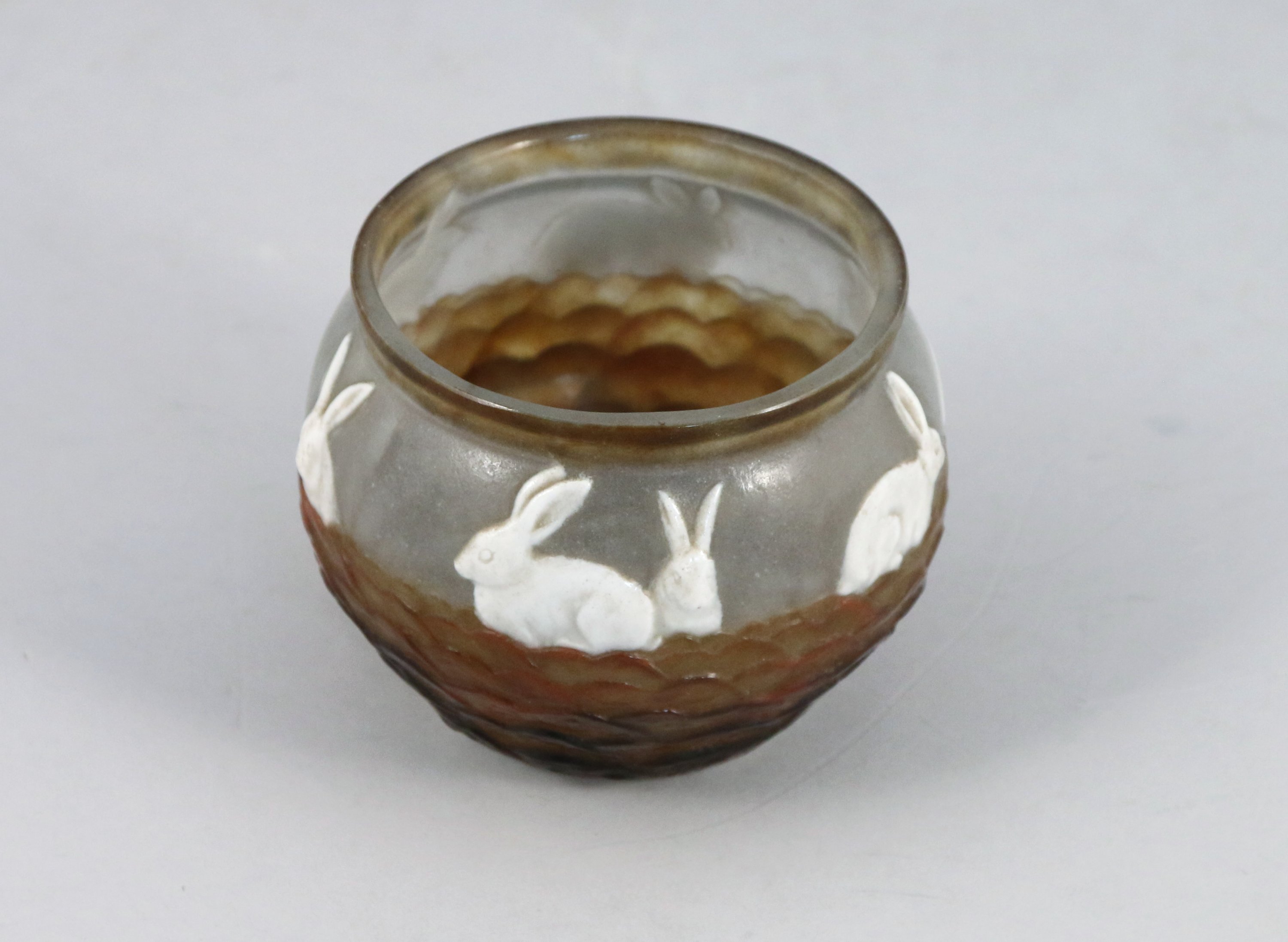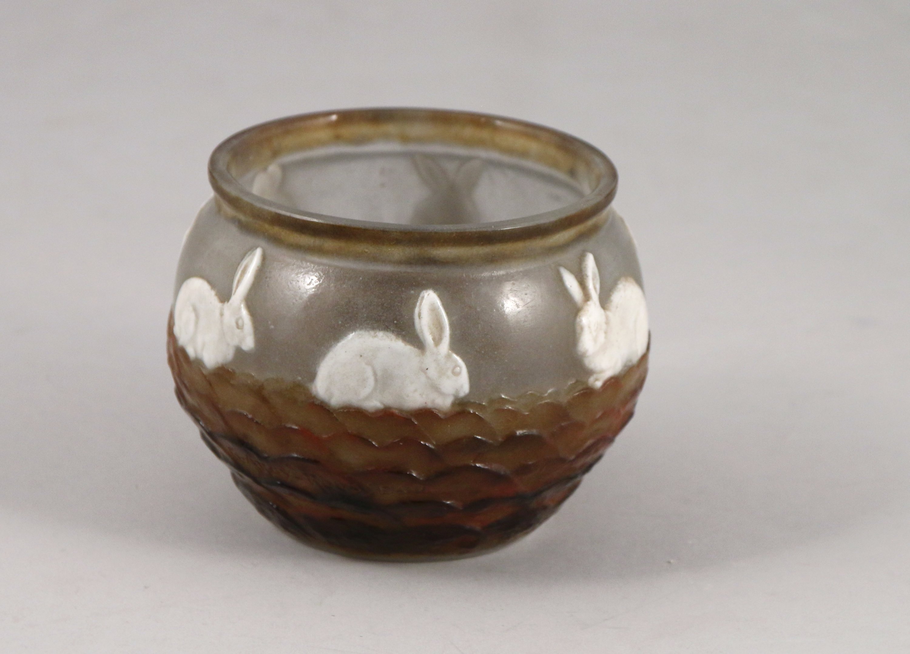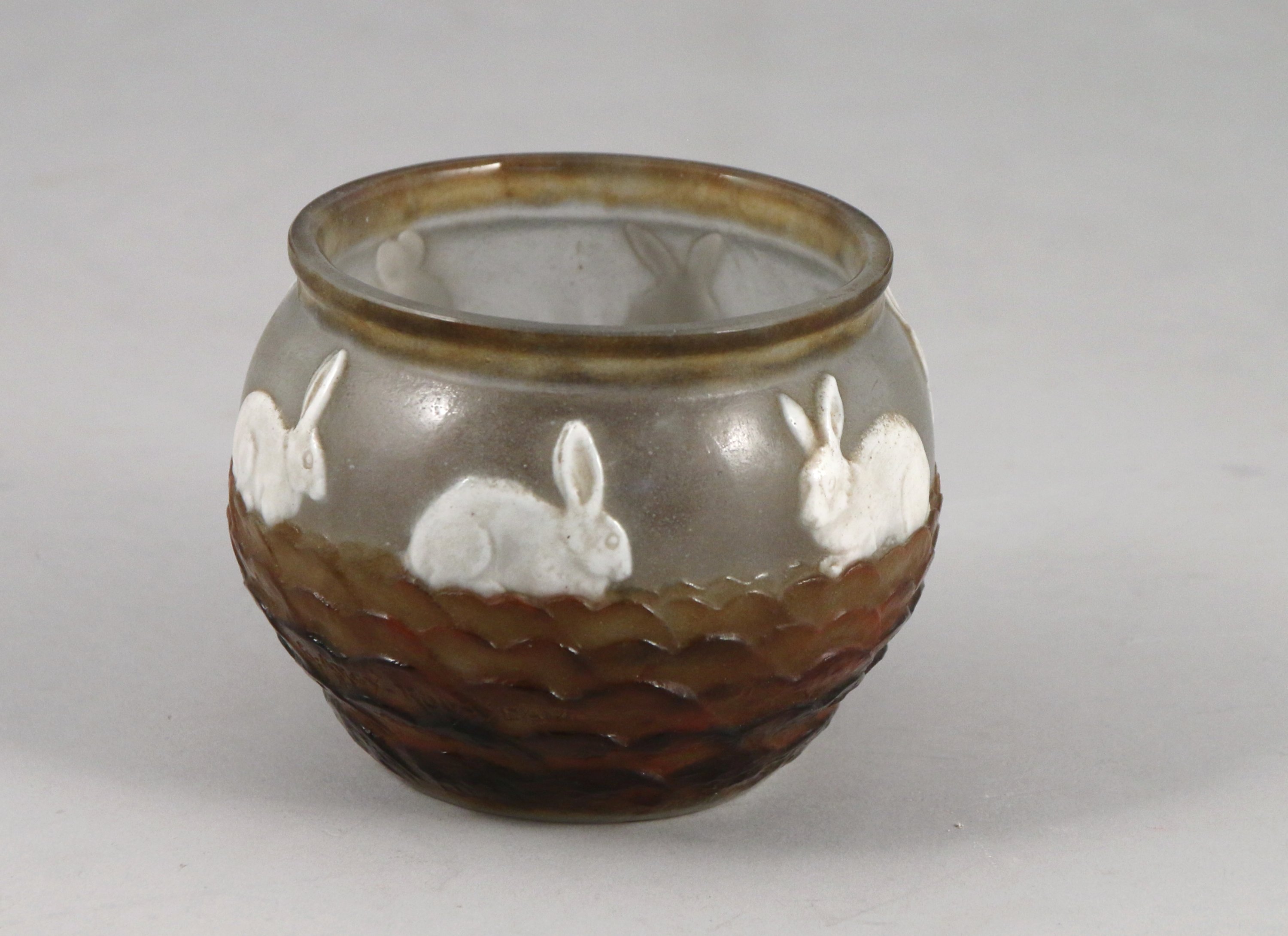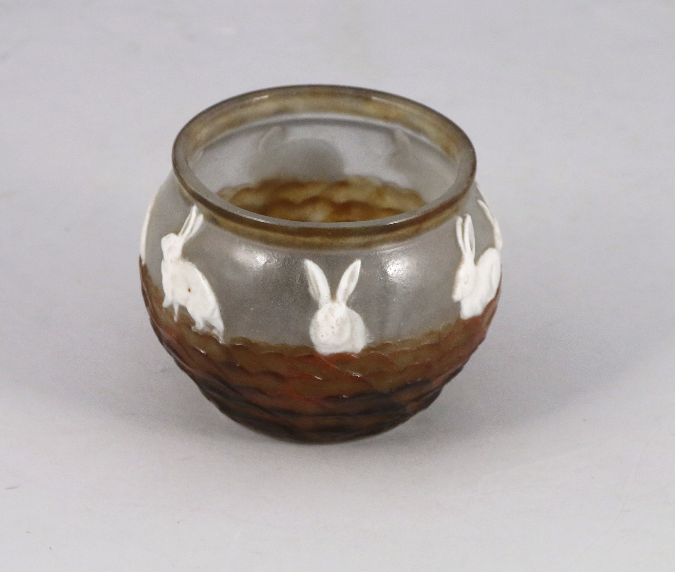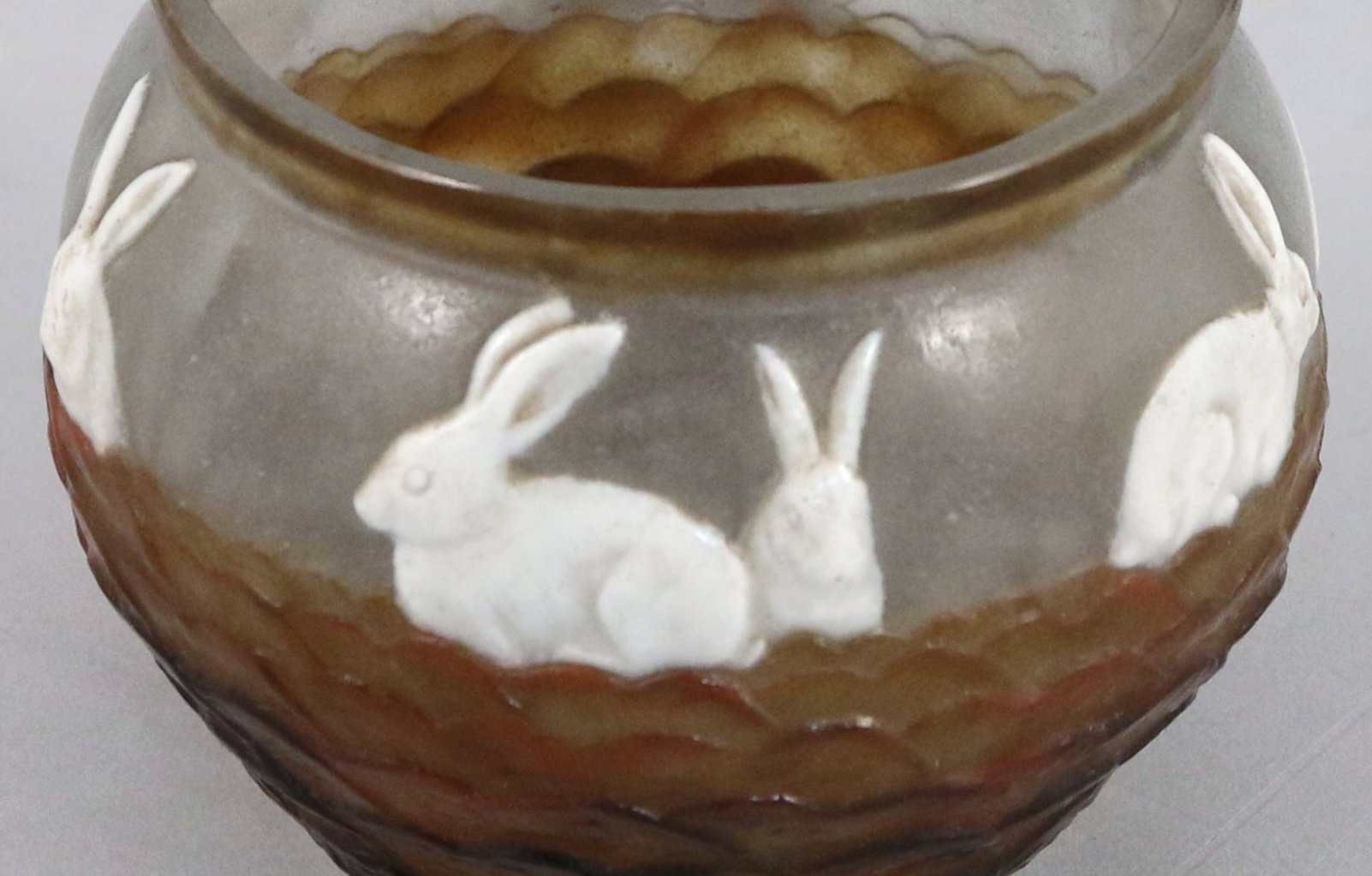 En 1932 le krach boursier ralentit la production artistique parisienne. Au 10, rue Cail à Paris, Rousseau produit désormais pratiquement seul parmi ses uvres les plus subtiles et les plus appréciées des collectionneurs. En témoigne la coupe " Quiétude " que nous présentons datant de cette époque. Ce modèle aux lapins existe en au moins trois couleurs, après une version bleue et une version mauve préalablement dispersées aux enchères.
