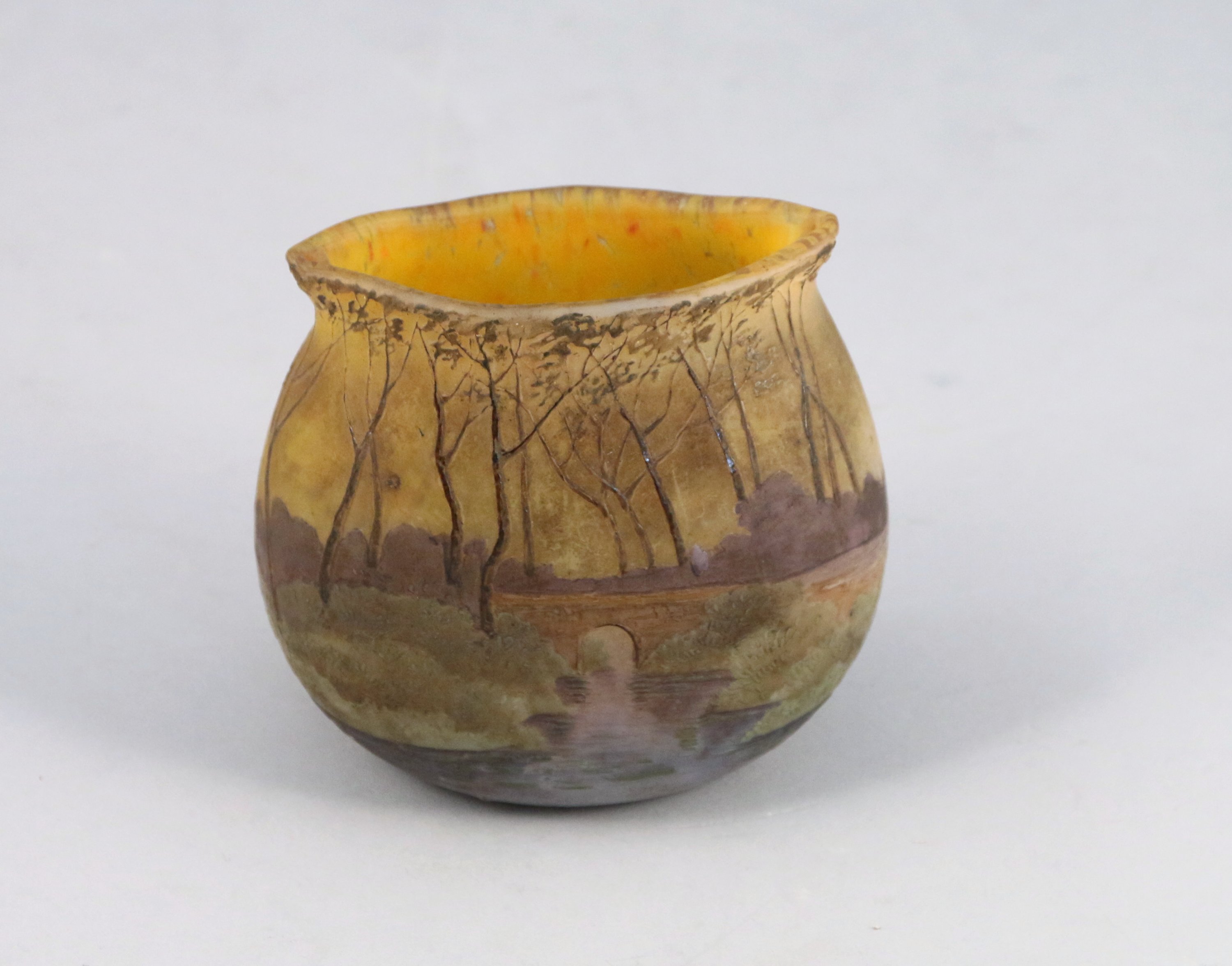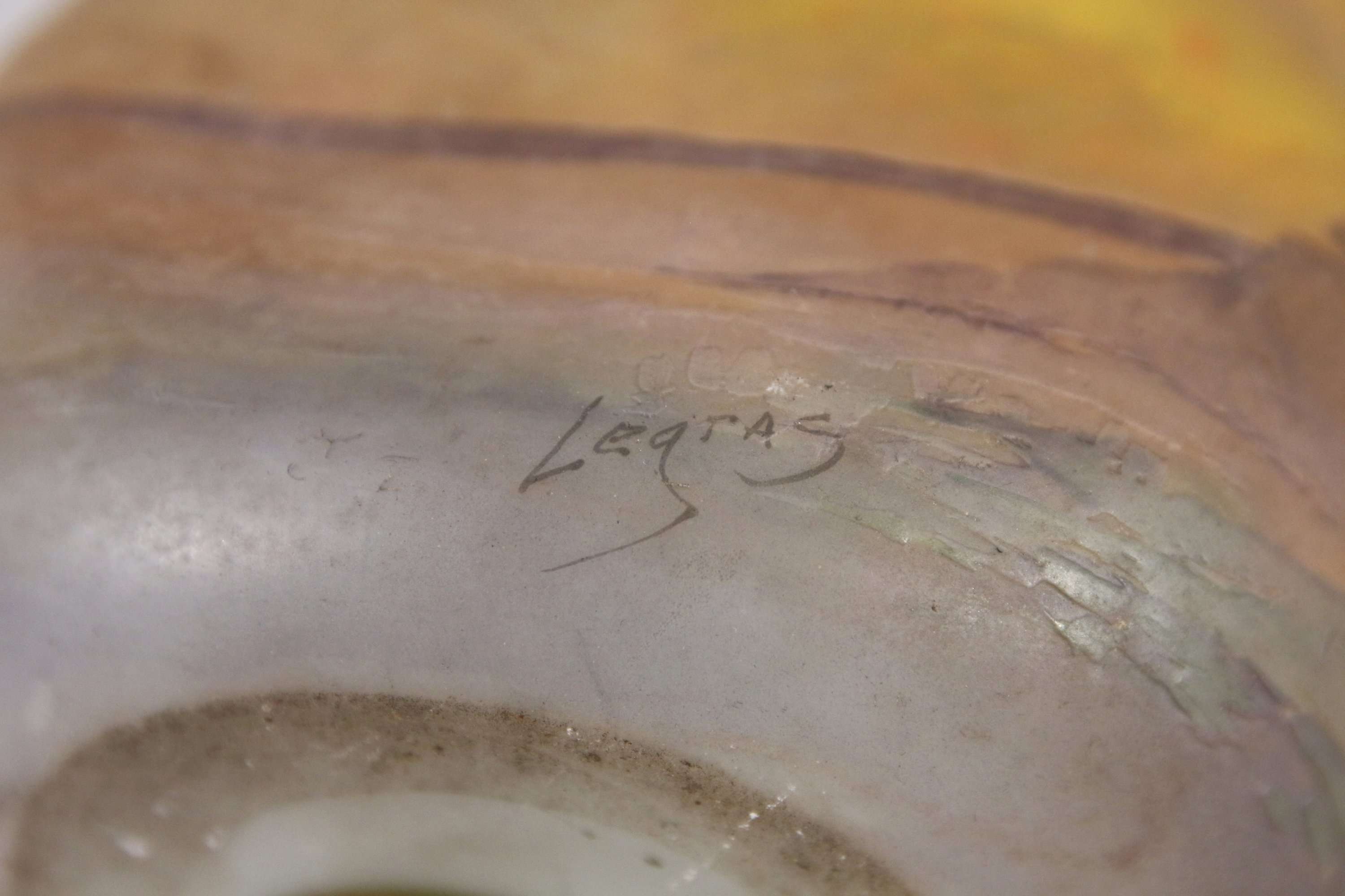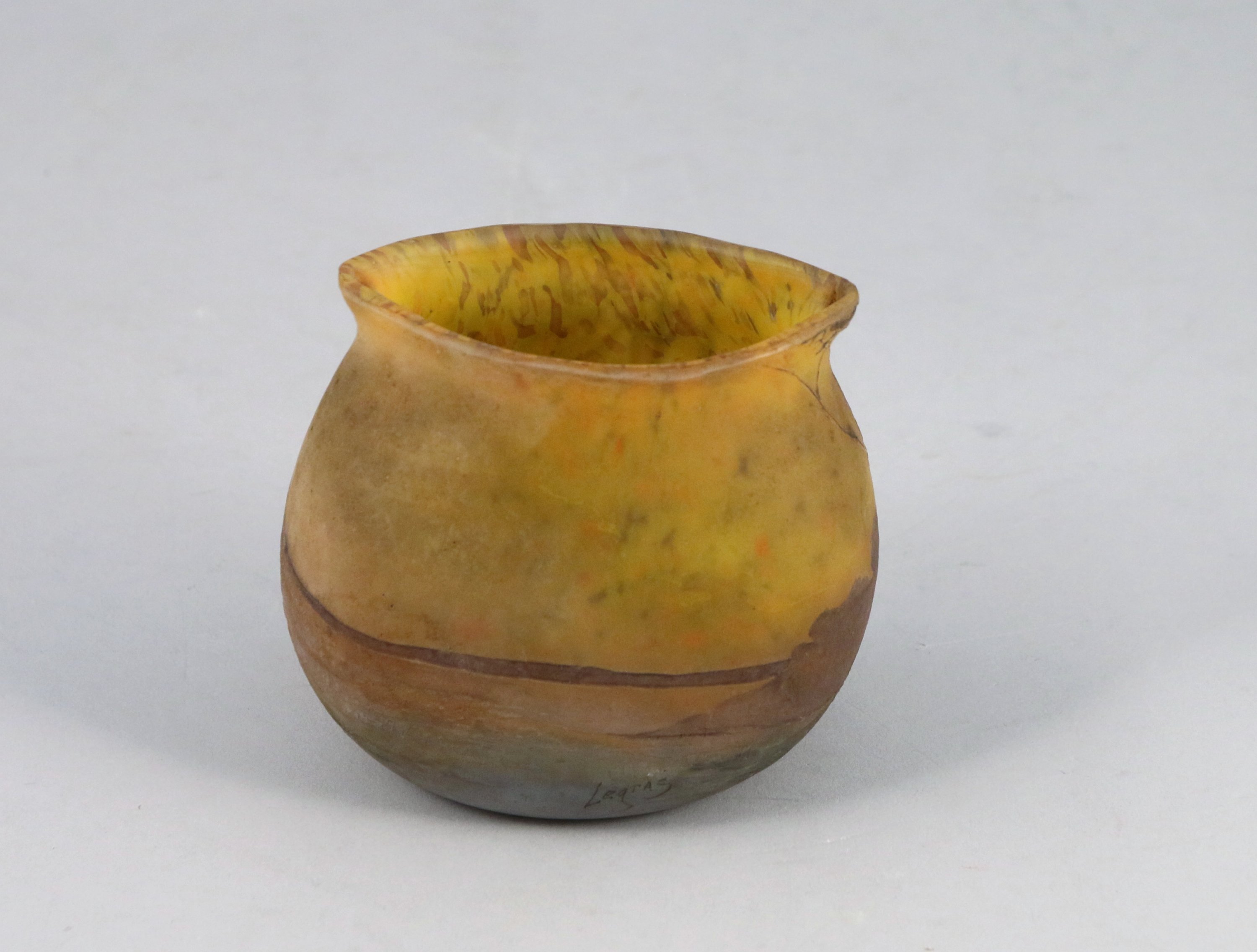 en verre multicouche dégagé à l'acide et rehaussé en émaux colorés, le col pincé. SIgné.