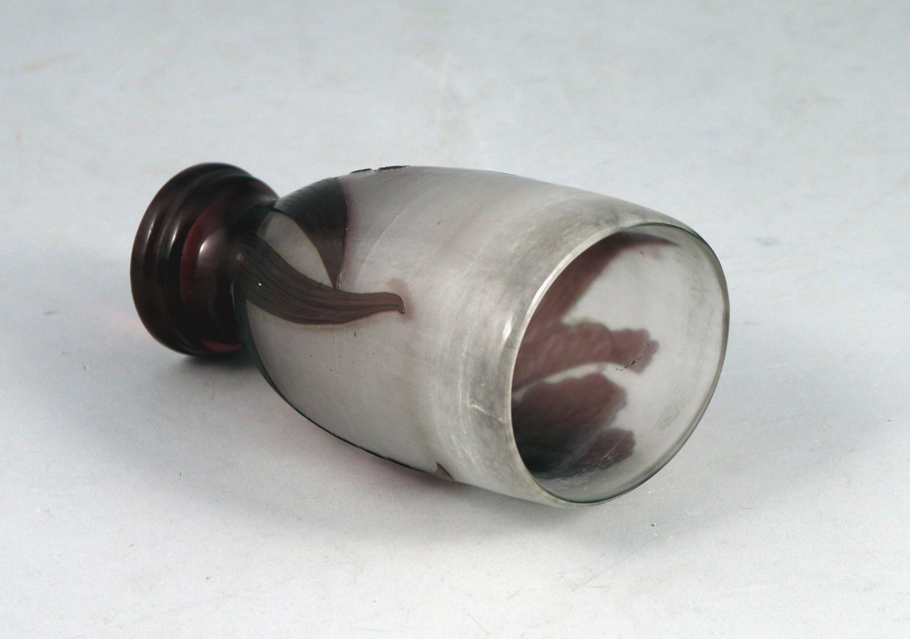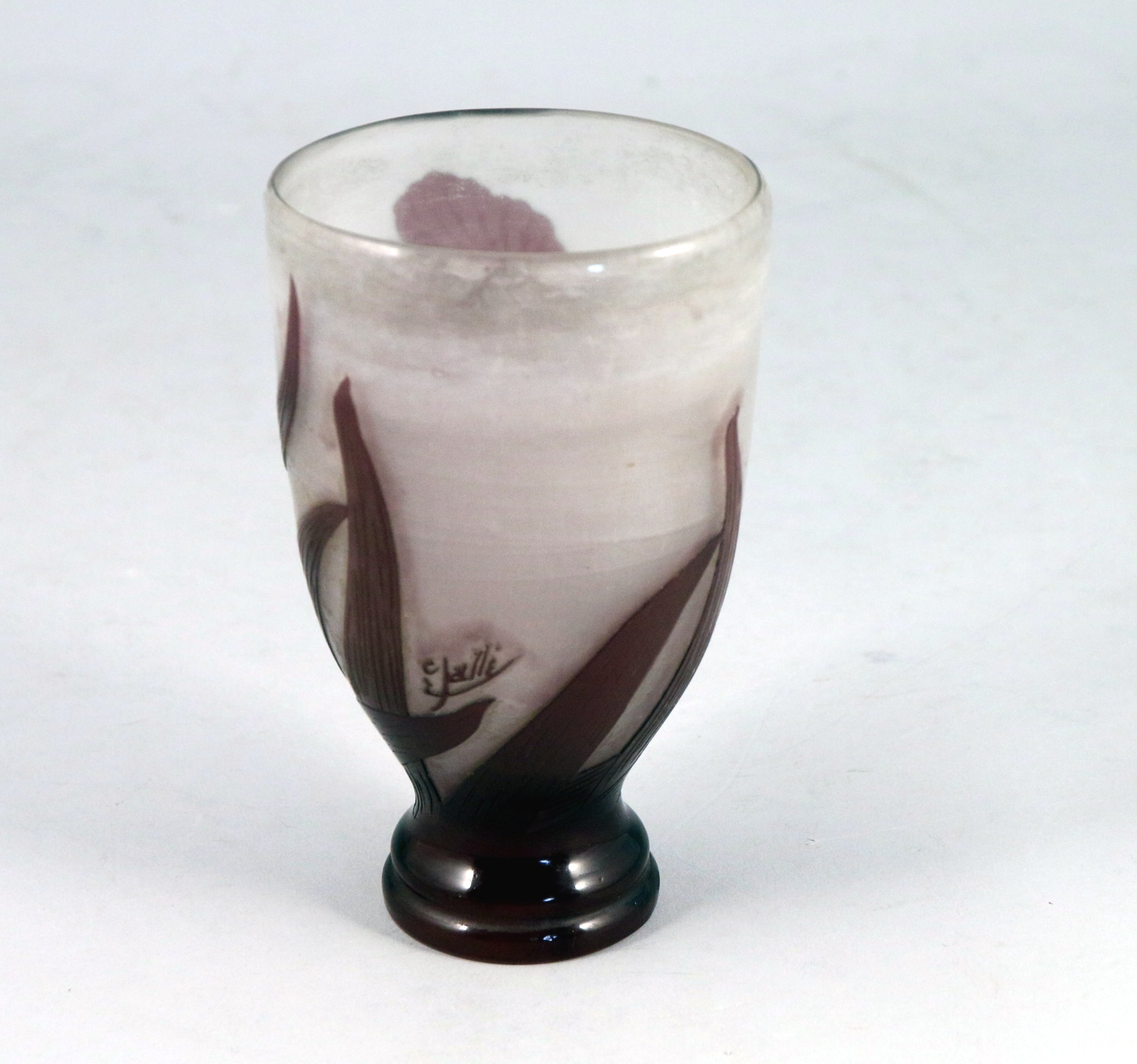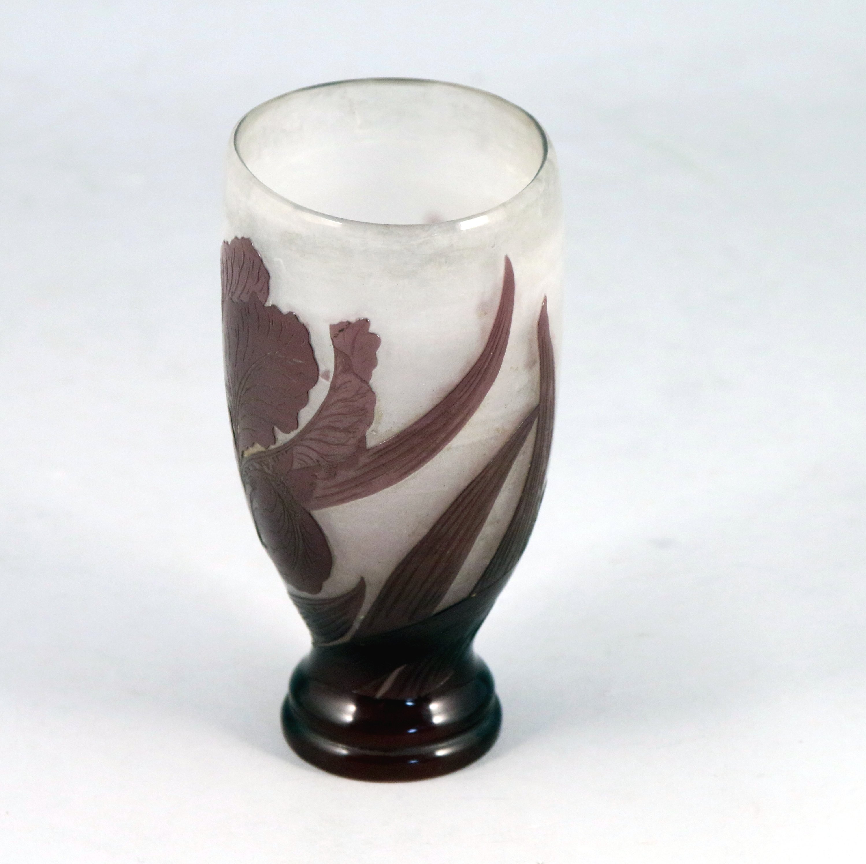 En forme de calice en verre multicouche à décor d'iris mauve sur fond blanc.