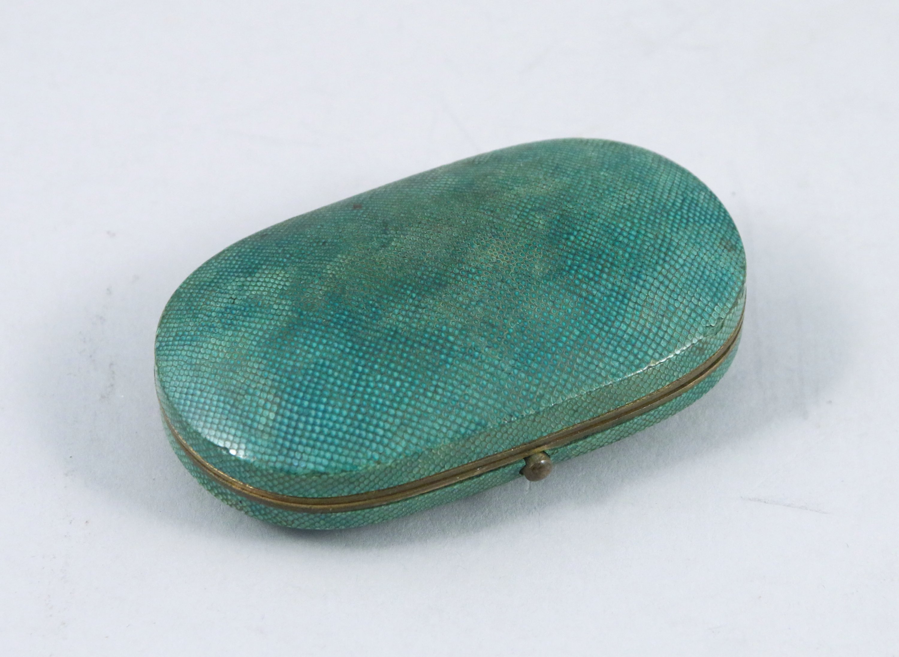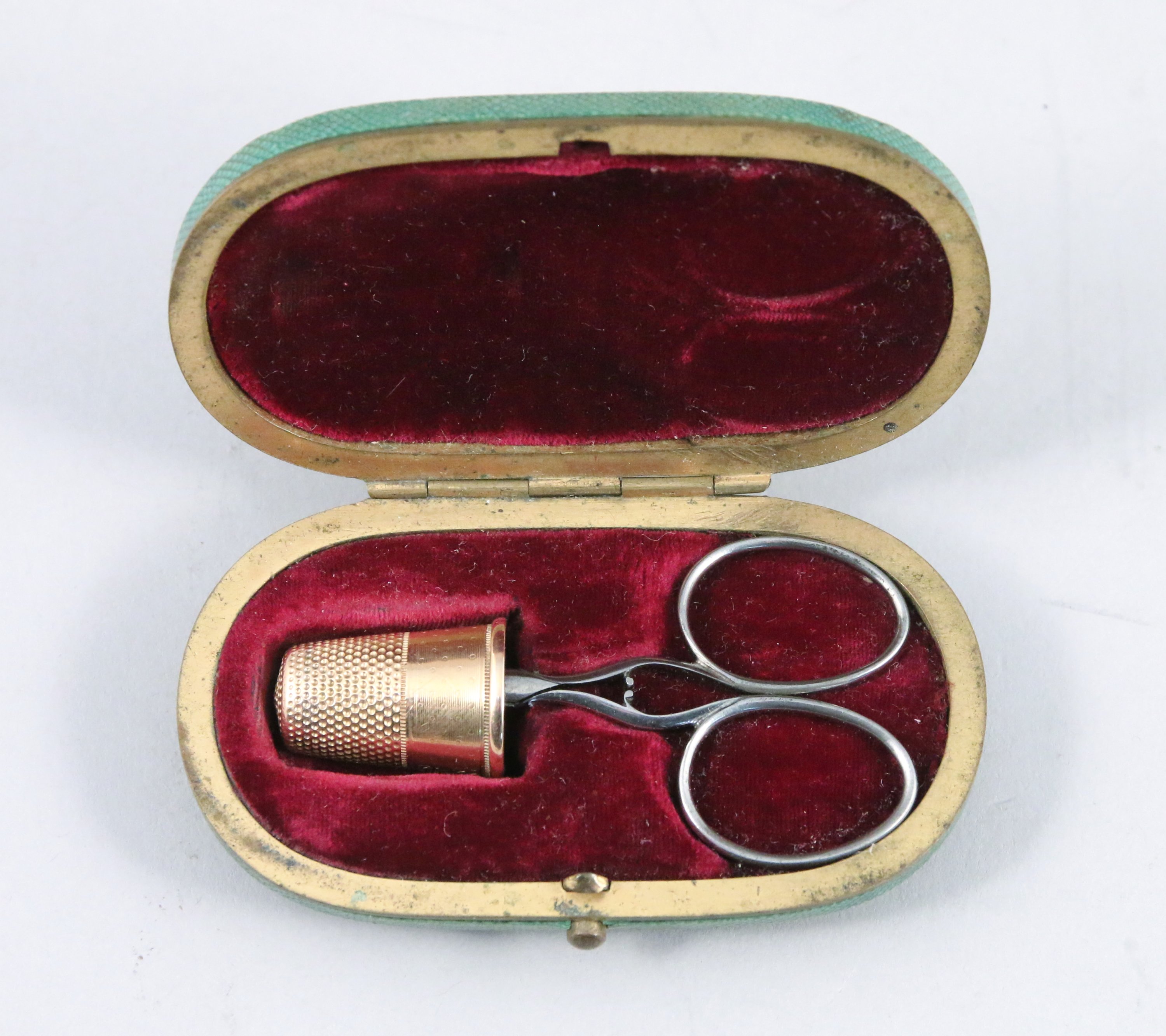 NÉCESSAIRE de COUTURE comprenant un dé à coudre en or ( à charge de contrôle) et une paire de ciseaux. Dans un étui de forme oval gainé de chagrin teinté vert.