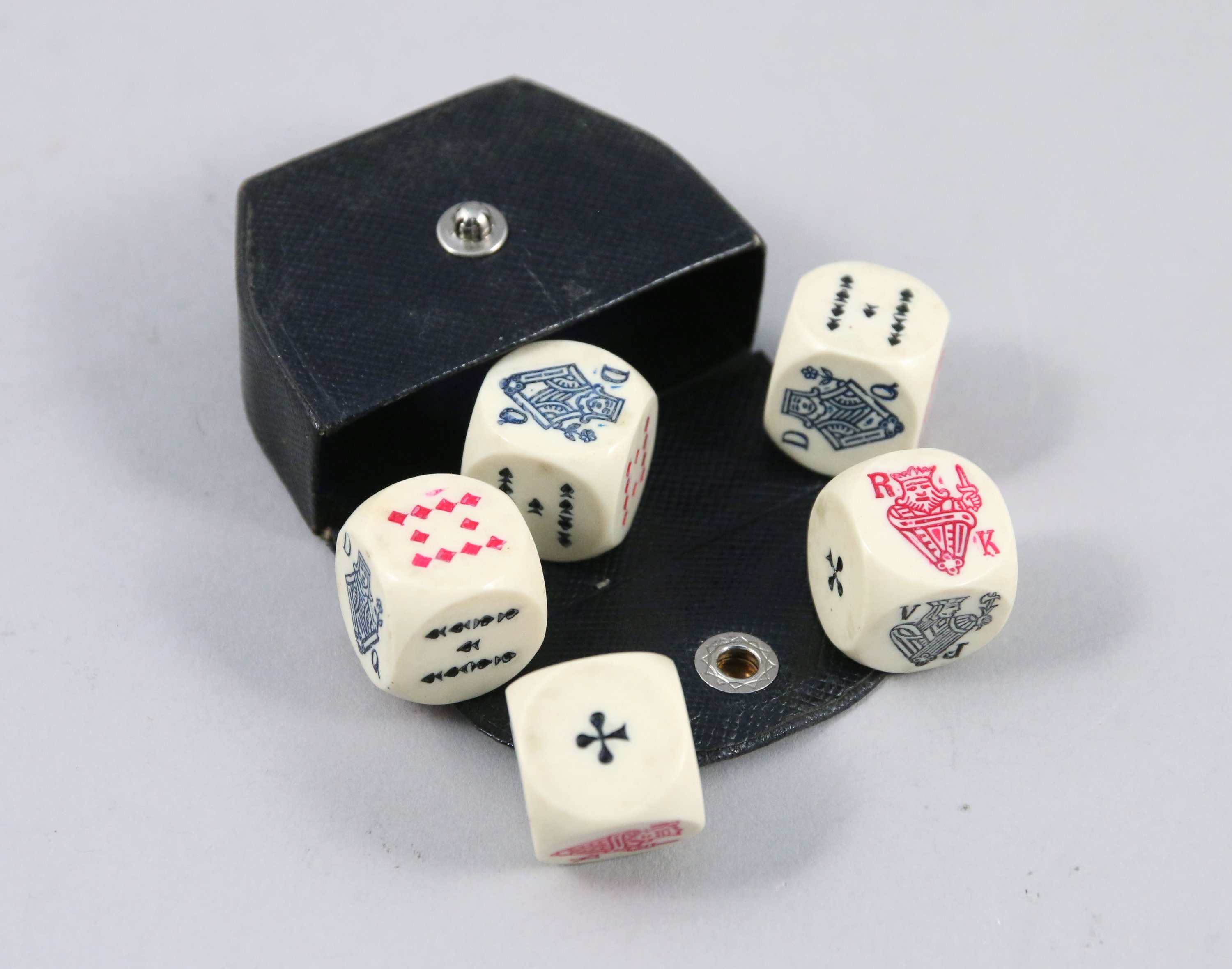 JOINT: ÉTUI en cuir contenant cinq DÉS pour jeux de cartes.