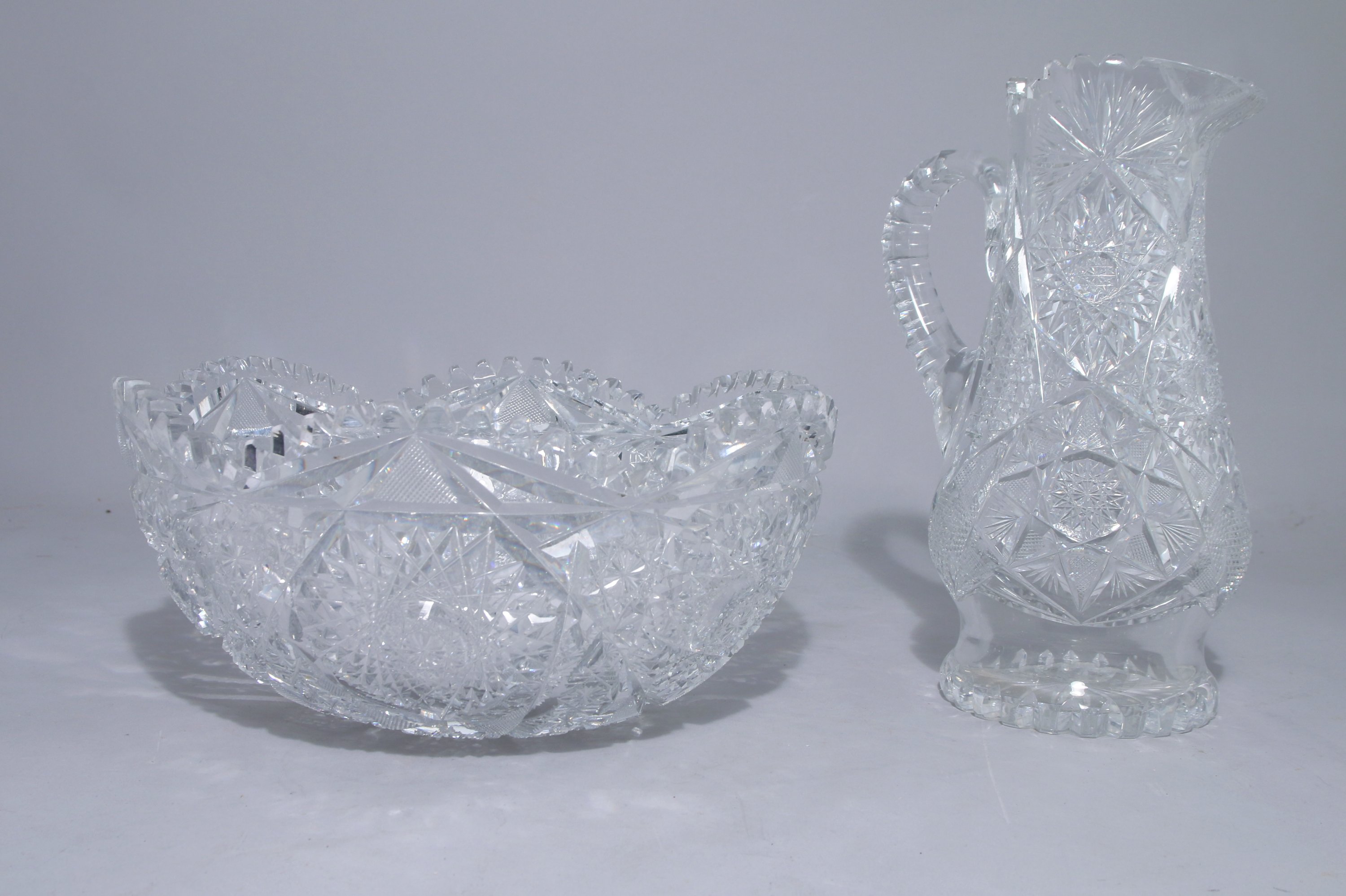 en cristal finement taillé de motifs rayonnants, fleurs et frises géométriques.