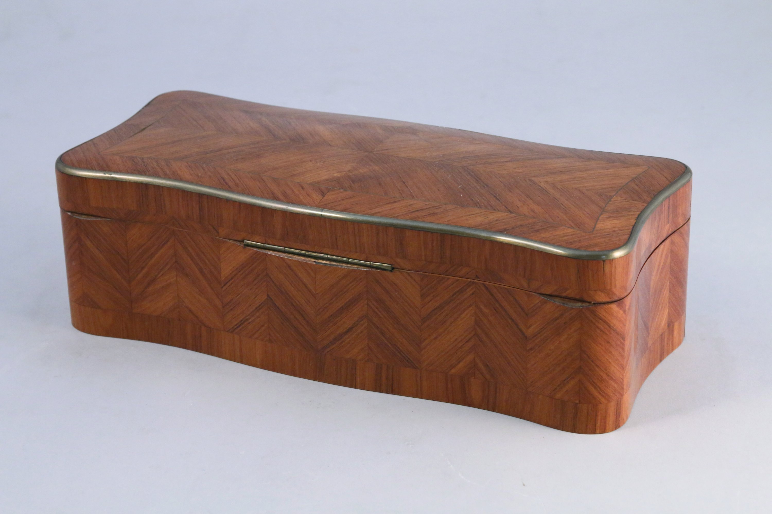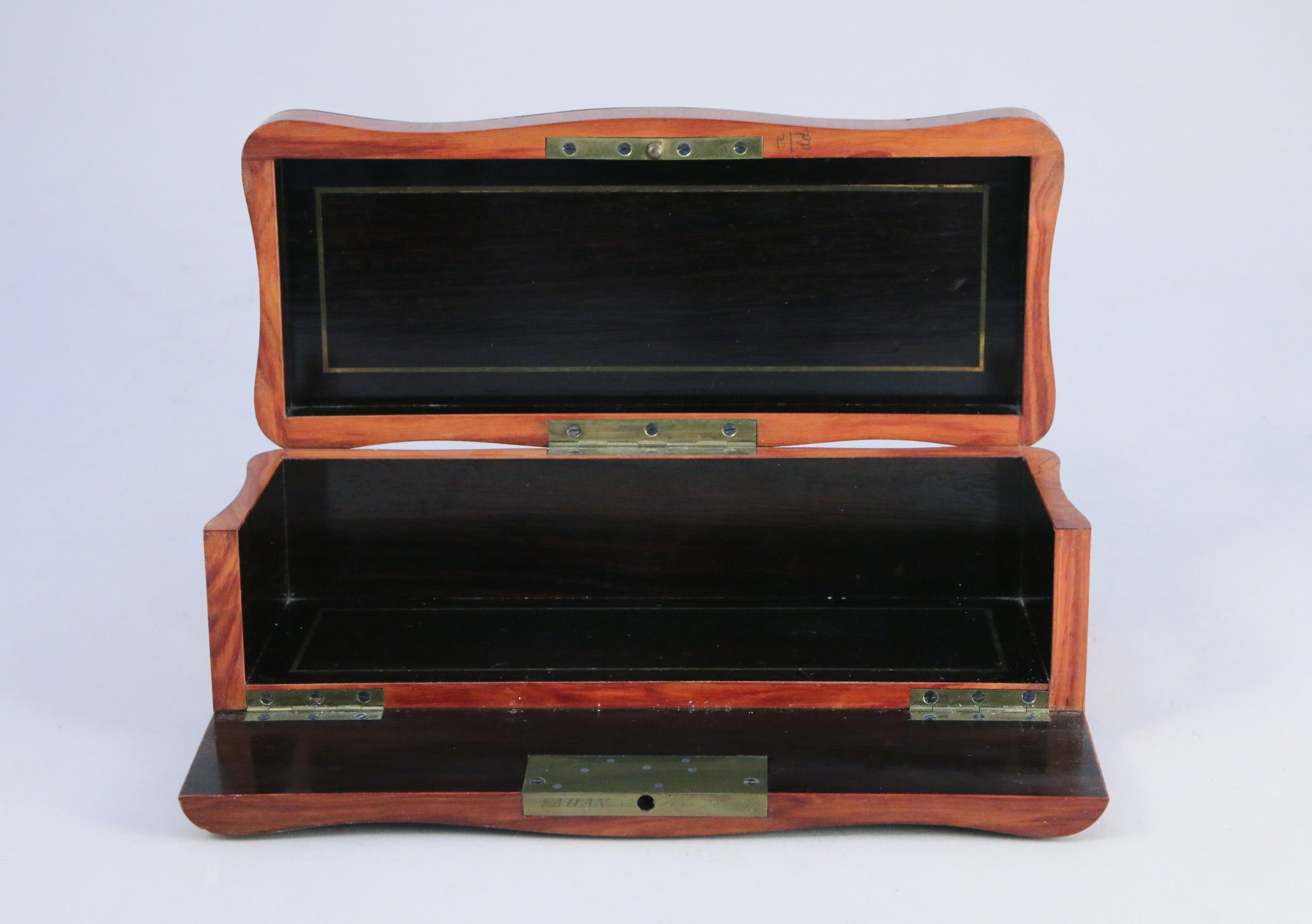 - un de la maison "TAHAN rue de la Paix 30", en placage de bois de rose de forme mouvementée, ouvrant en partie haute et par la façade, l'intérieur foncé de palissandre, avec sa serrure signée. Haut. 8, Long. 26 Prof. 11 cm.