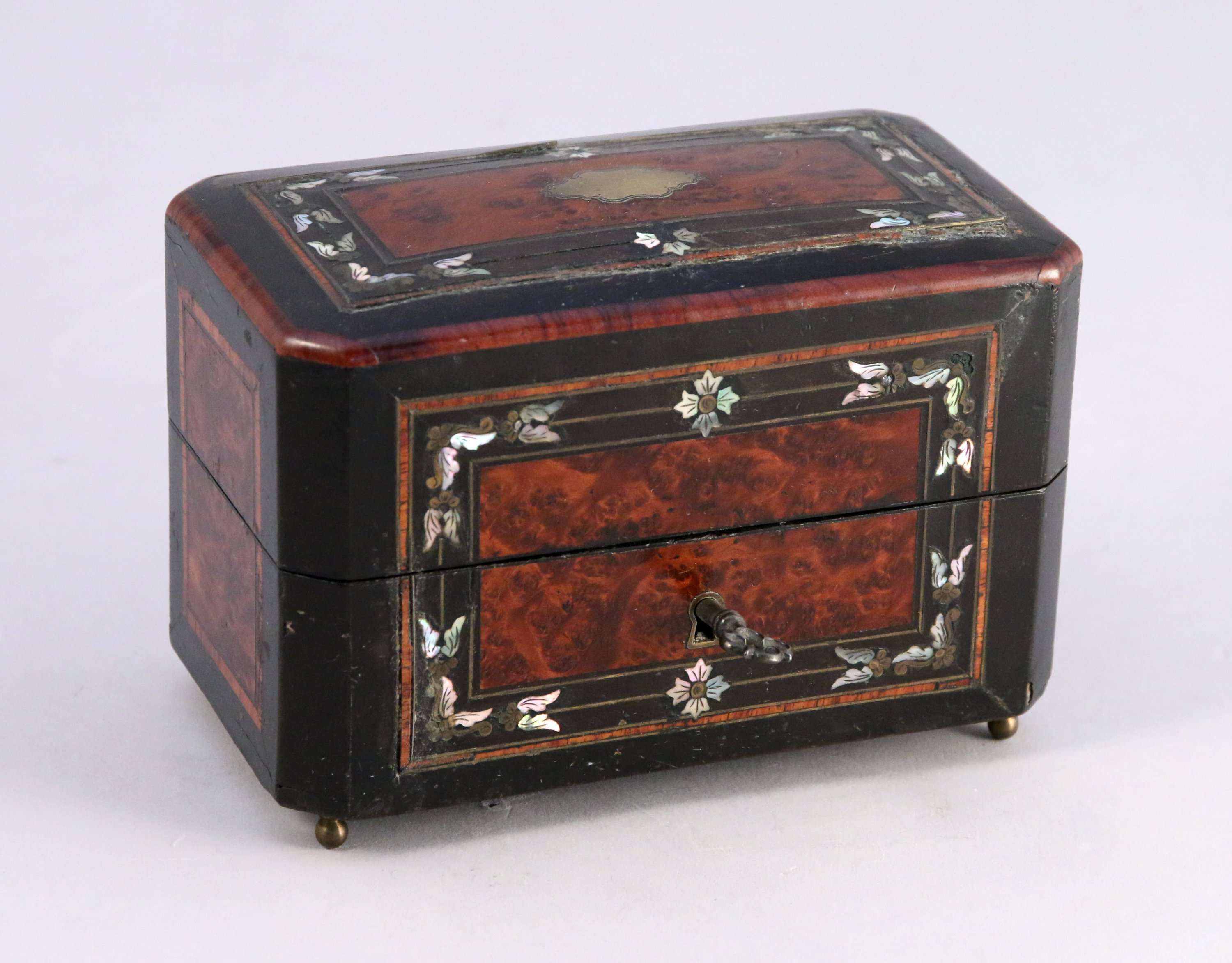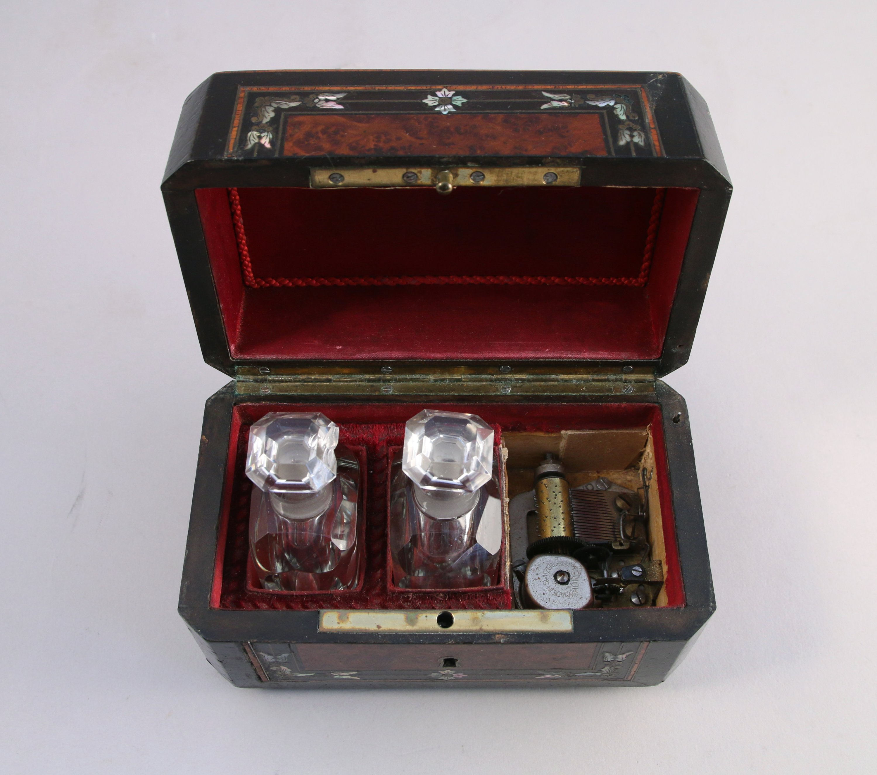 - l'autre formant boite à musique de forme rectangulaire à pans coupés, en placage de loupe et d'ébène (?) avec incrustation de laiton et de nacre ; il contient deux flacons en verre taillé et dissimule une boite à musique qui se déclence à l'ouverture ; il repose sur quatre petits pied boule. Haut. 10, Long. 15, Prof. 8,5 cm. (petits accidents et manques)