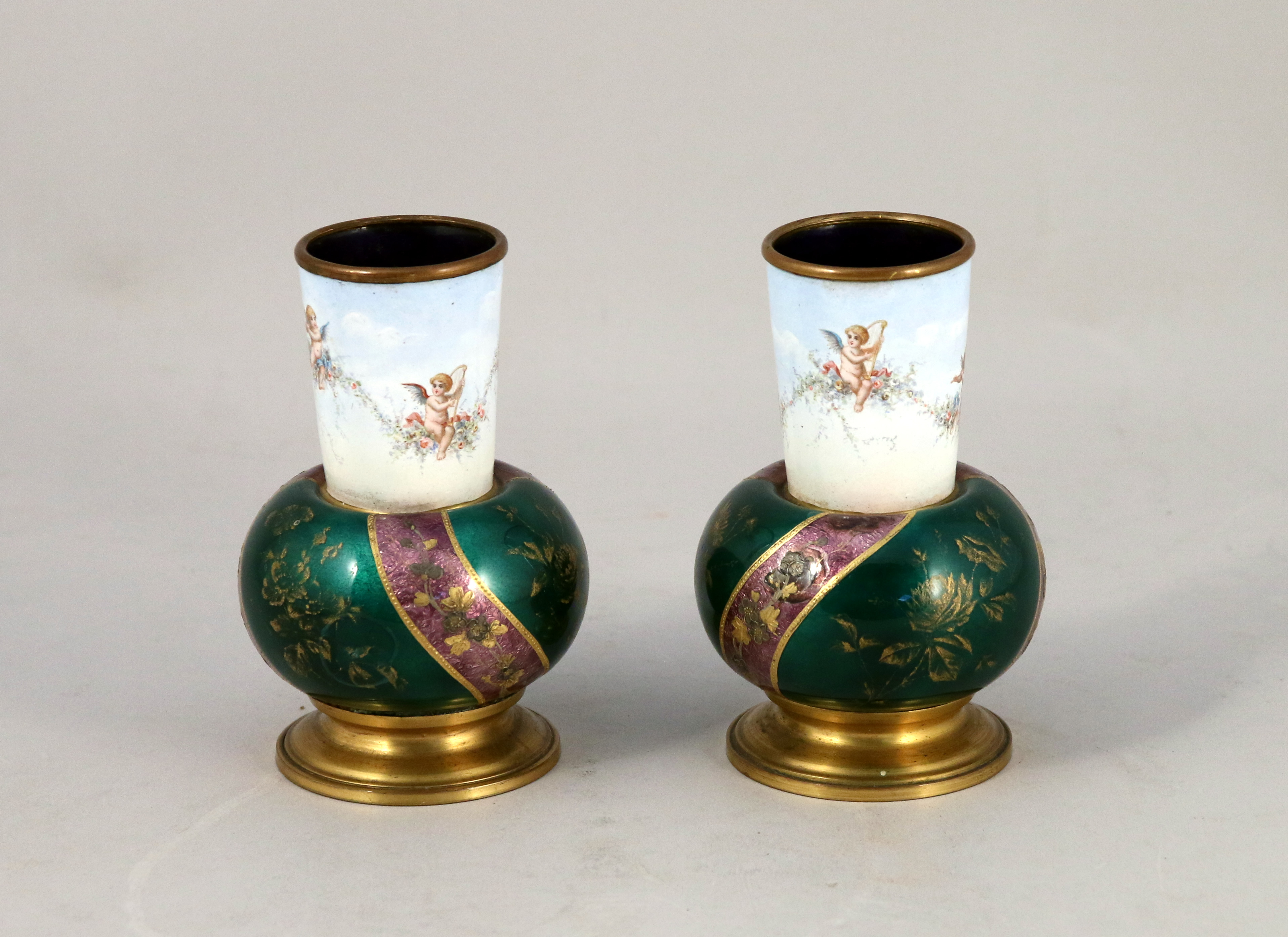 en cuivre émaillé, la partie supérieure à décor d'amours musiciens assis sur des guirlandes de fleurs sur fond nuageux. La partie inférieure de forme renflée à décor en émail translucide de trois galons violet à décor de fleurs à l'or sur fond gaufré s'alternant avec des réserves vertes décorées de fleurs dorées. Piédouche en laiton doré. Intérieur bleu nuit.