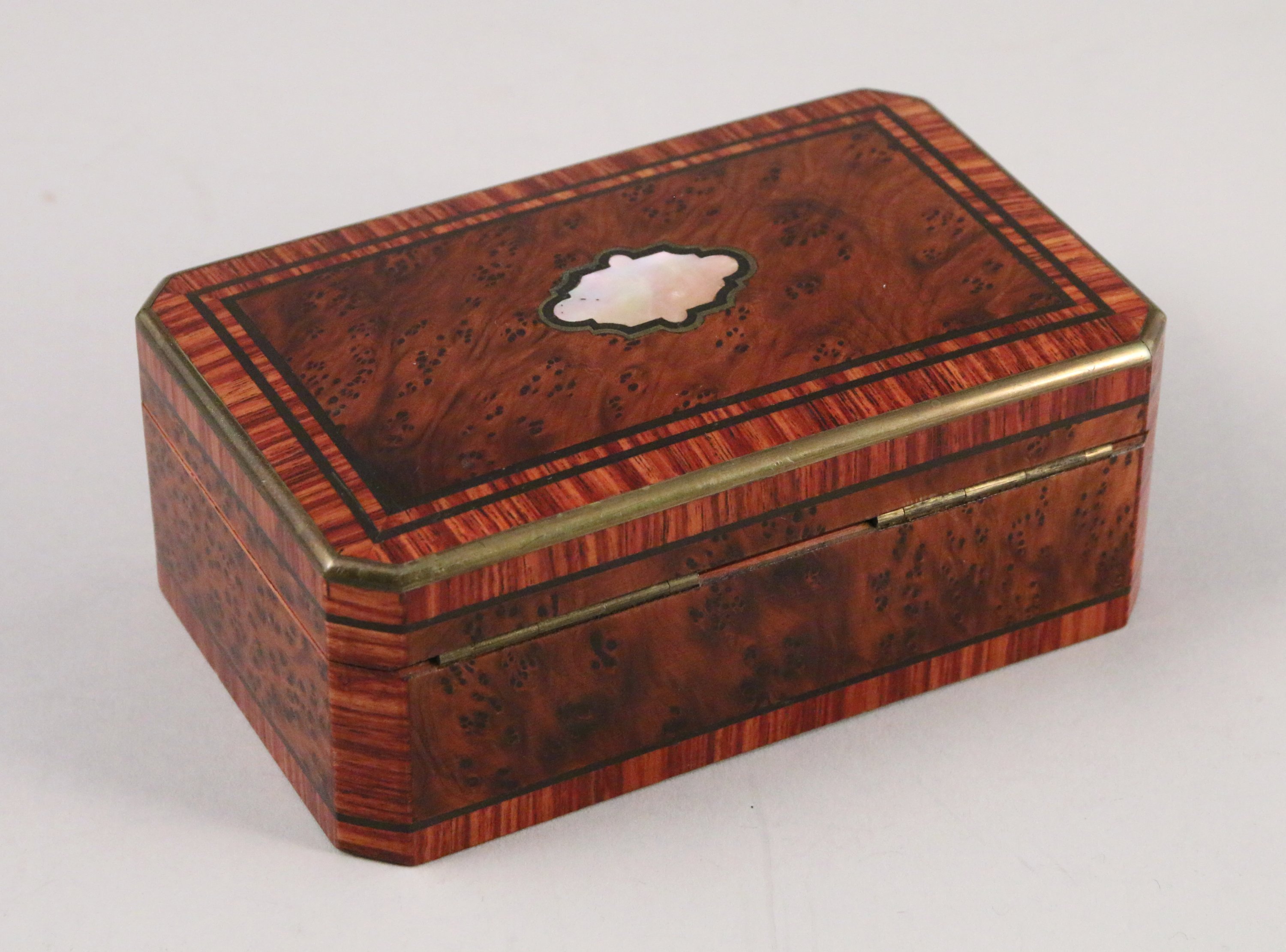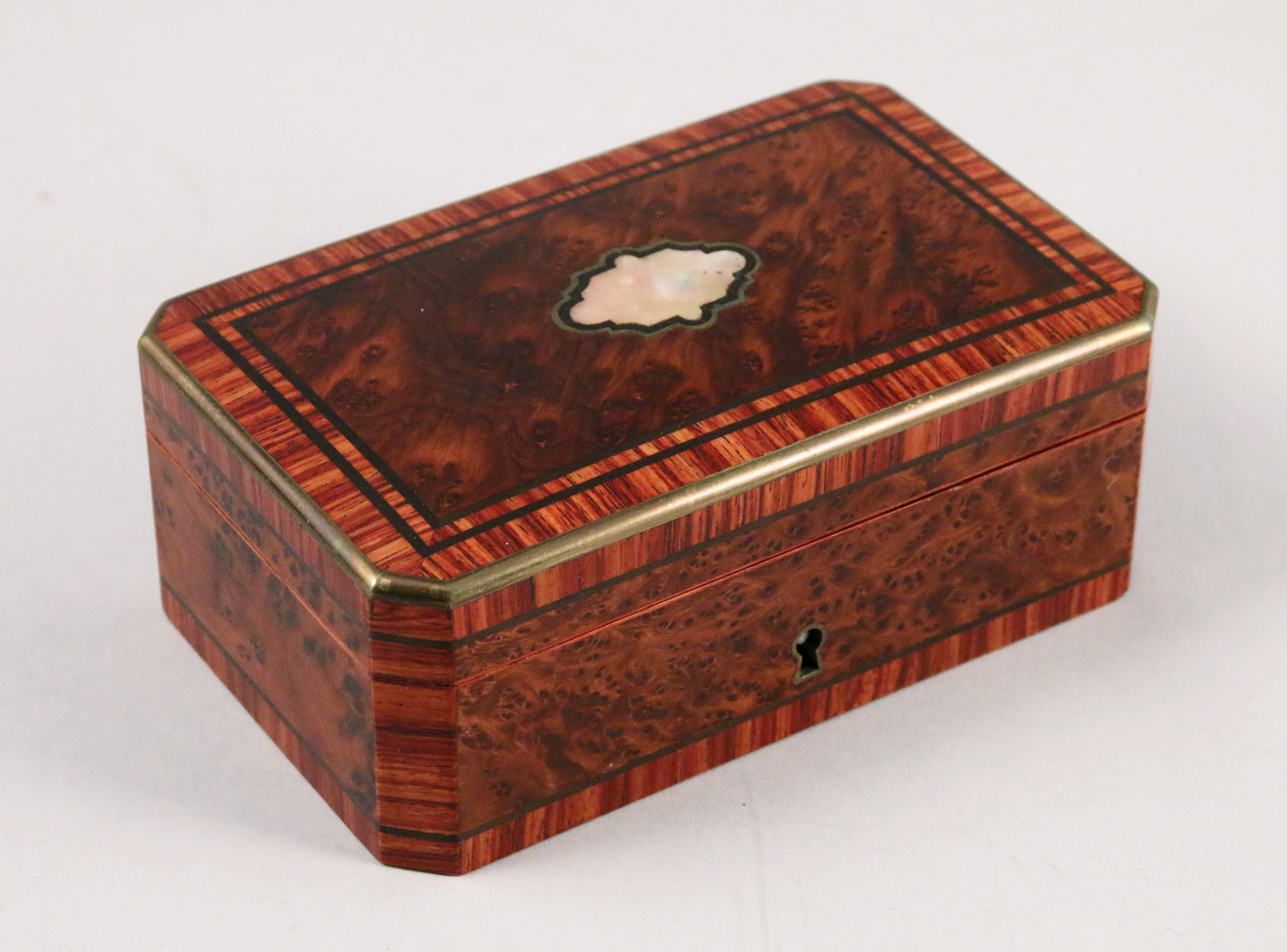 en placage de loupe, de palissandre filets de bois noir et de laiton encadrant un médaillon de nacre. L'intérieur capitonné en soie bleue. Serrure mais clé manquante.