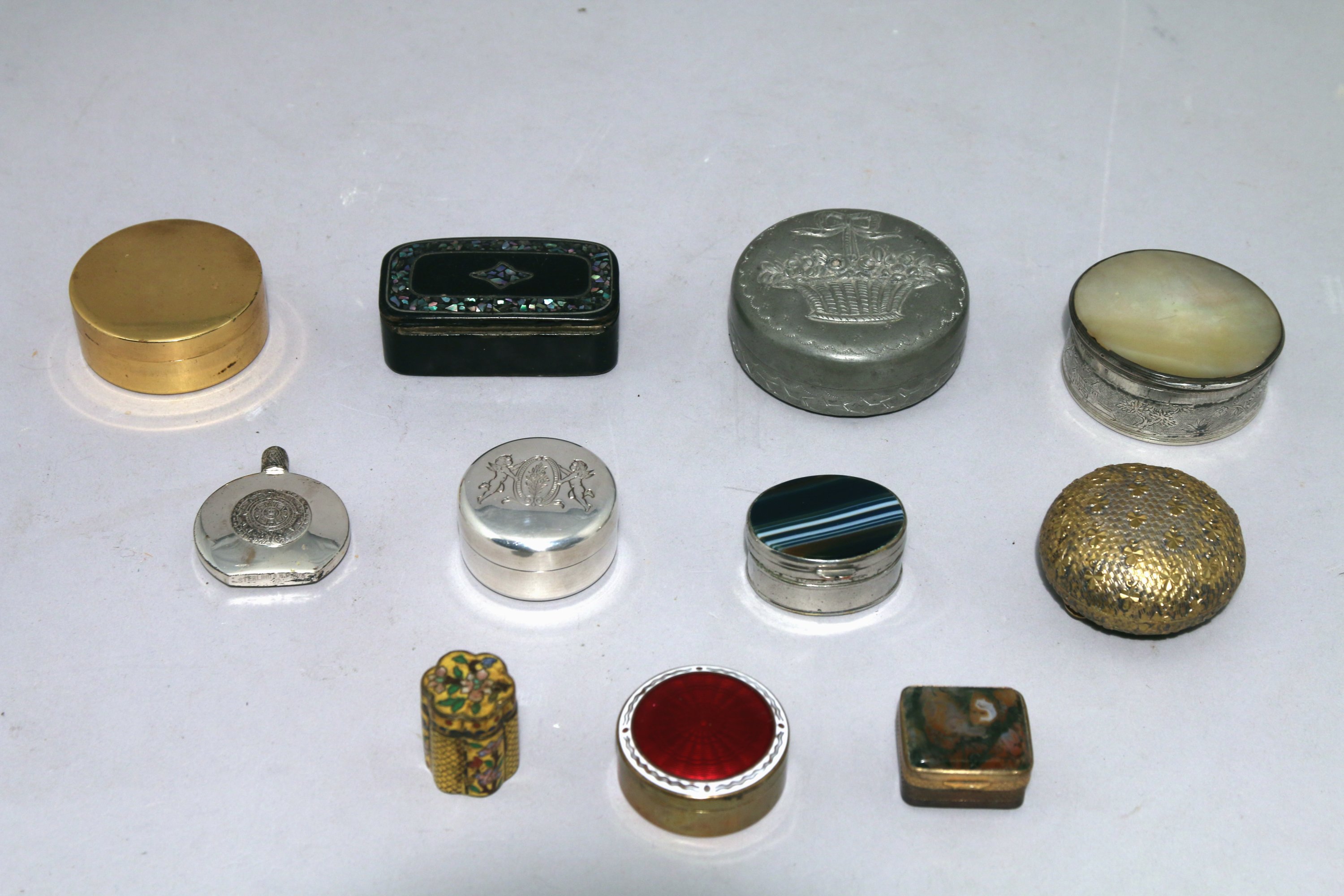 - BOITE à PILLULES de forme circulaire en métal argenté, le couvercle à décor de deux amours ailés soutenant un cartouche fleuri. Diam. 3,7 cm.