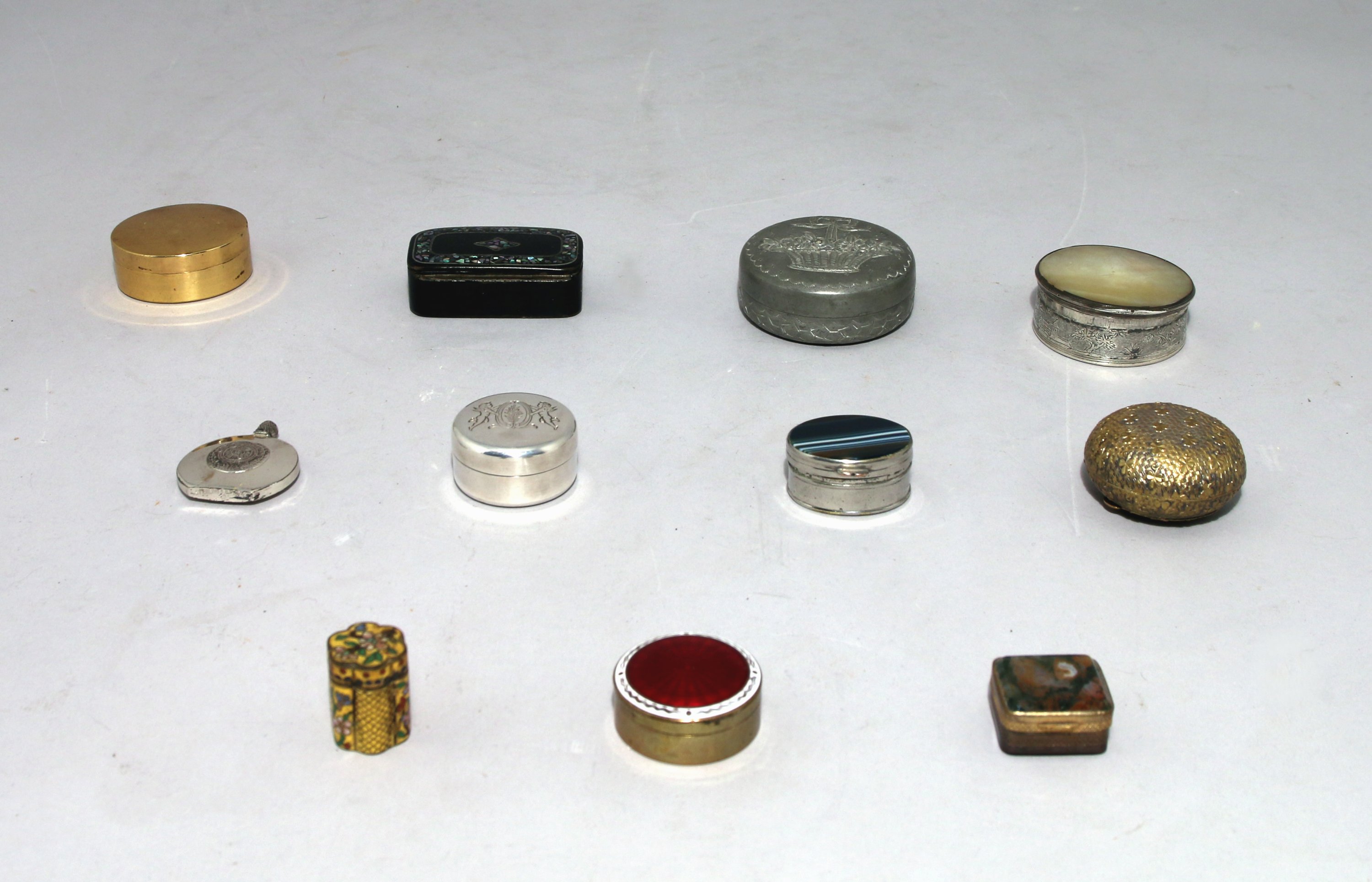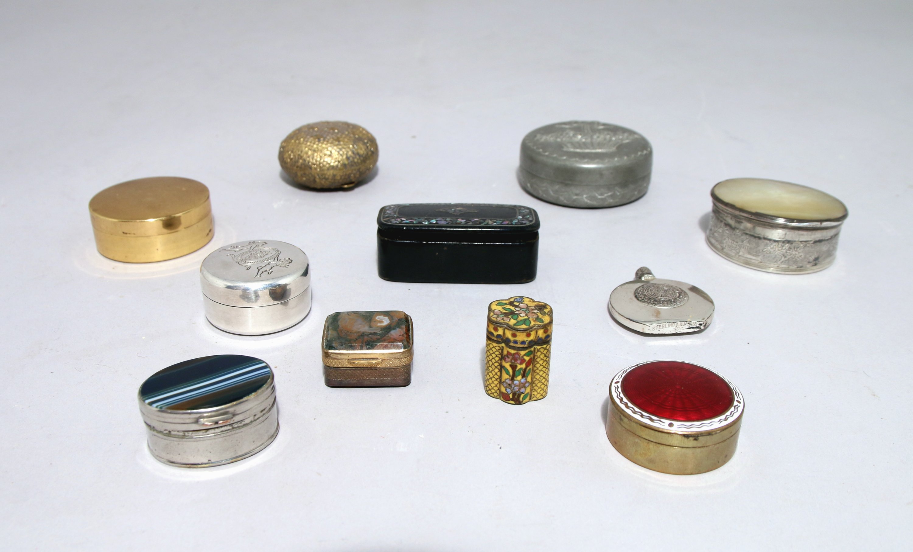 - BOITE à PILLULES de forme ovale formée de deux plaques en agate, monture en métal argenté. Haut. 1,7, Larg. 4 cm.