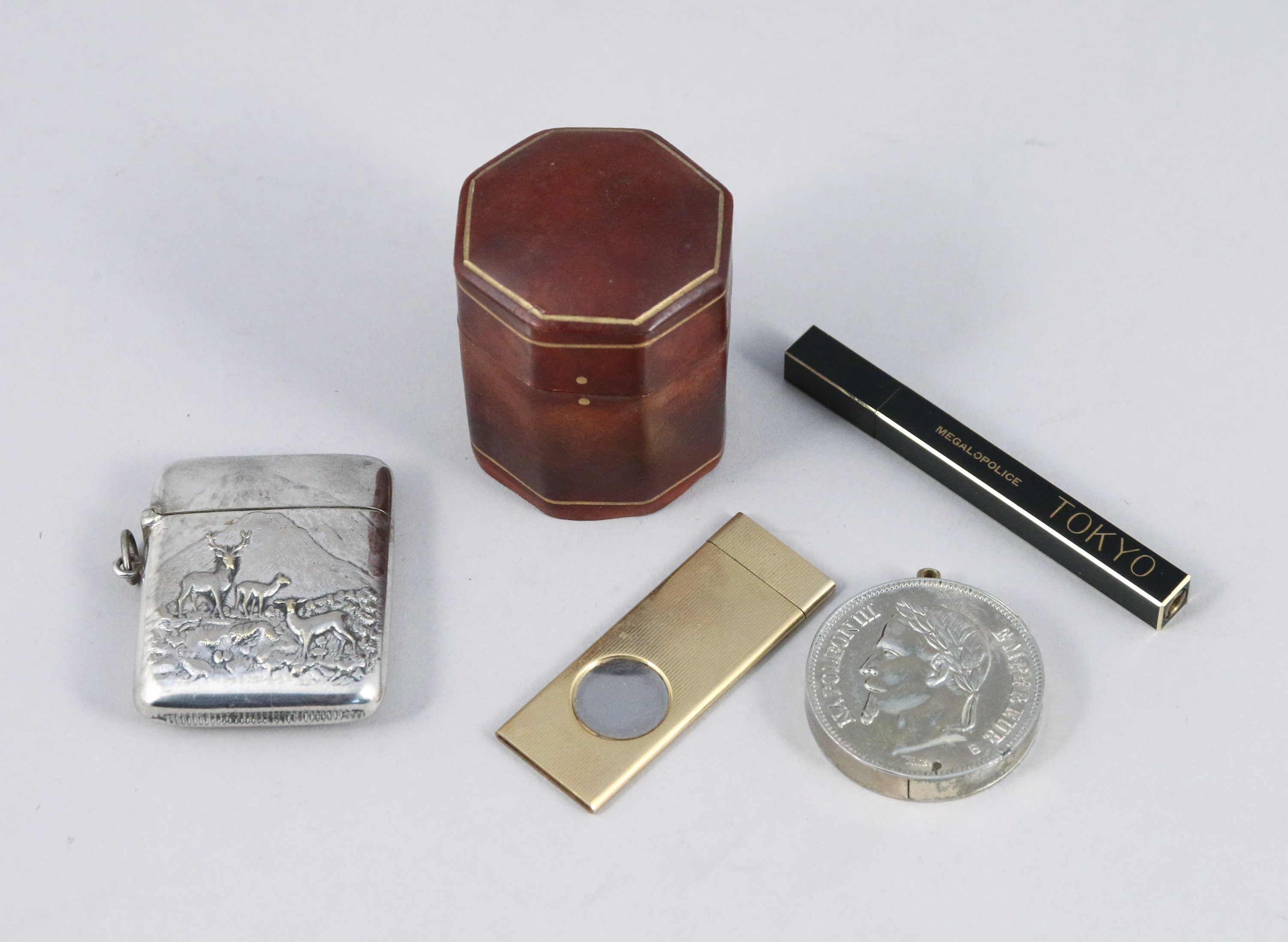 - Deux BRIQUETS, l'UN à décor d'une 5 Franc Napoléon III, le 2nd marqué MAGALOPOLICE TOKYO.