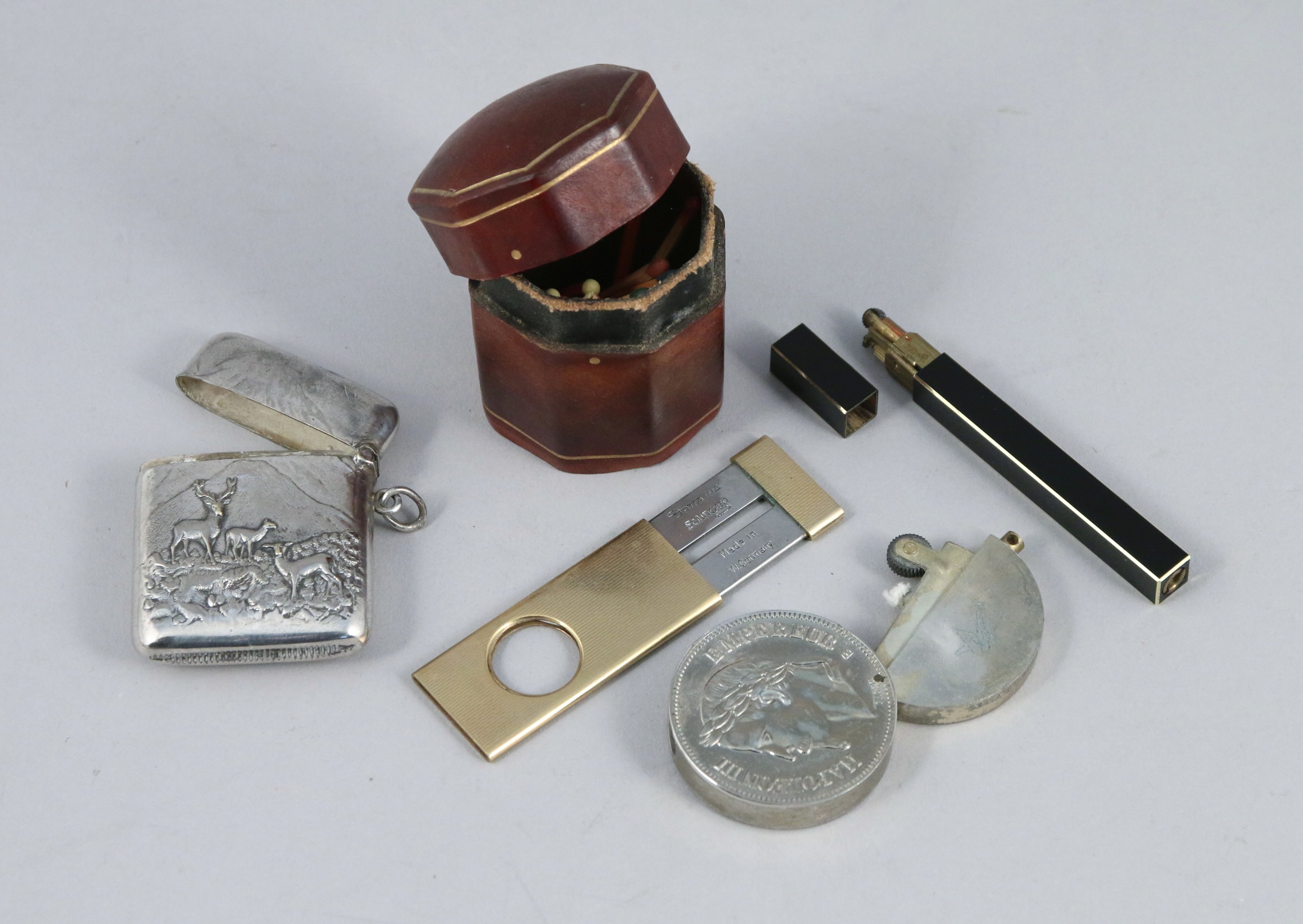 - BOITE à ALLUMETTES en métal argenté à décor repoussé de cervidés dans la montagne. Haut. 5, Larg. 4 cm.