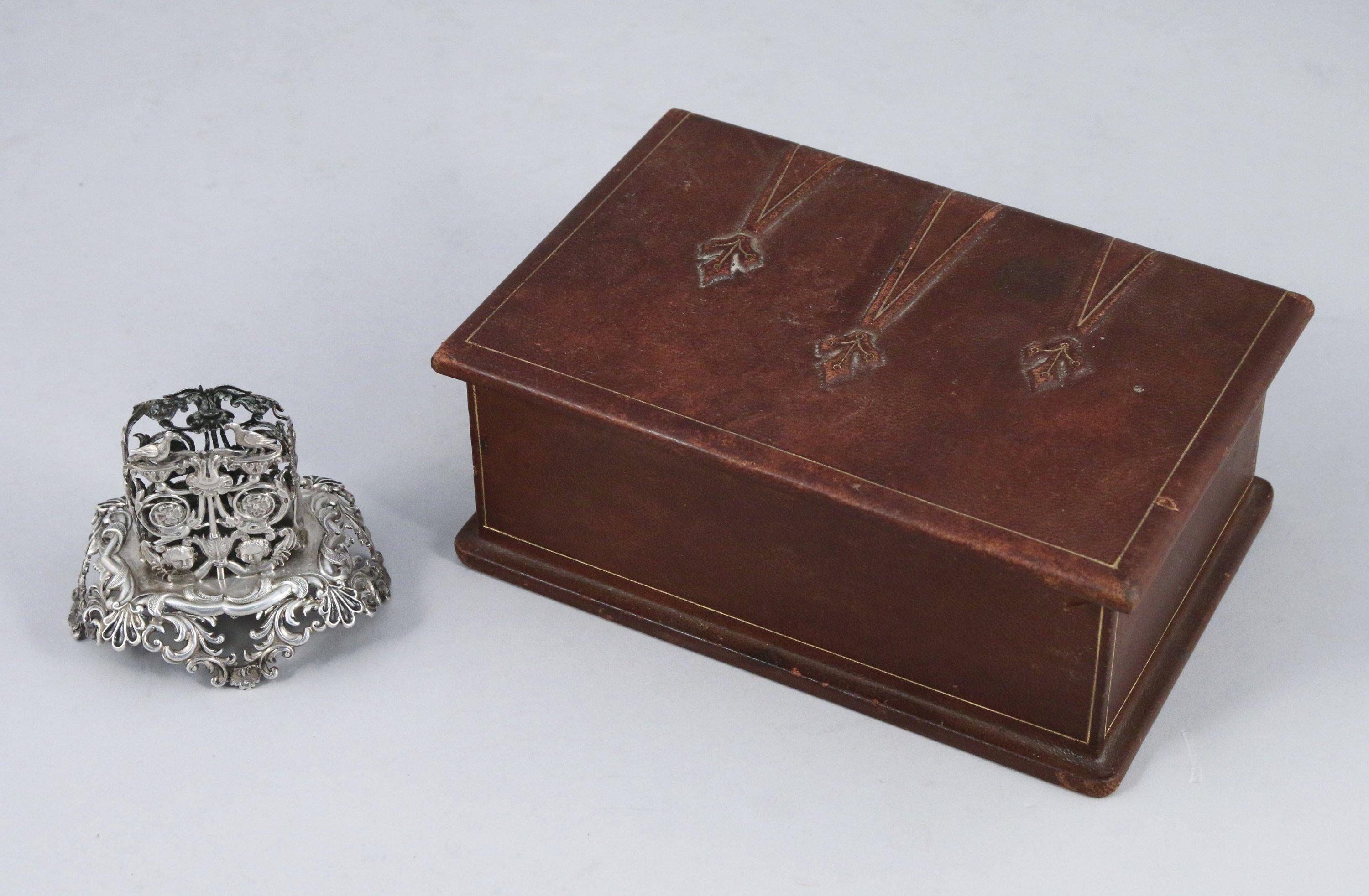 - PORTE ALLUMETTES en métal argenté ajouré à décor de rinceaux, enroulements feuillagé, amours et oiseaux. Haut. 6,5, Larg. 8, Prof. 5 cm.