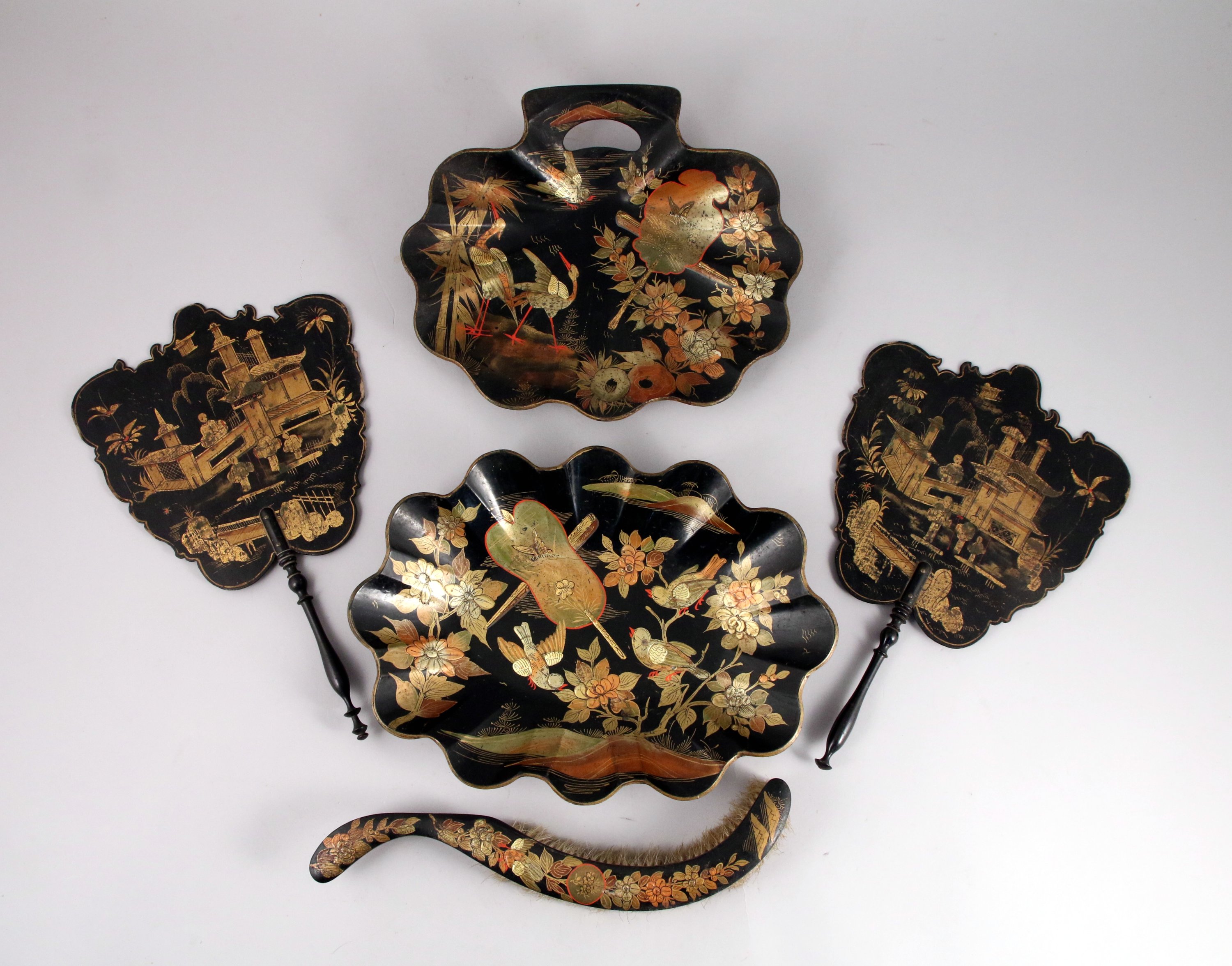 à décors à l'or sur fond noir en vernis d'oiseaux branchés ou de scènes de palais comprenant une paire d'ÉCRANS (Haut. 35,5 cm), un RAMASSE-MIETTE (Long. 31 cm)et sa BALAYETTE et une COUPE GODRONNÉEE (Long. 34,5 cm).