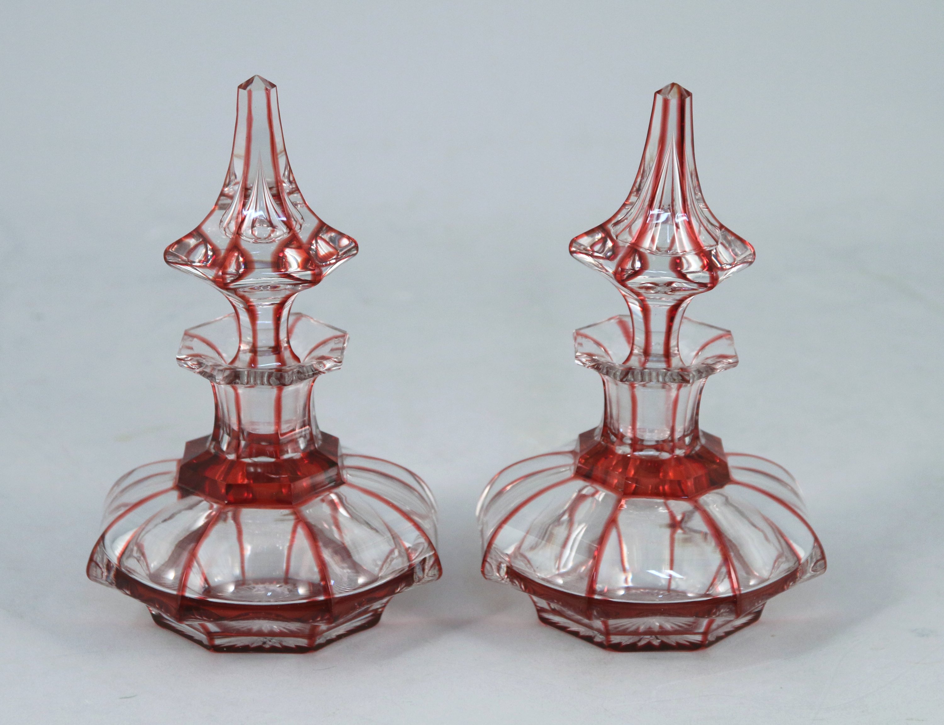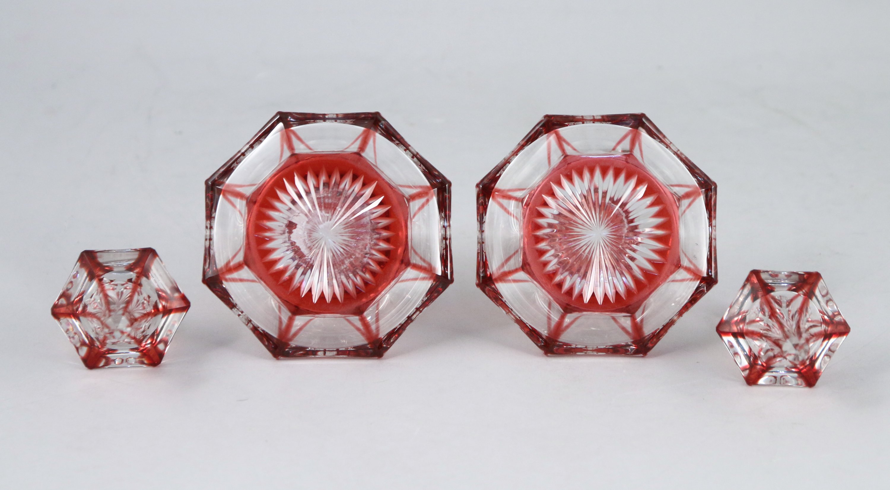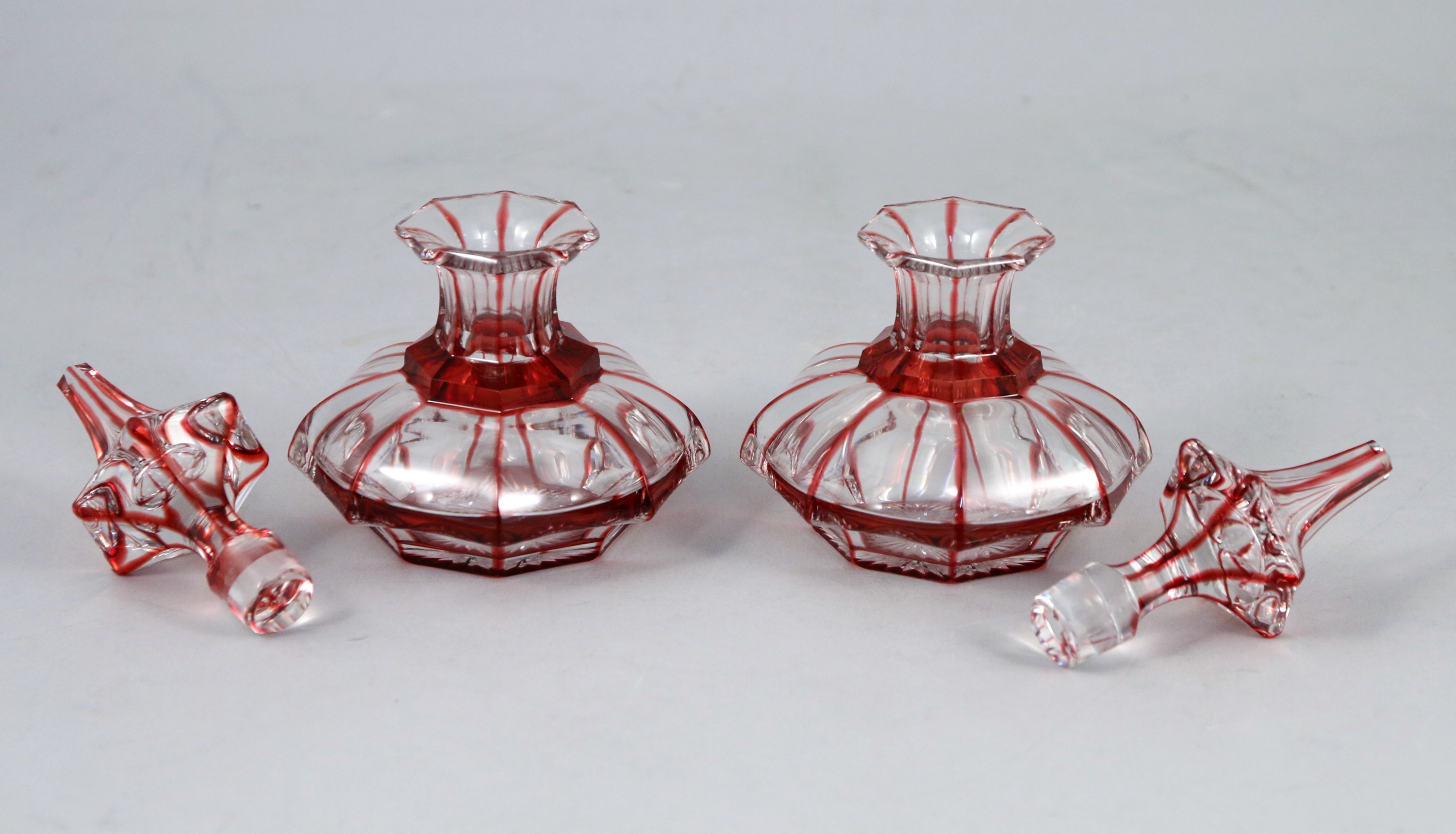 de forme octogonale en cristal à liseré pourpre et bouchons taillés.