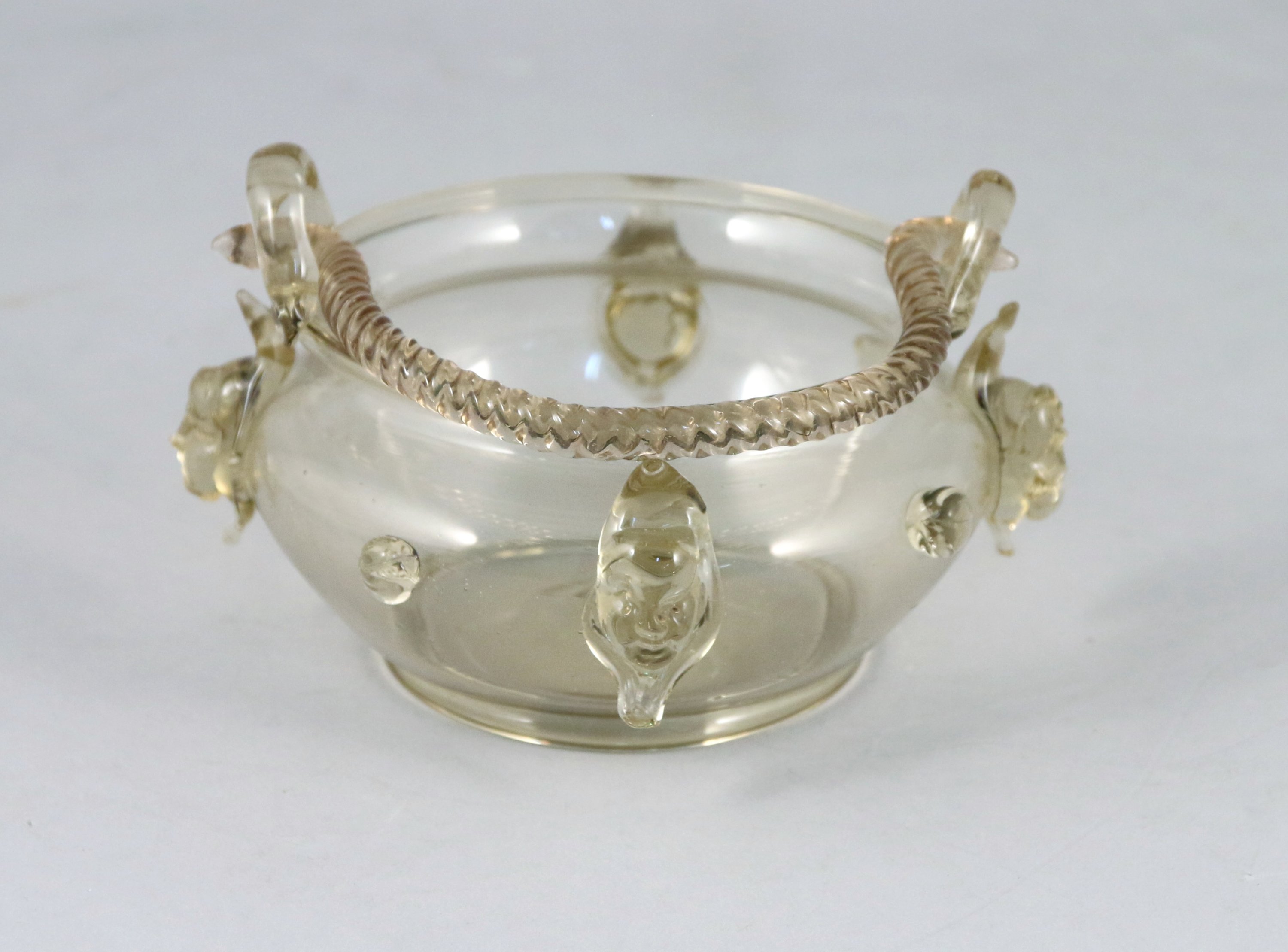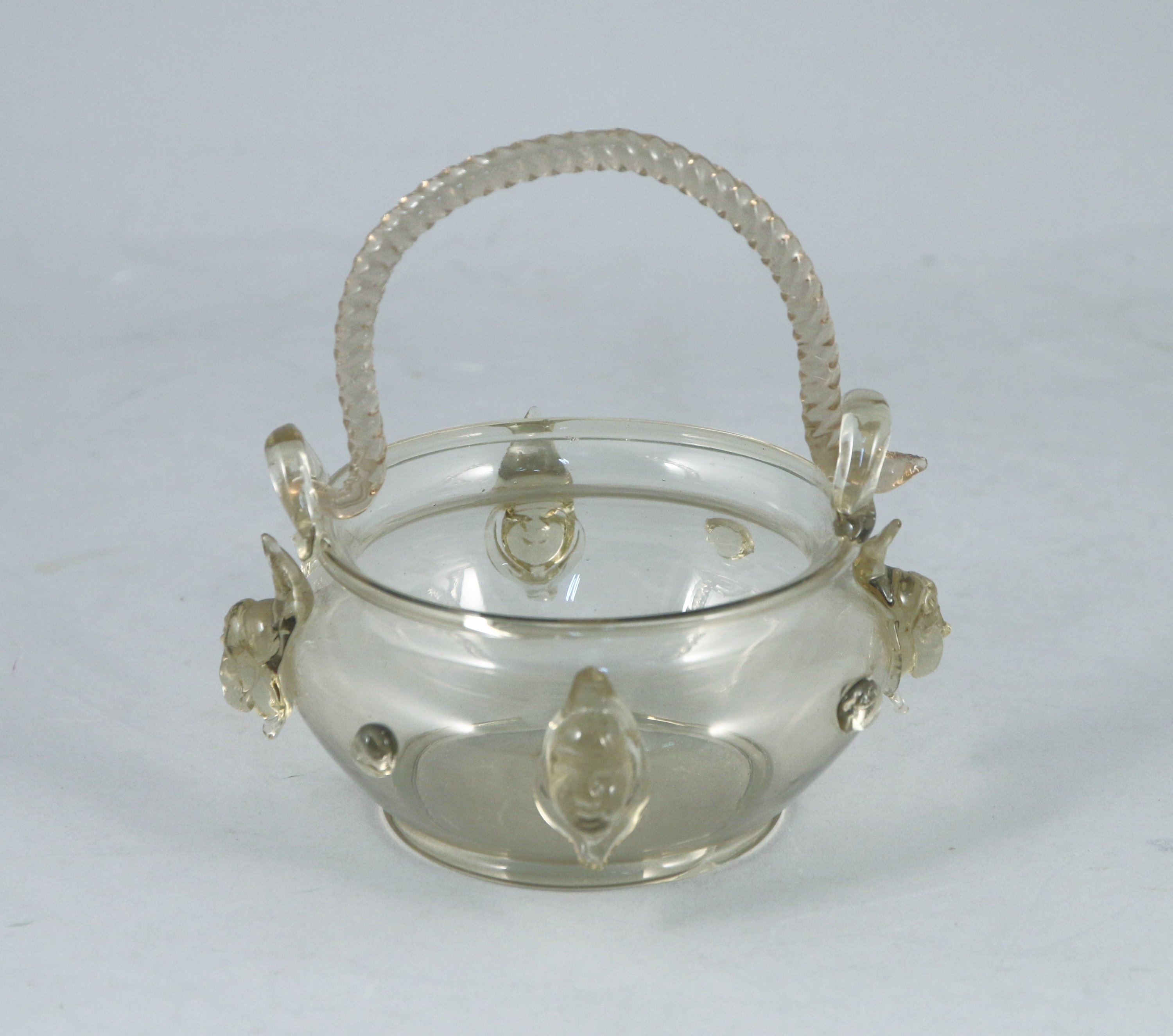 à décor de têtes de personnages saillantes. Anse torsadée mobile.
