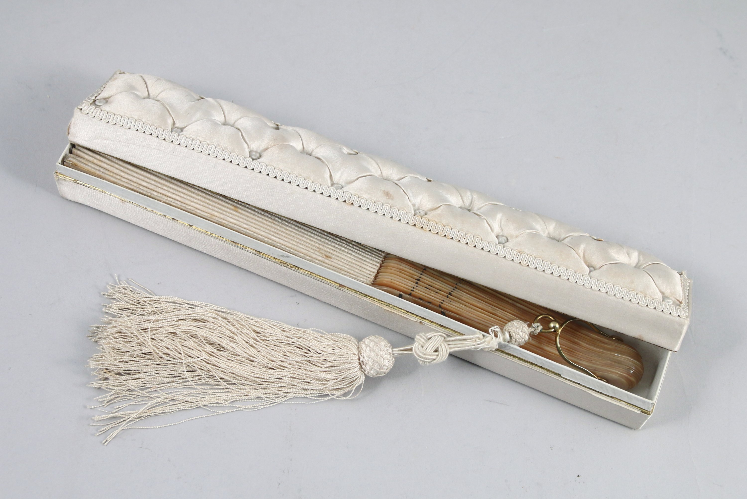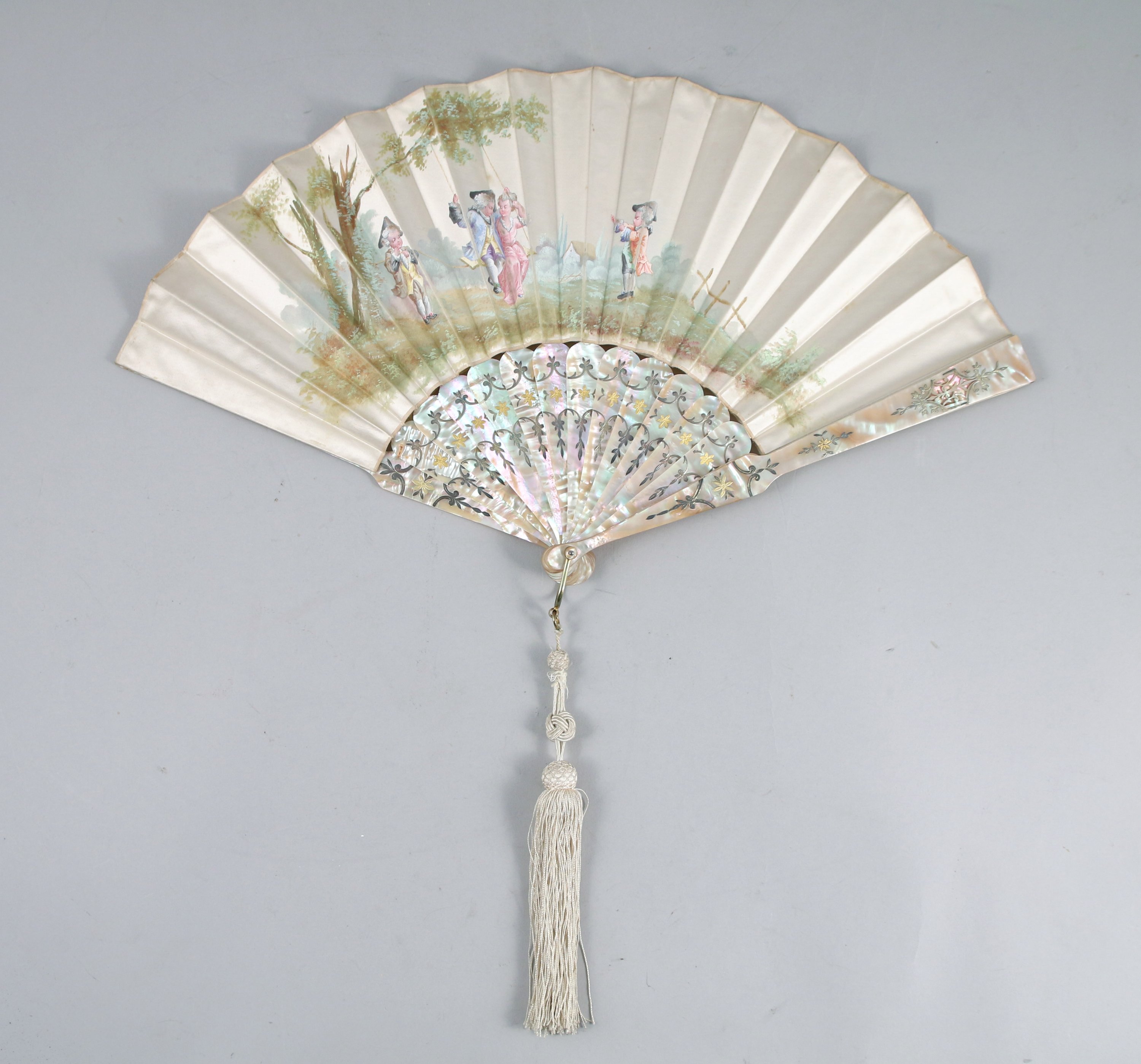 ÉVENTAIL plié. La feuille en soie imprimée d'une scène galante aux enfants dans un paysage champêtre. Monture en nacre à seize brins ajourés, peints et dorés, à décor de fleurettes inscrites dans des cartouches. Signé "Whoux.am"