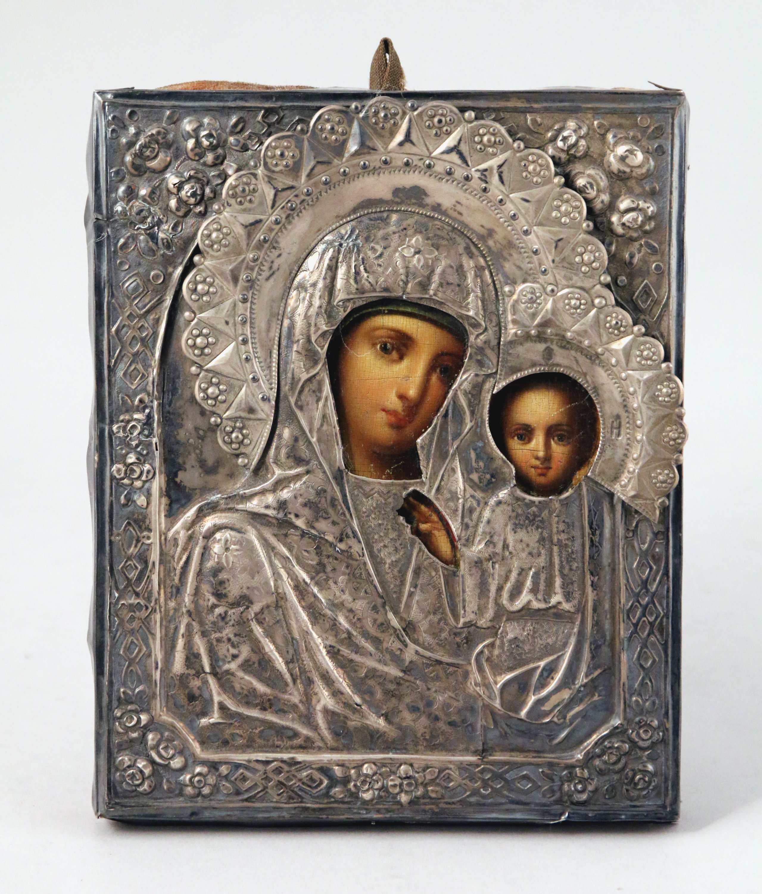ICONE DE LA TRES SAINTE MERE DE DIEU. Riza en argent. Poincons de Moscou, 1871, Essayeur B.C. - Victor Savinkov. Orfèvre A.B. non identifié Petits accidents et manques Russie, deuxième moitié du XIXème siècle