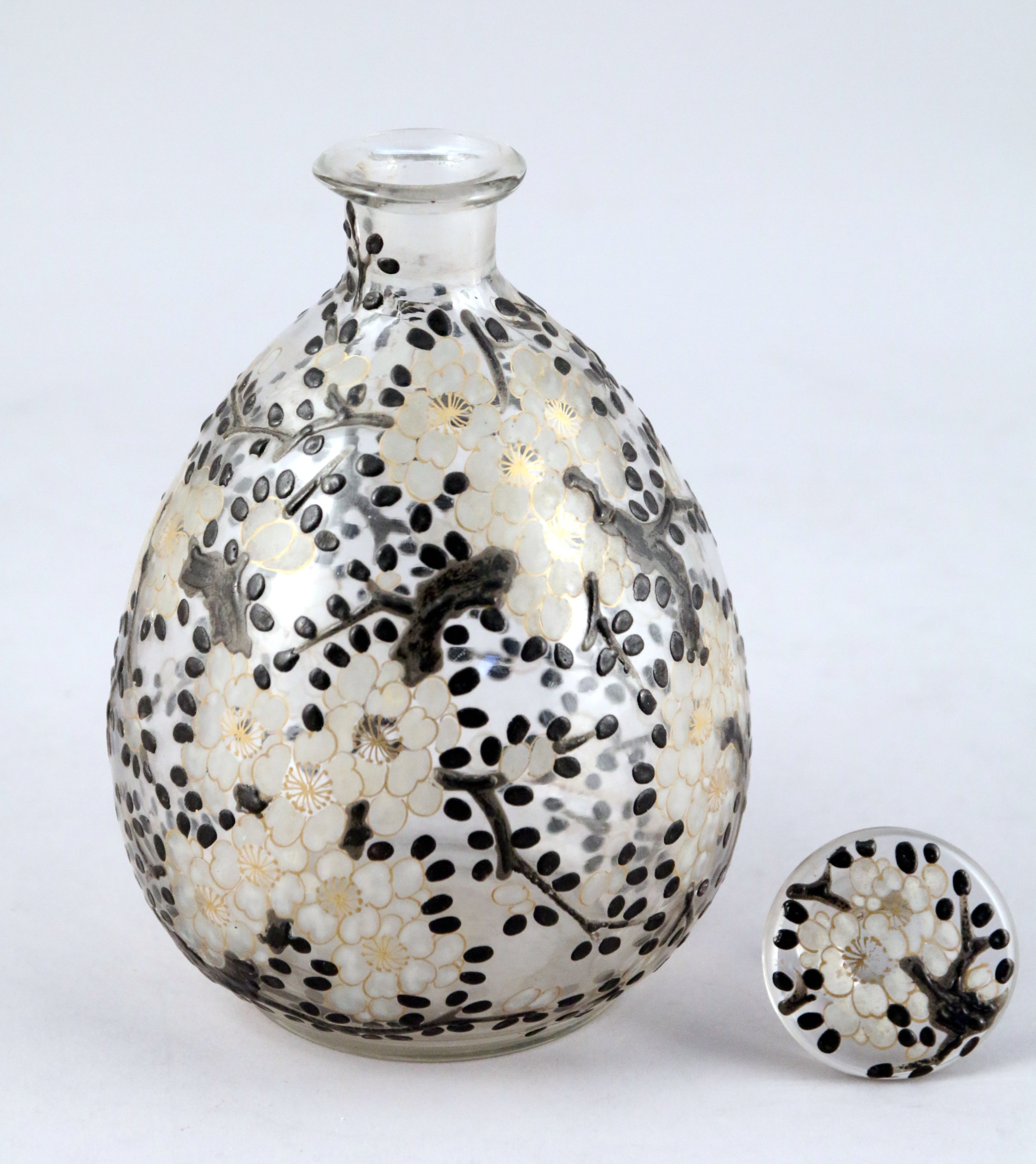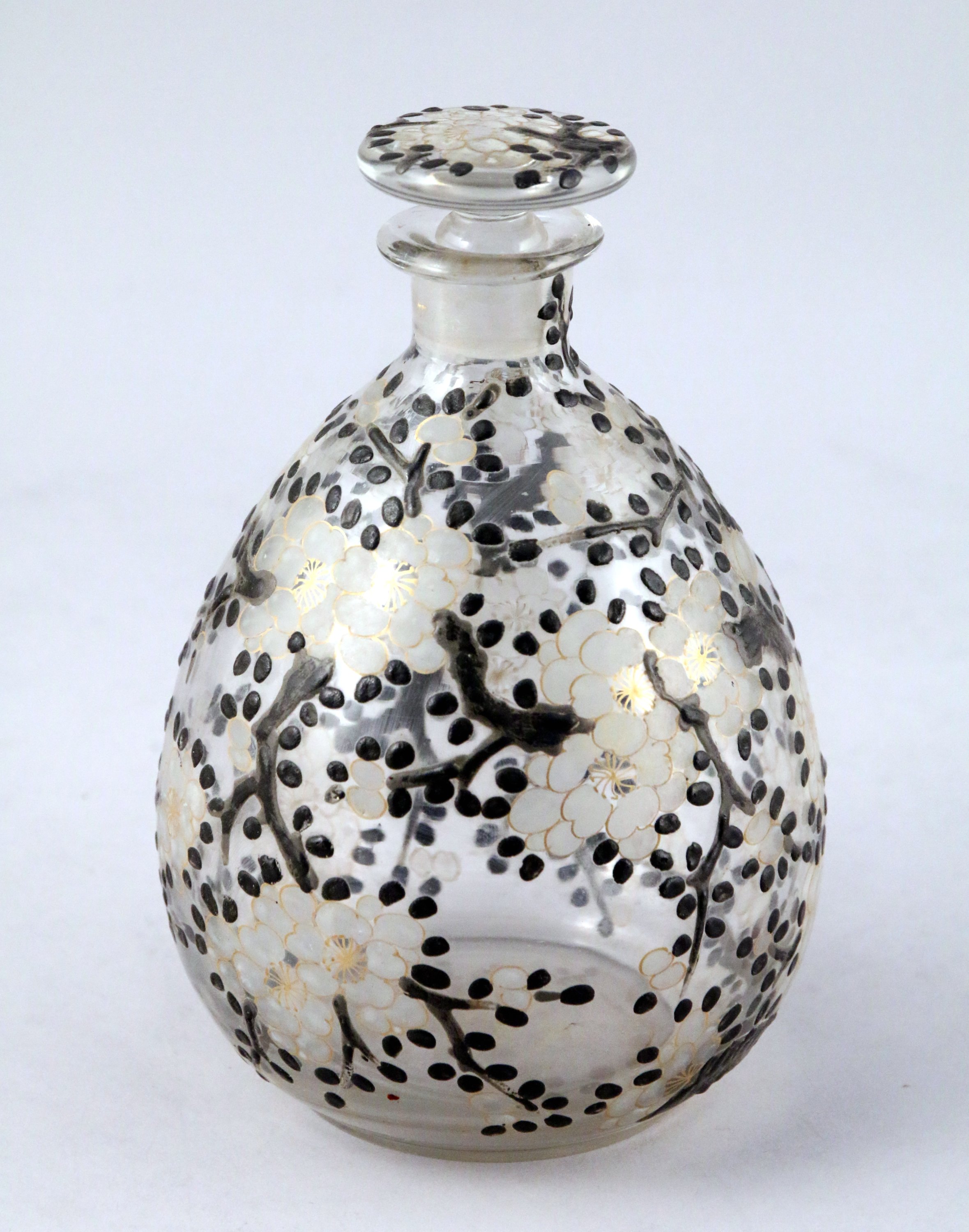 DELVAUX. FLACON en verre émaillé et peint à décor de cerisier en fleur.