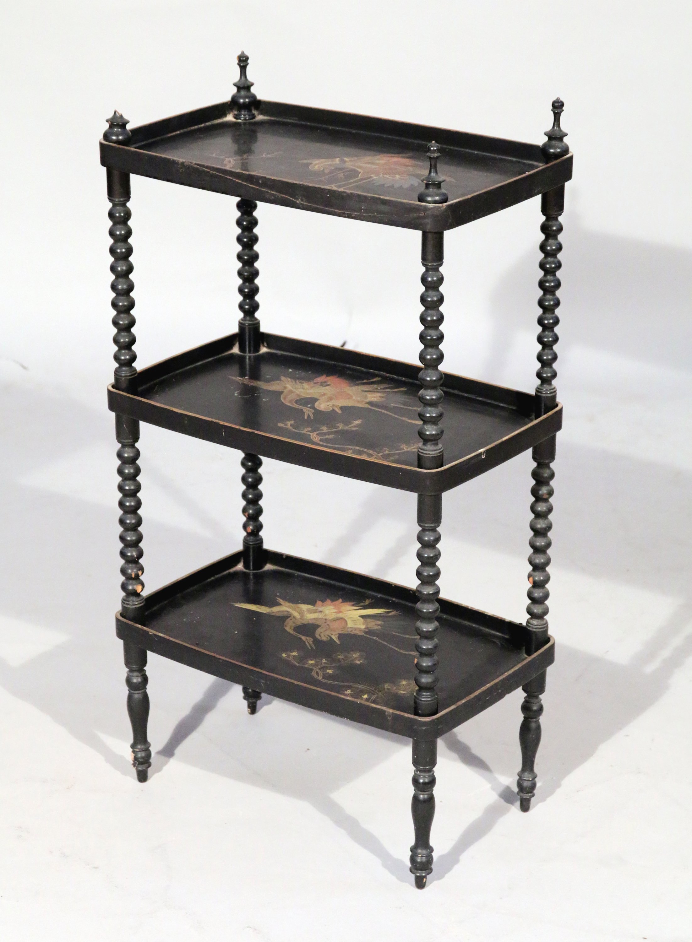 en bois noirci à trois plateaux en laque façon Japon à décor de grues. Montants en bois tournés.