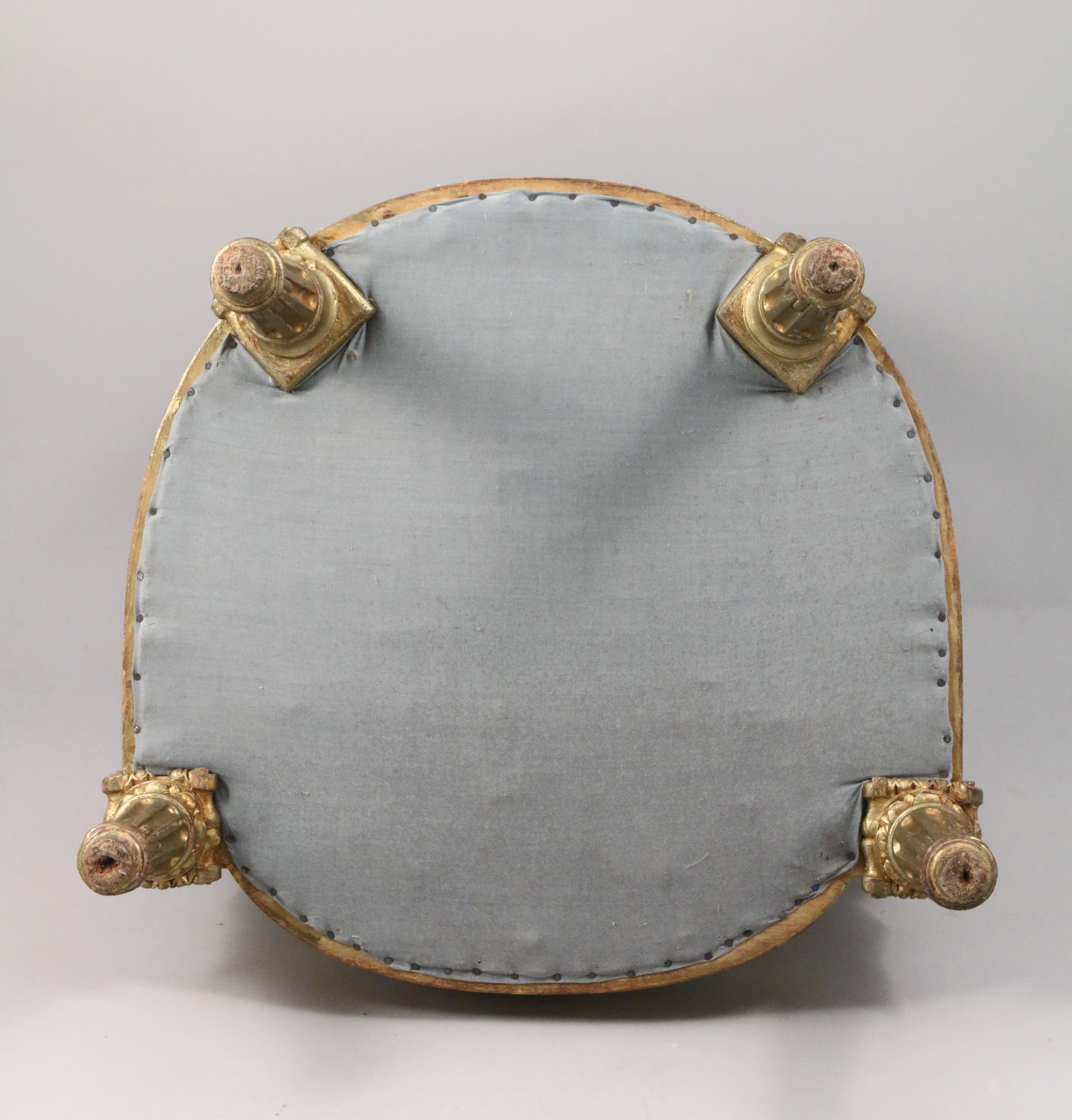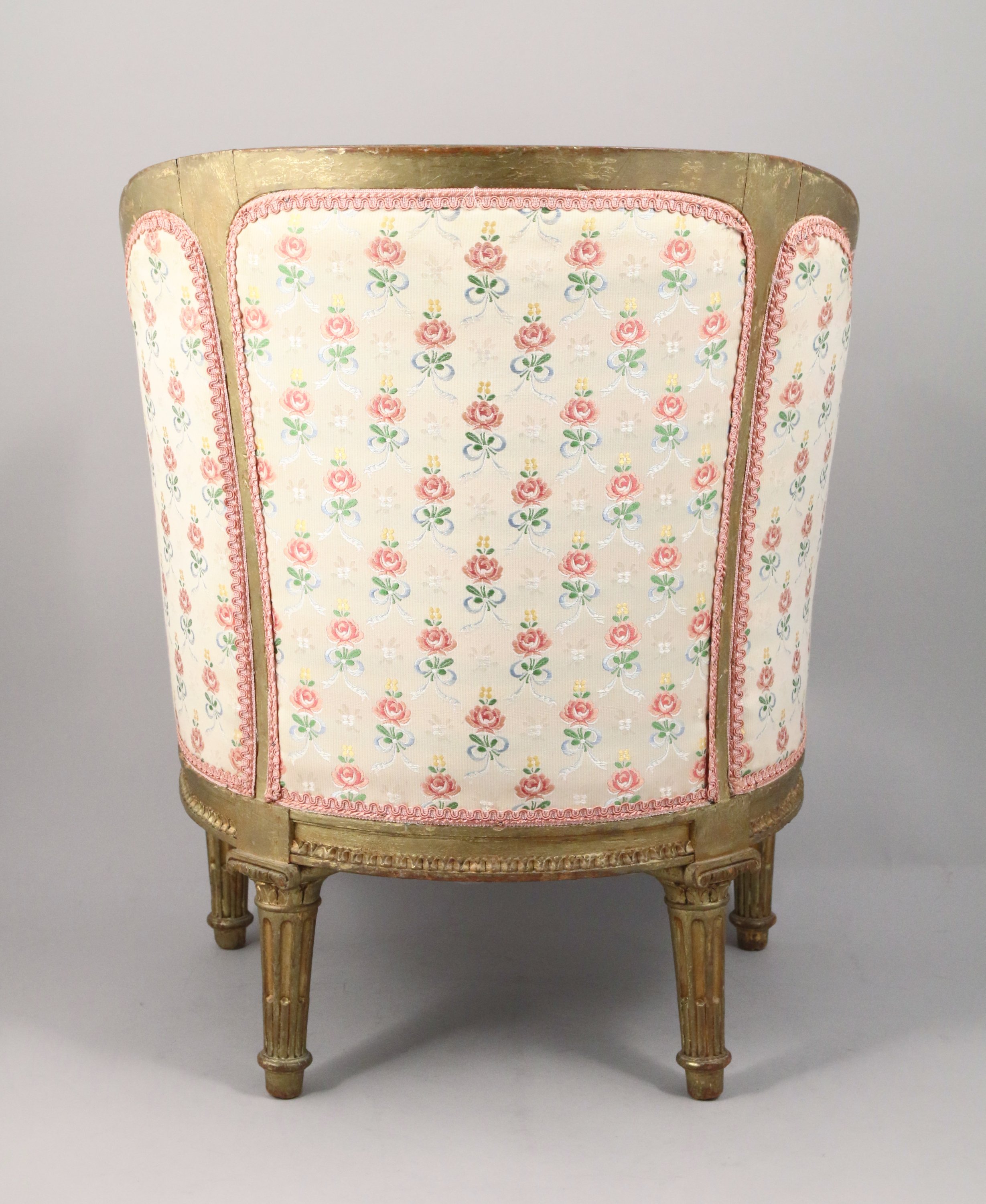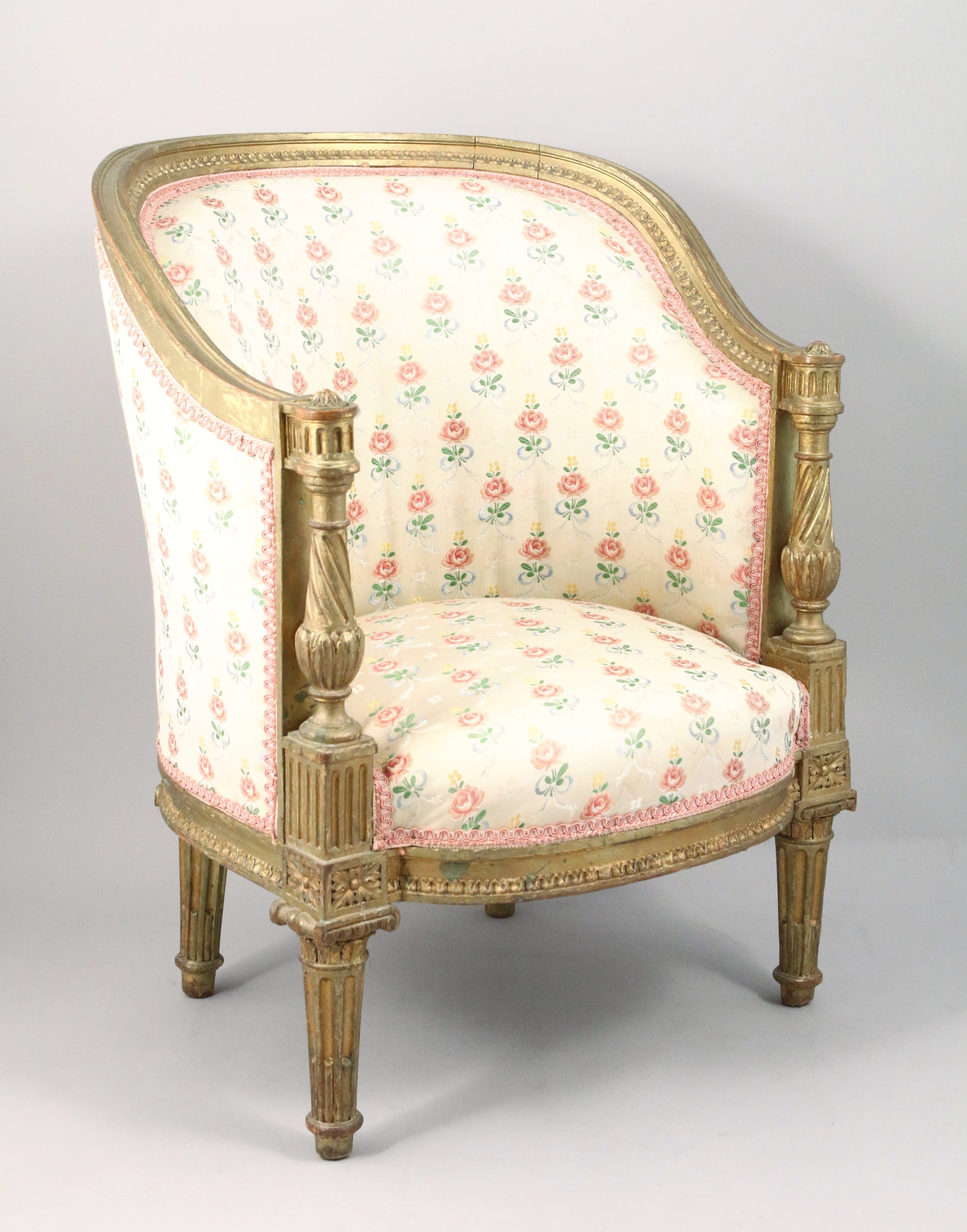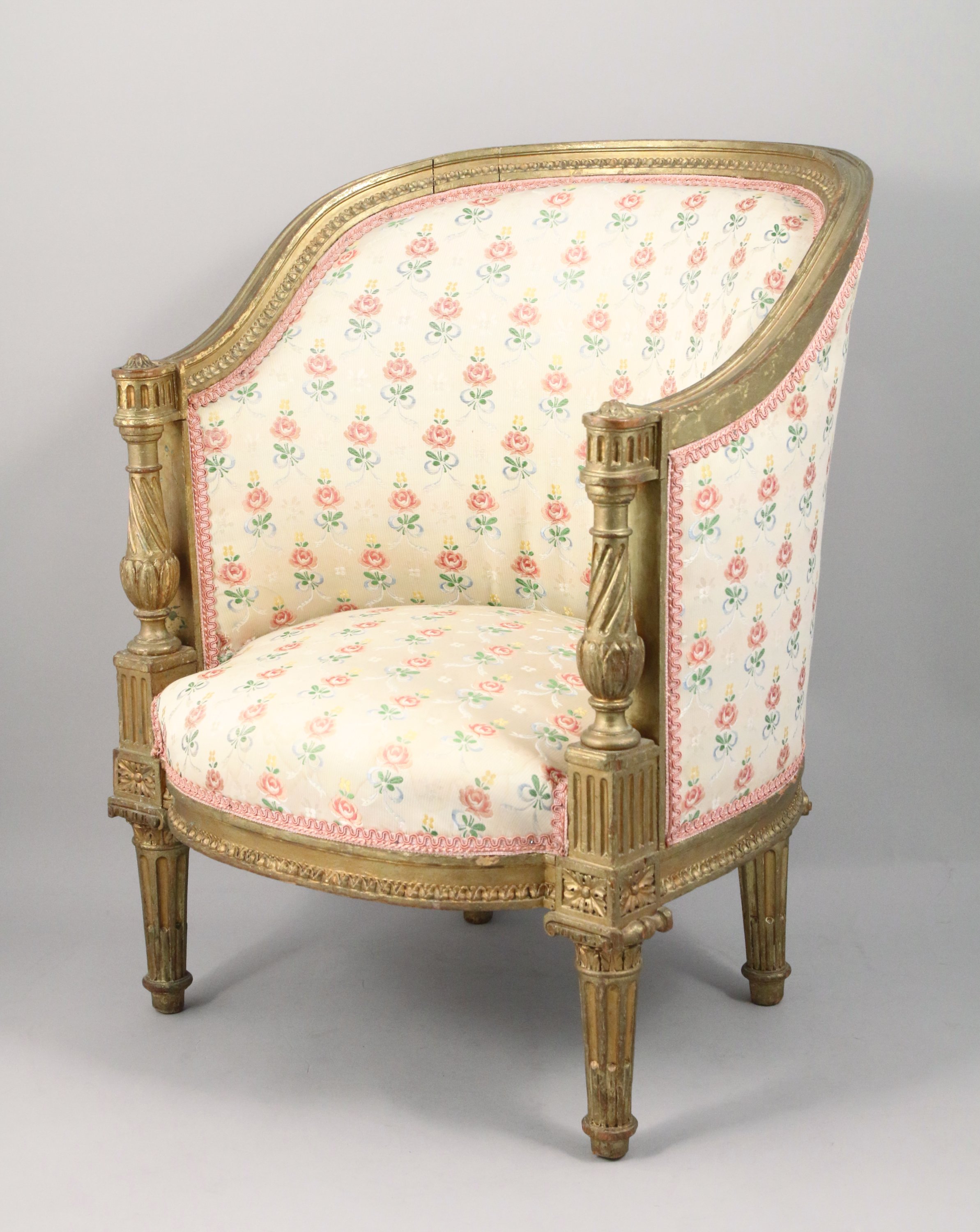 à décor d'une frise de fleurs de lotus, accotoirs formés par des colonnes saillantes à motifs torsadés et d'un bouquet de feuilles, quatre pieds fuselés et rudenté, dés de raccordement à décor d'une rosace. Garniture de tissus à motif de roses et nuds de rubans sur fond crème.