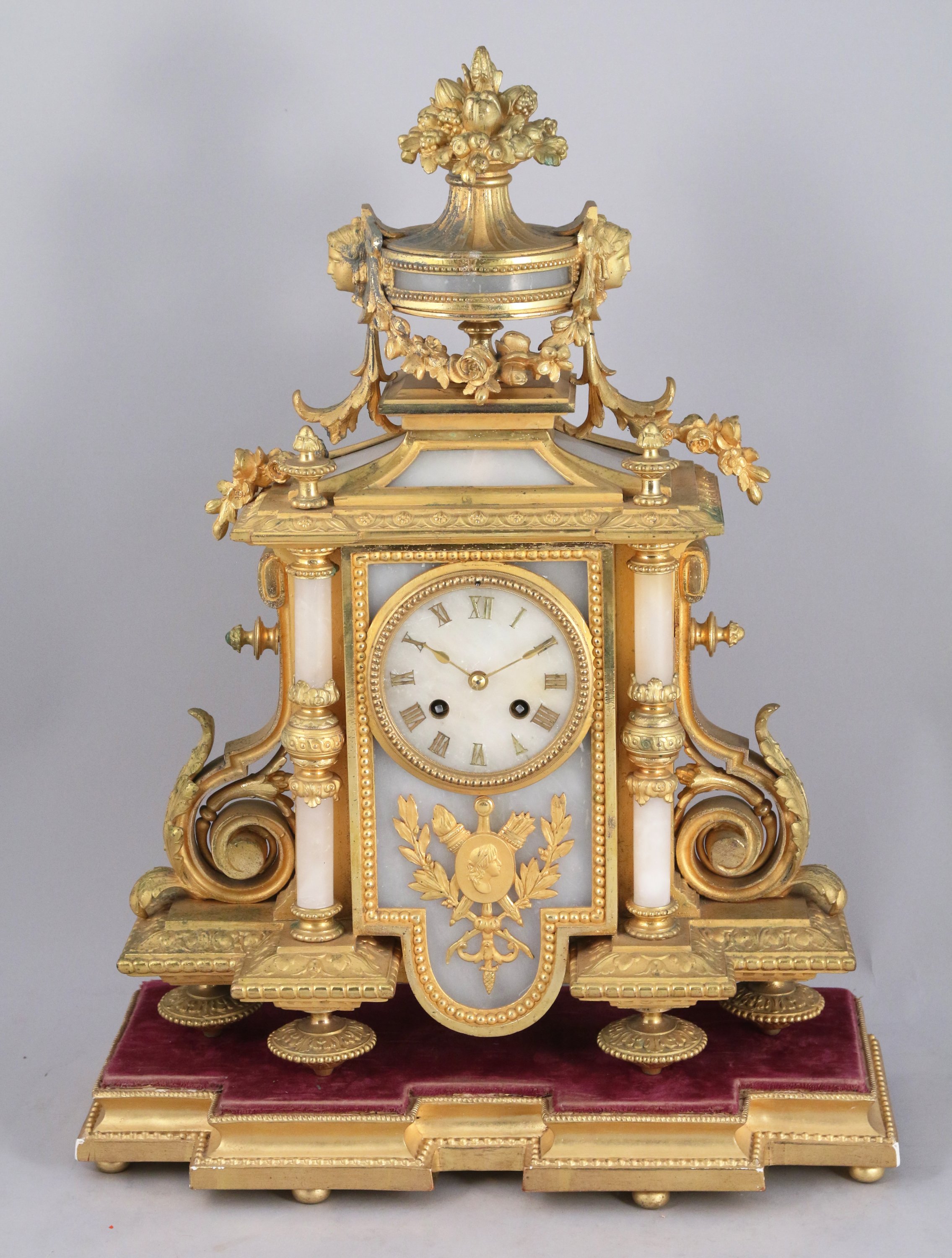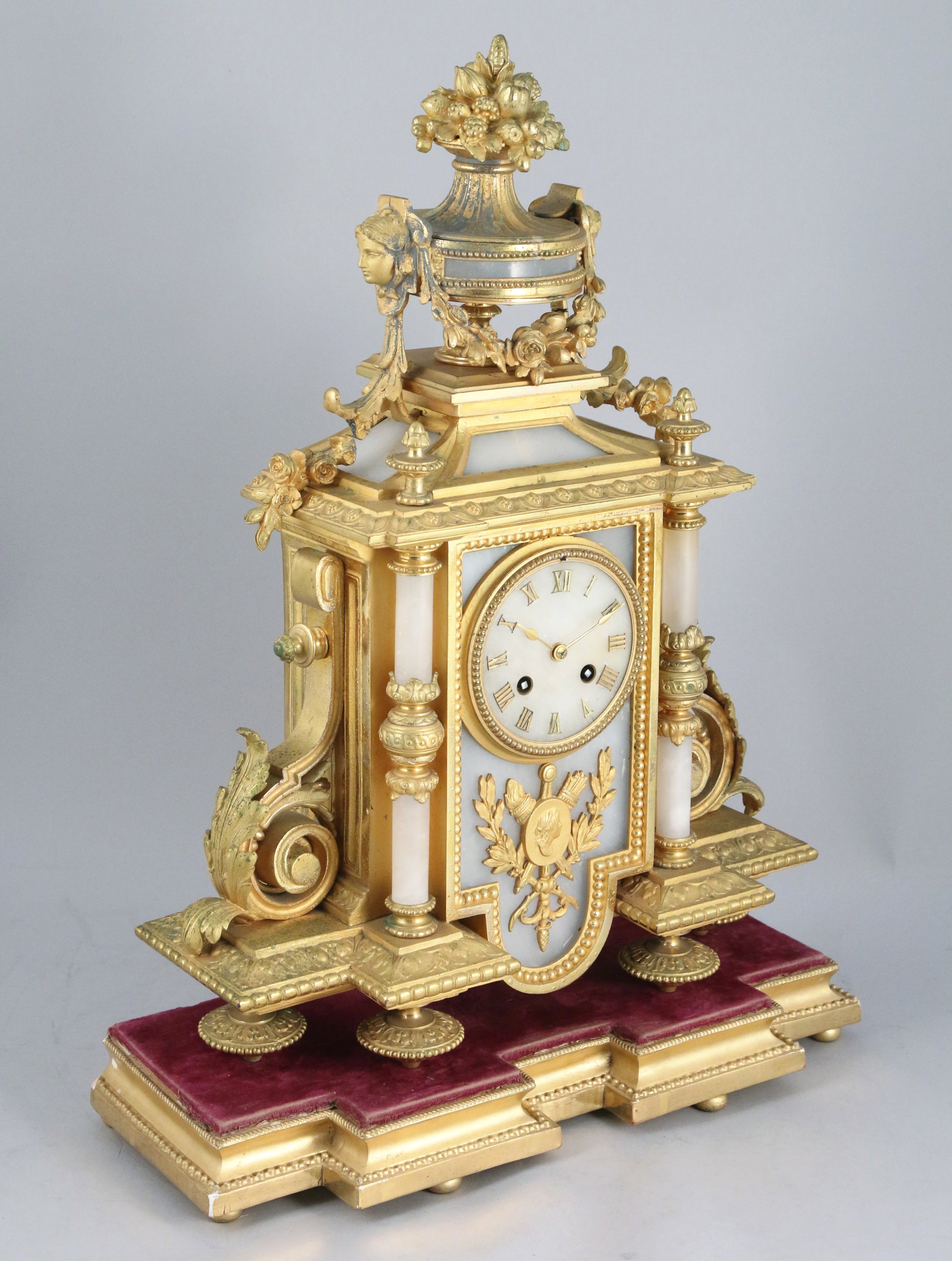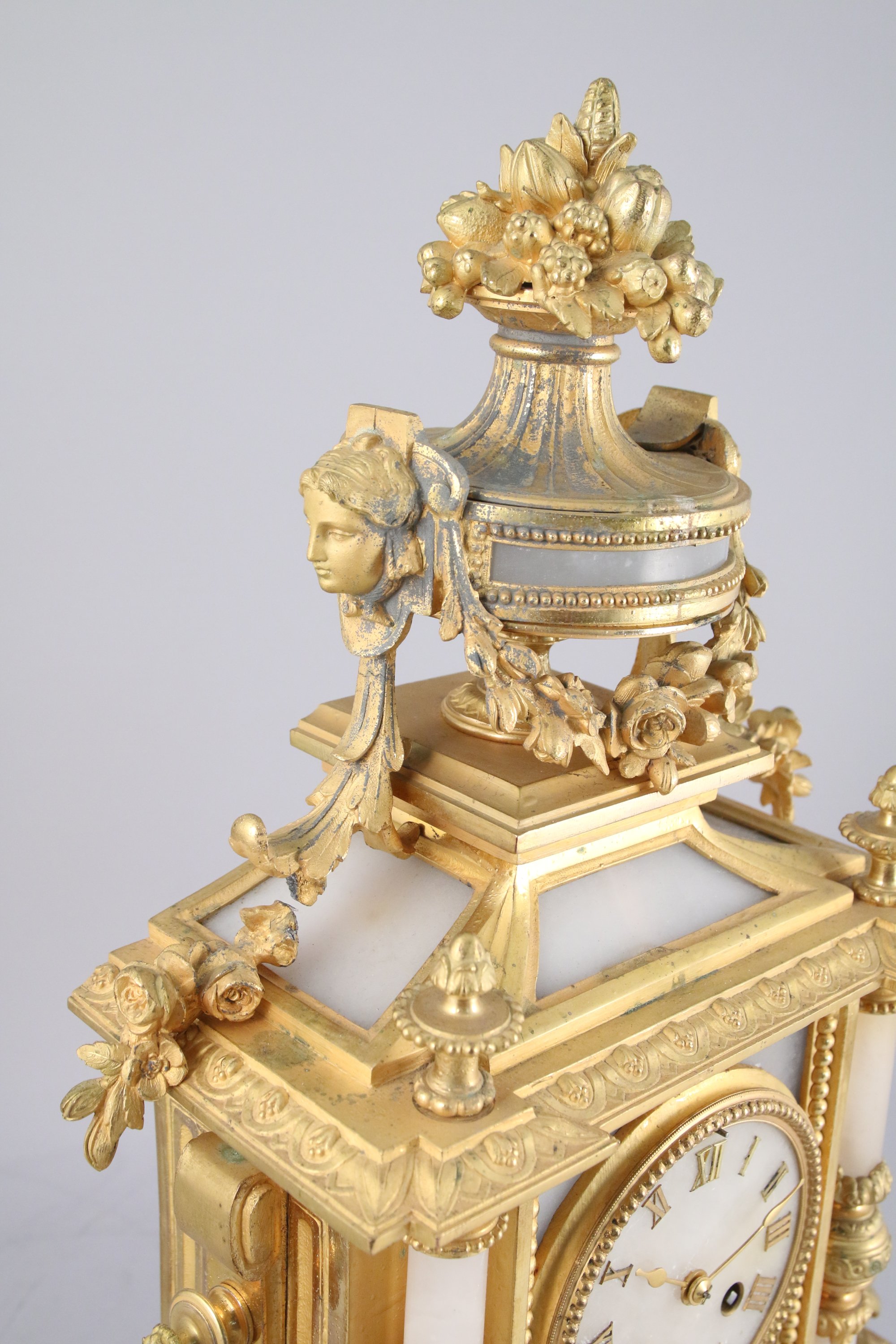en bronze doré et ciselé et albâtre. Elle se compose d'une pendule borne et de deux candélabres à cinq lumières. Avec ses globes en verre et ses socles. Accompagnée de sa clé et de son balancier. Signée au revers de la pendule PH. MOUREY. 68.