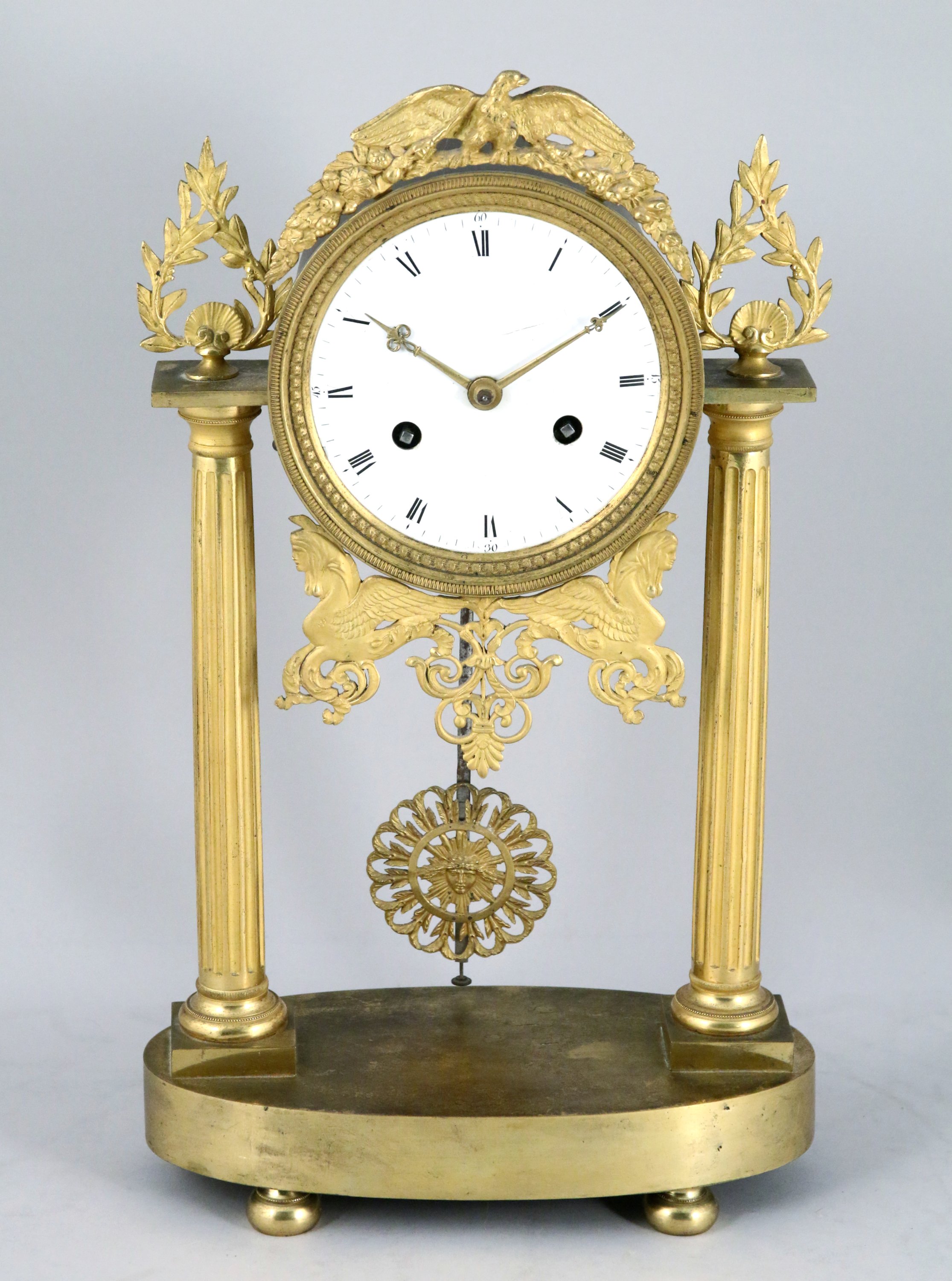 coiffée d'un aigle aux ailes déployées tenant entre ses serres une guirlande fleurie. Deux branches affrontées de laurier reposant sur une coquille Saint-Jacques entourent le cadran circulaire soutenu par deux colonnes doriques cannelées supportées par une base ovale se terminant par quatre pieds boules. Deux sphinges séparées par des enroulements se terminant par une palmette ornent la partie centrale. Le balancier à décor de tête dans un soleil rayonnant entouré de motifs végétaux. Le cadran émaillé indiquant les heures en chiffres romains, les minutes par un chemin de fer.