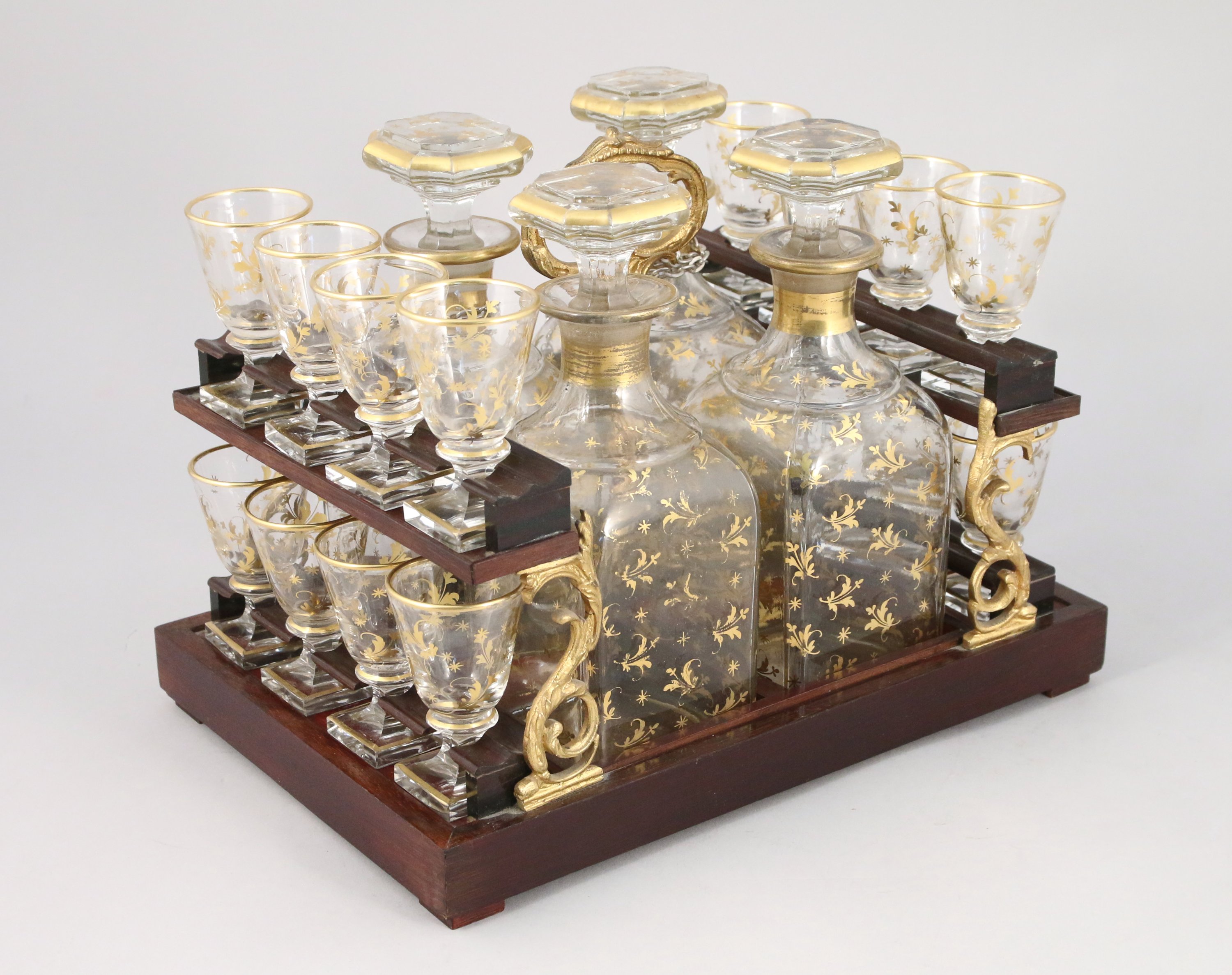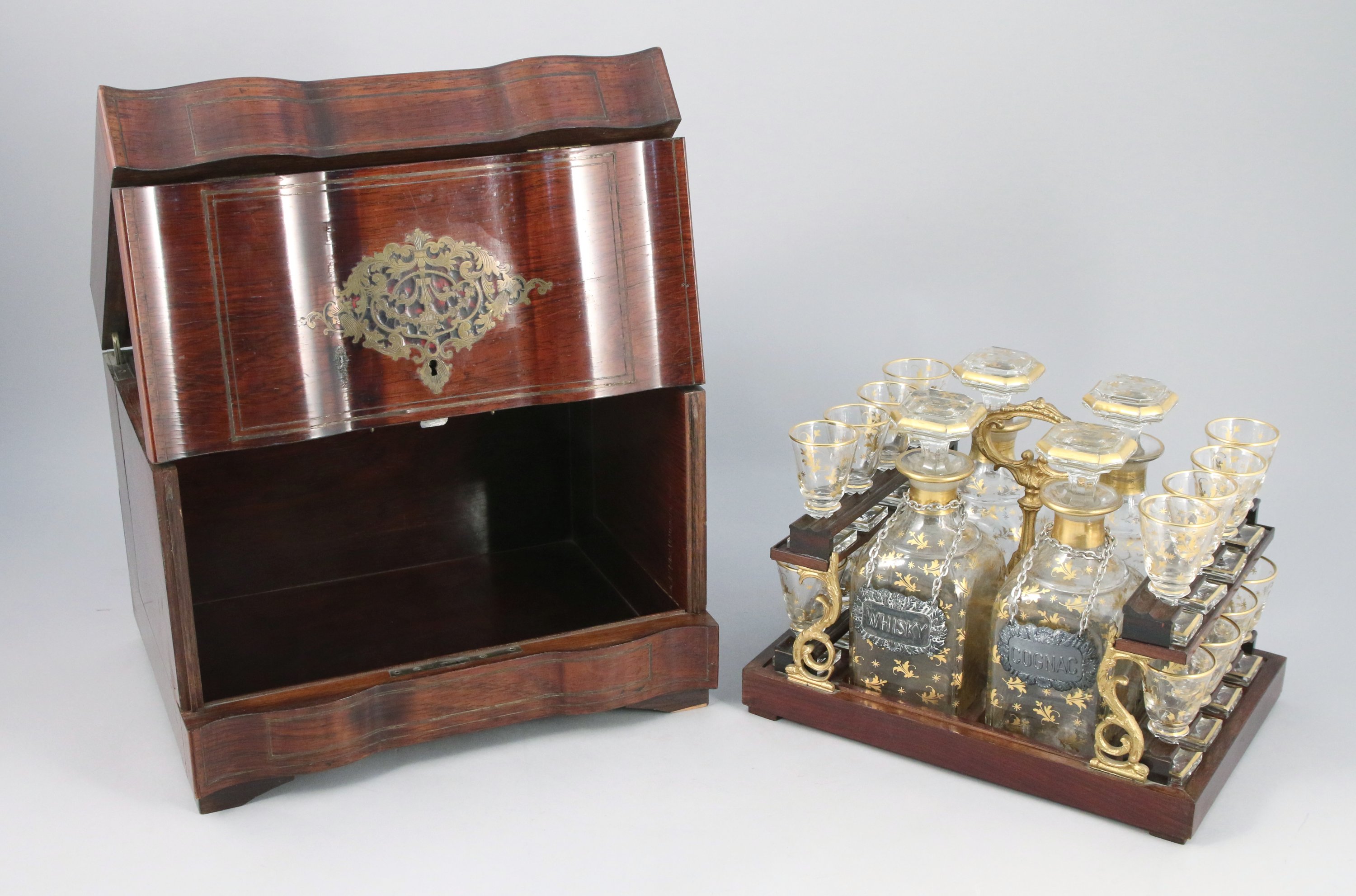 à la façade mouvementée en placage d'acajou, filets de laiton et marqueterie dite Boulle. L'intérieur découvrant seize verres et quatre carafes en cristal.