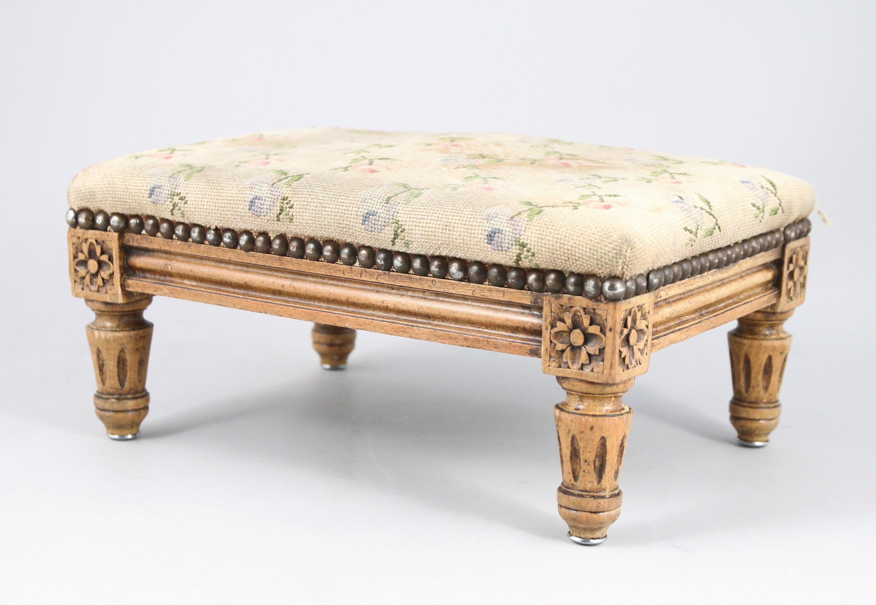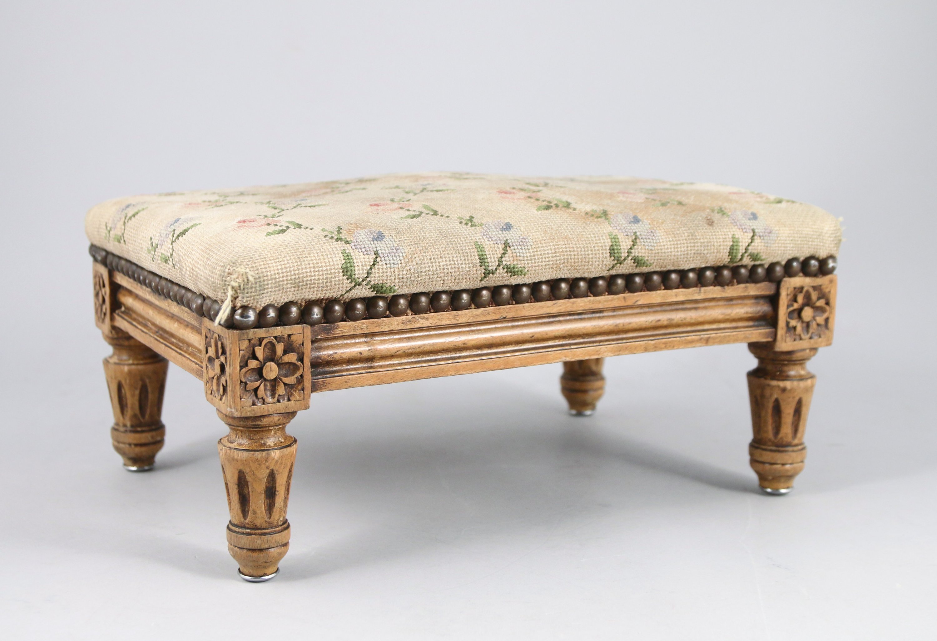 les dès de raccordement à fleurette, les pieds cannelés et fuselés. Recouvert d'une tapisserie aux petits-points.